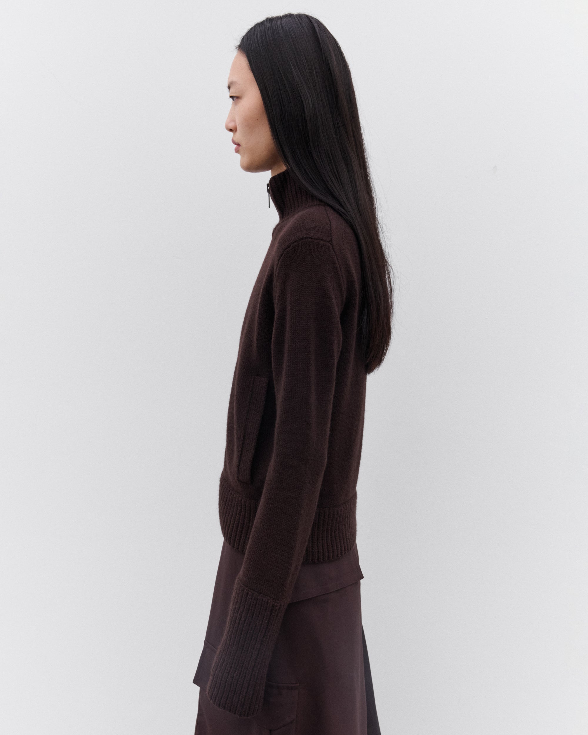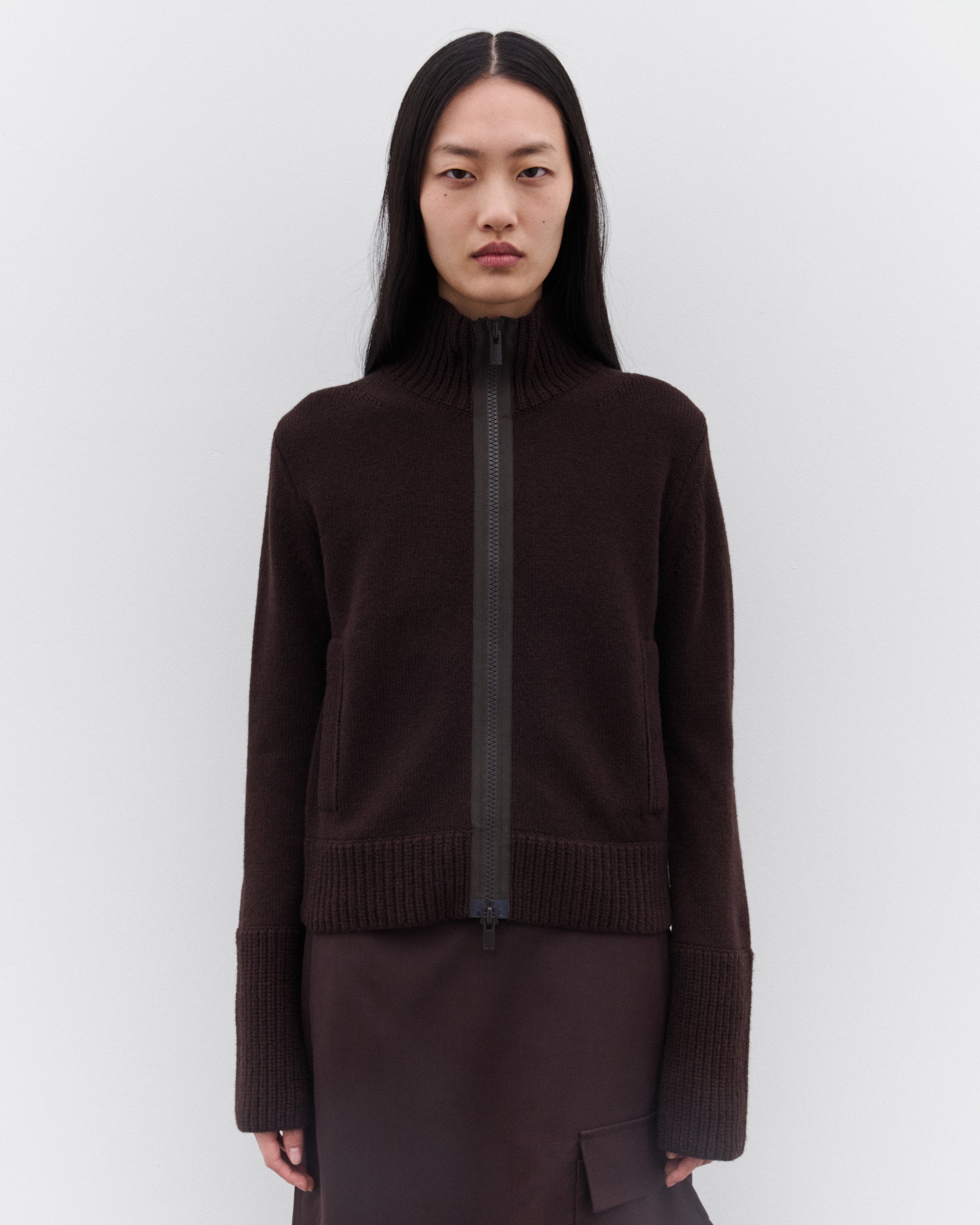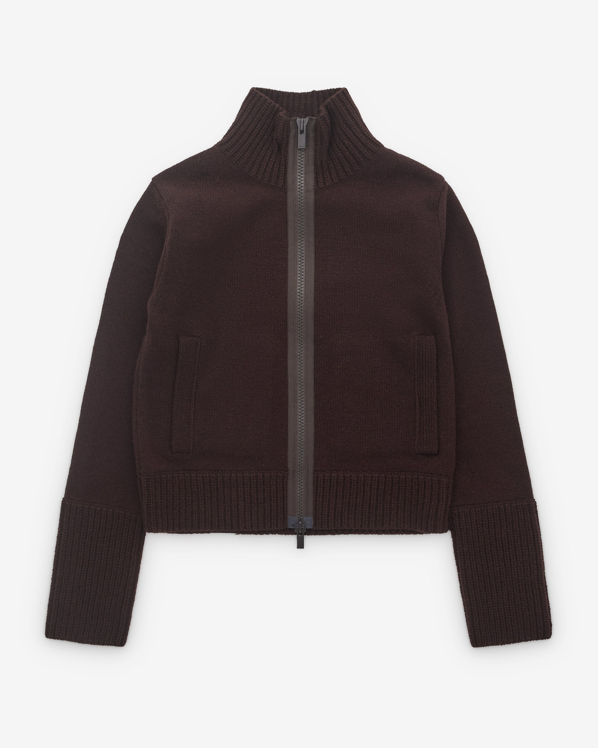 Funnel neckTwo-way zip fasteningSide welt pocketsCropped fitHeavy gauge knitExtended cuffsRib knit trims