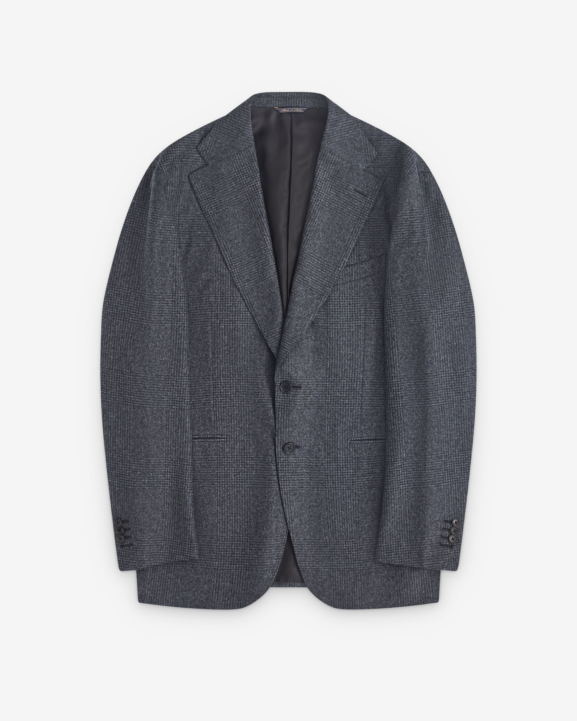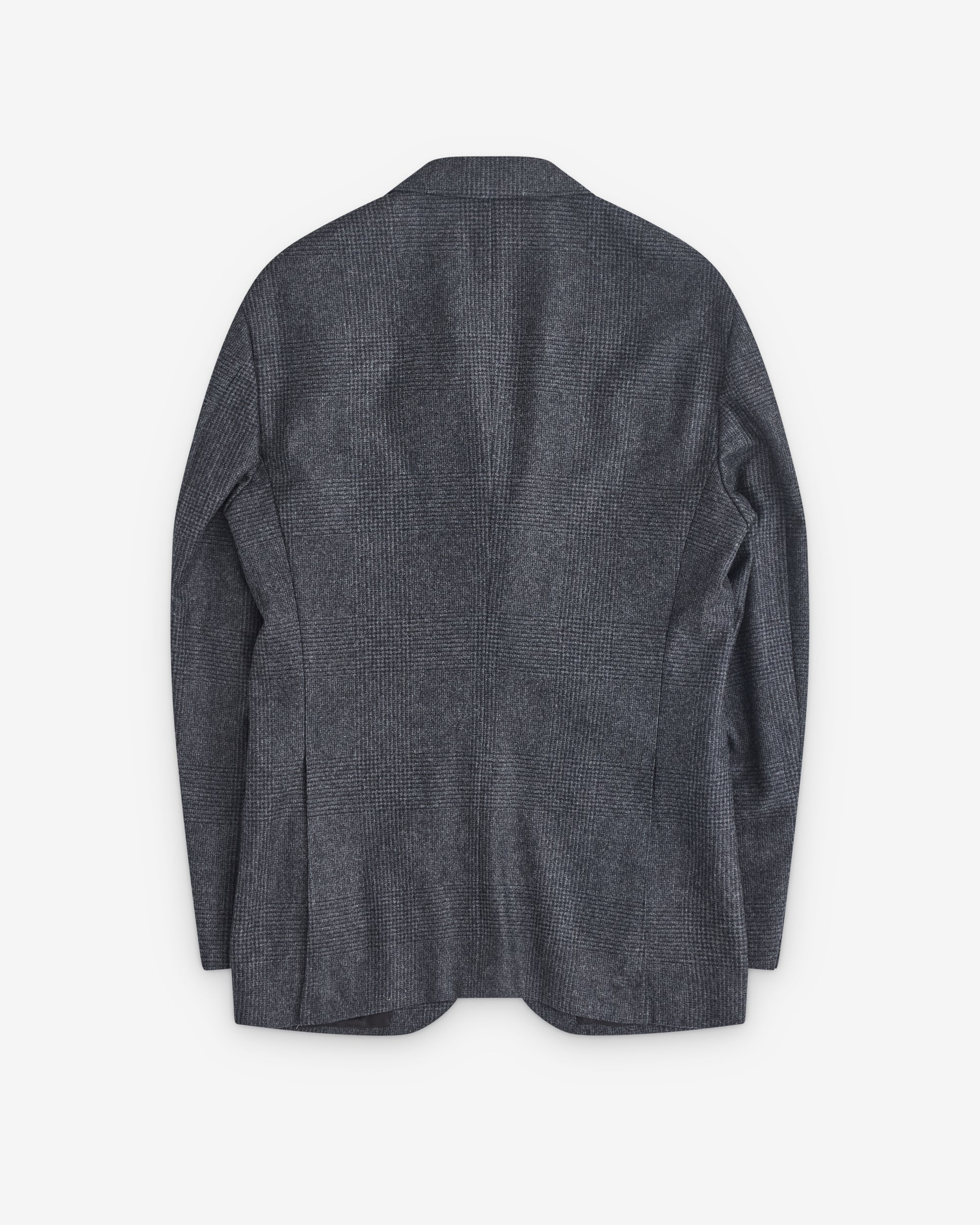 Single breasted collarFront button closureFront slip pocketsInternal liningFlap rear ventTailored fitCheck wool fabric