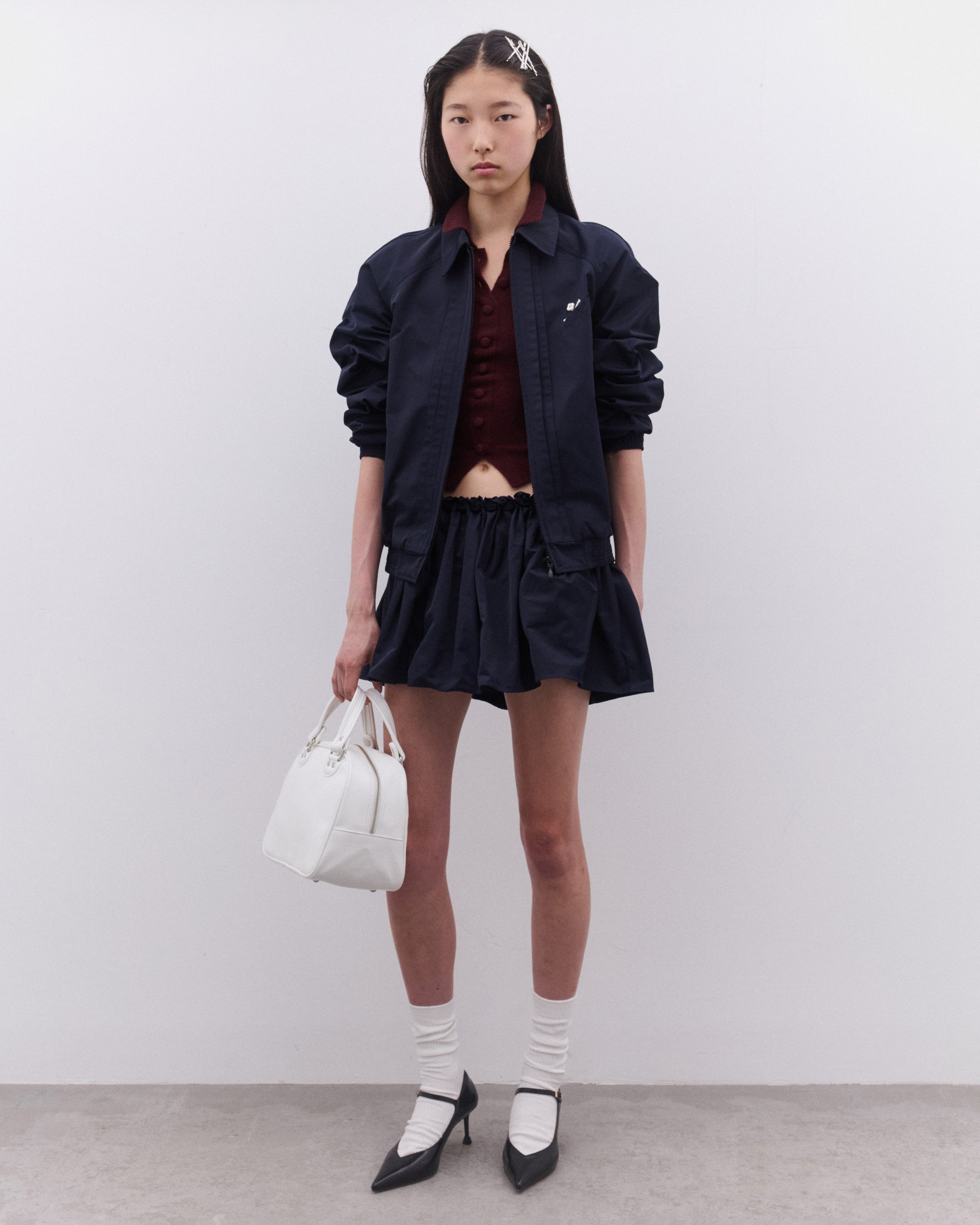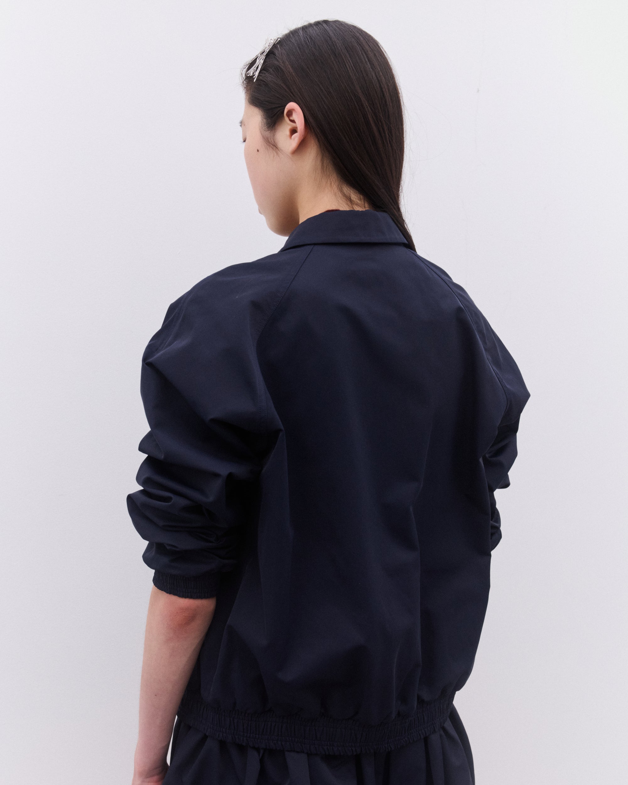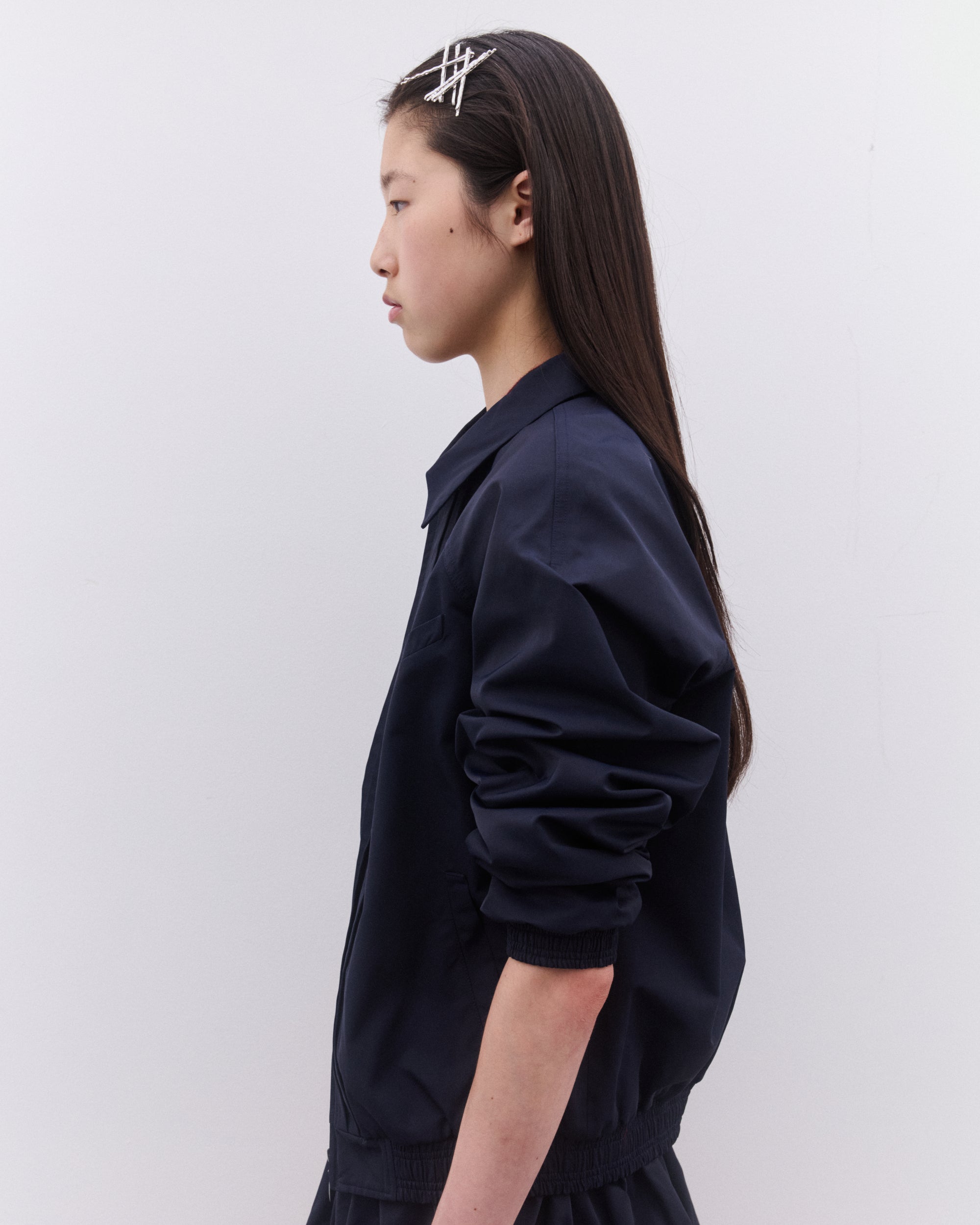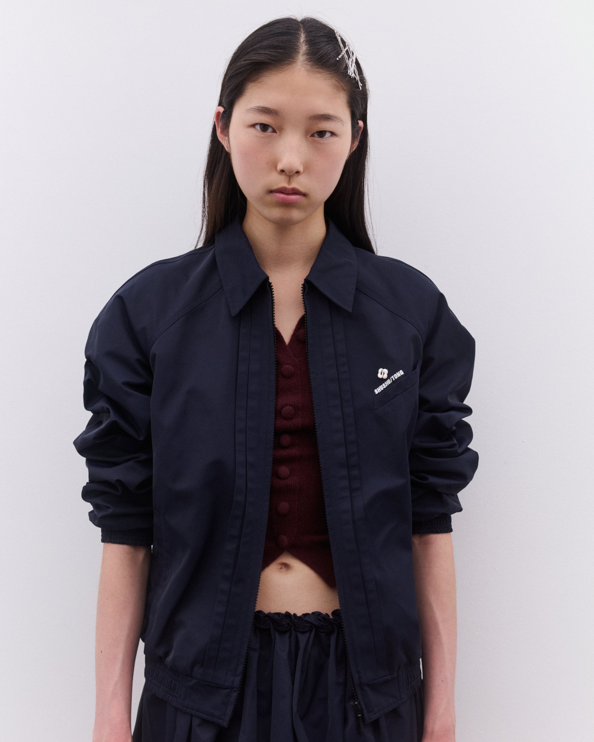 Classic jacket collarFront zip closureTuck fabric detail at frontPatch logo at chestRibbed cuffs and hem