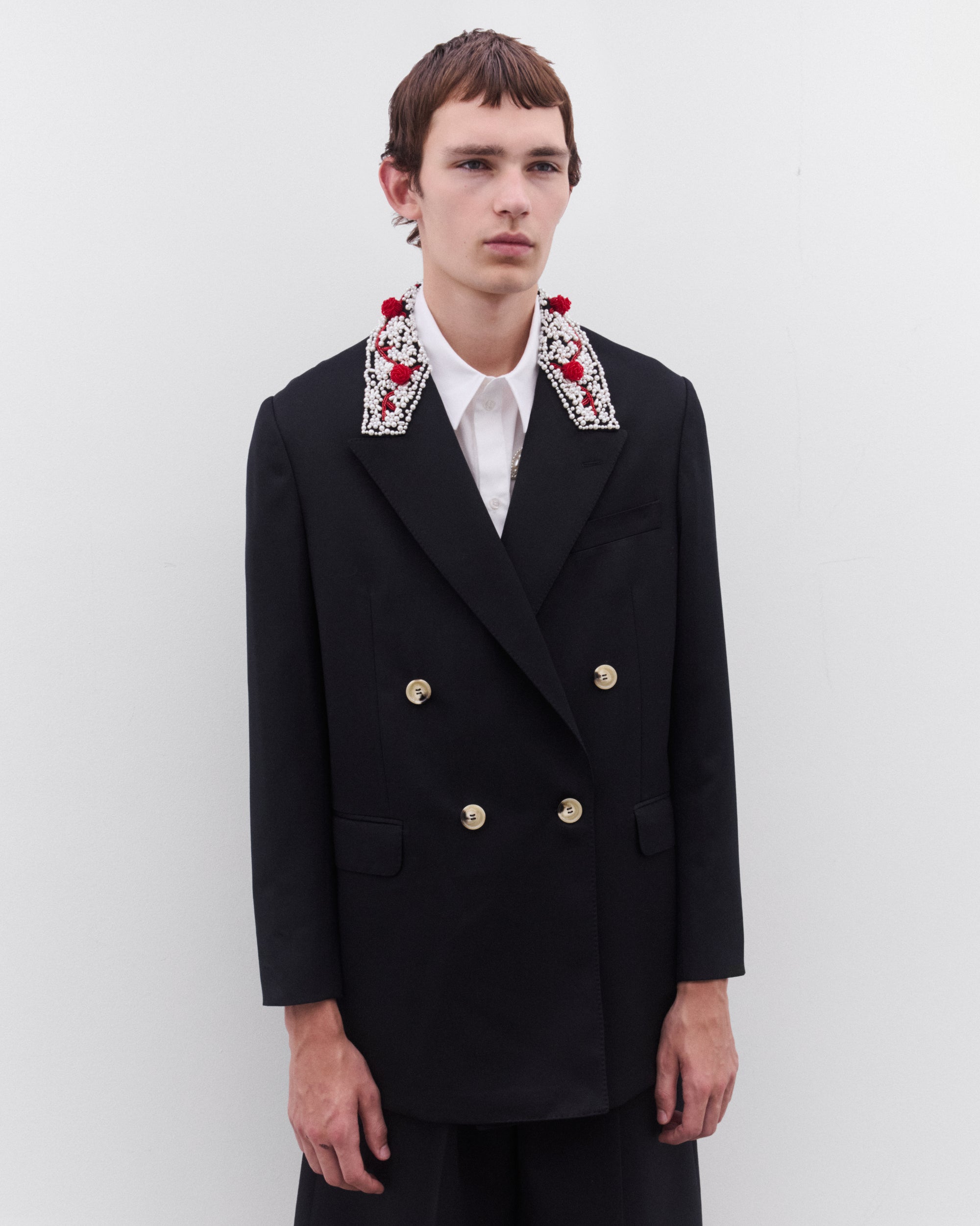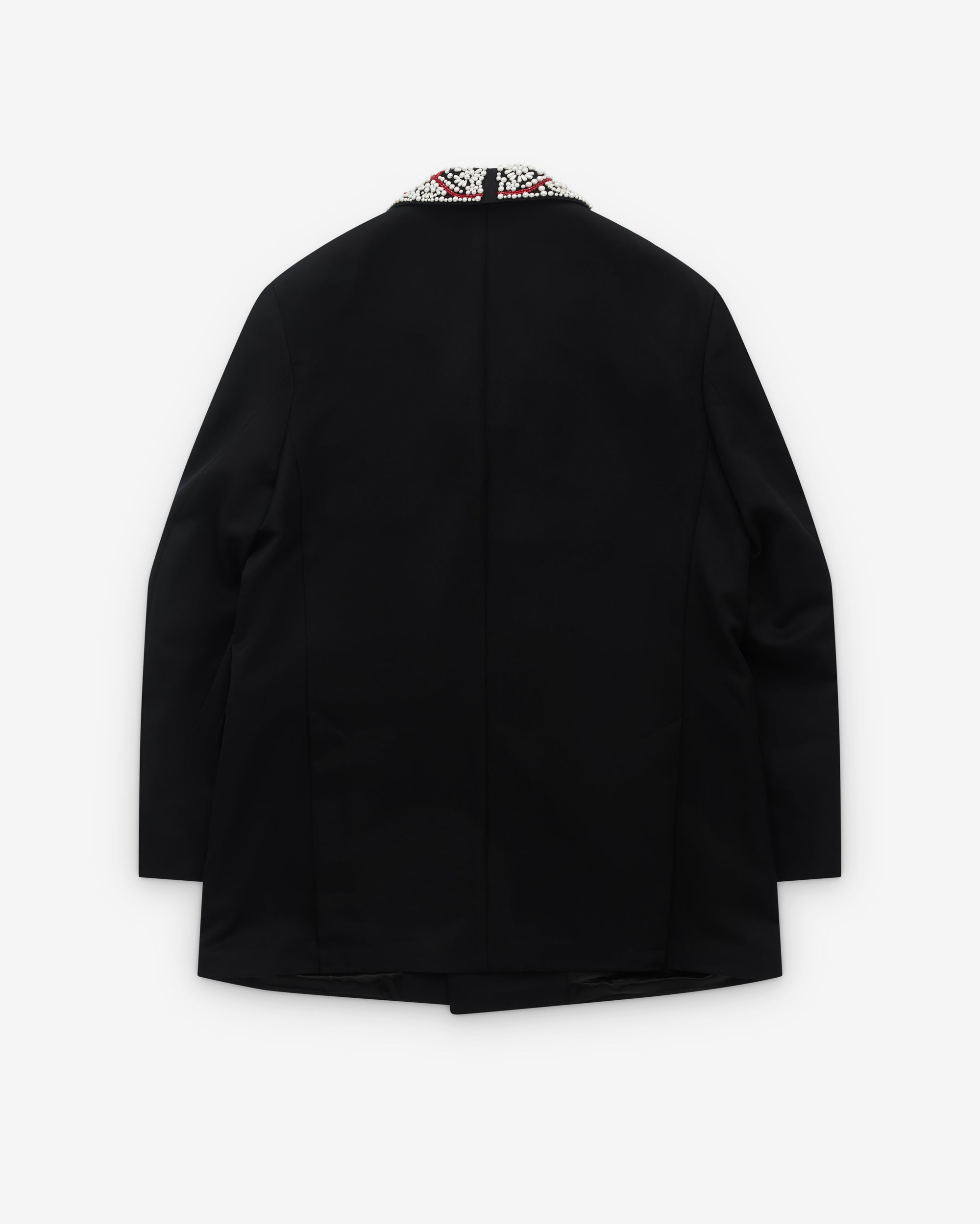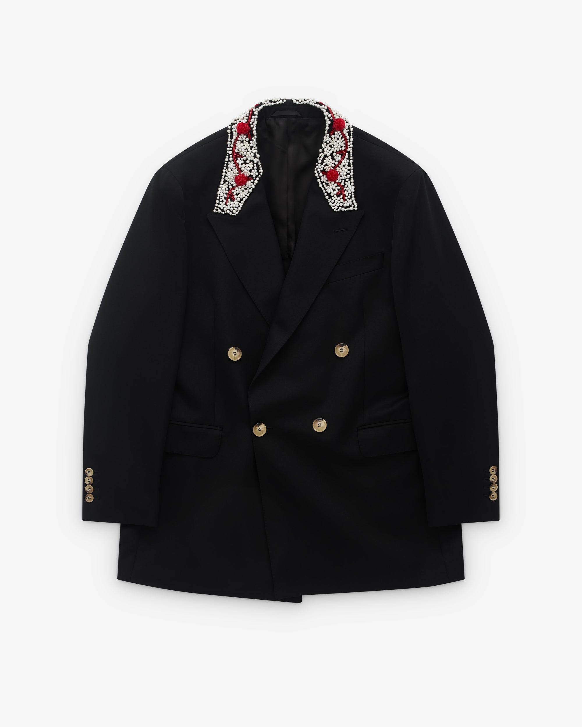 Signature daisy pearl on backSignature embellishmentDouble-breasted button closureRelaxed fit
