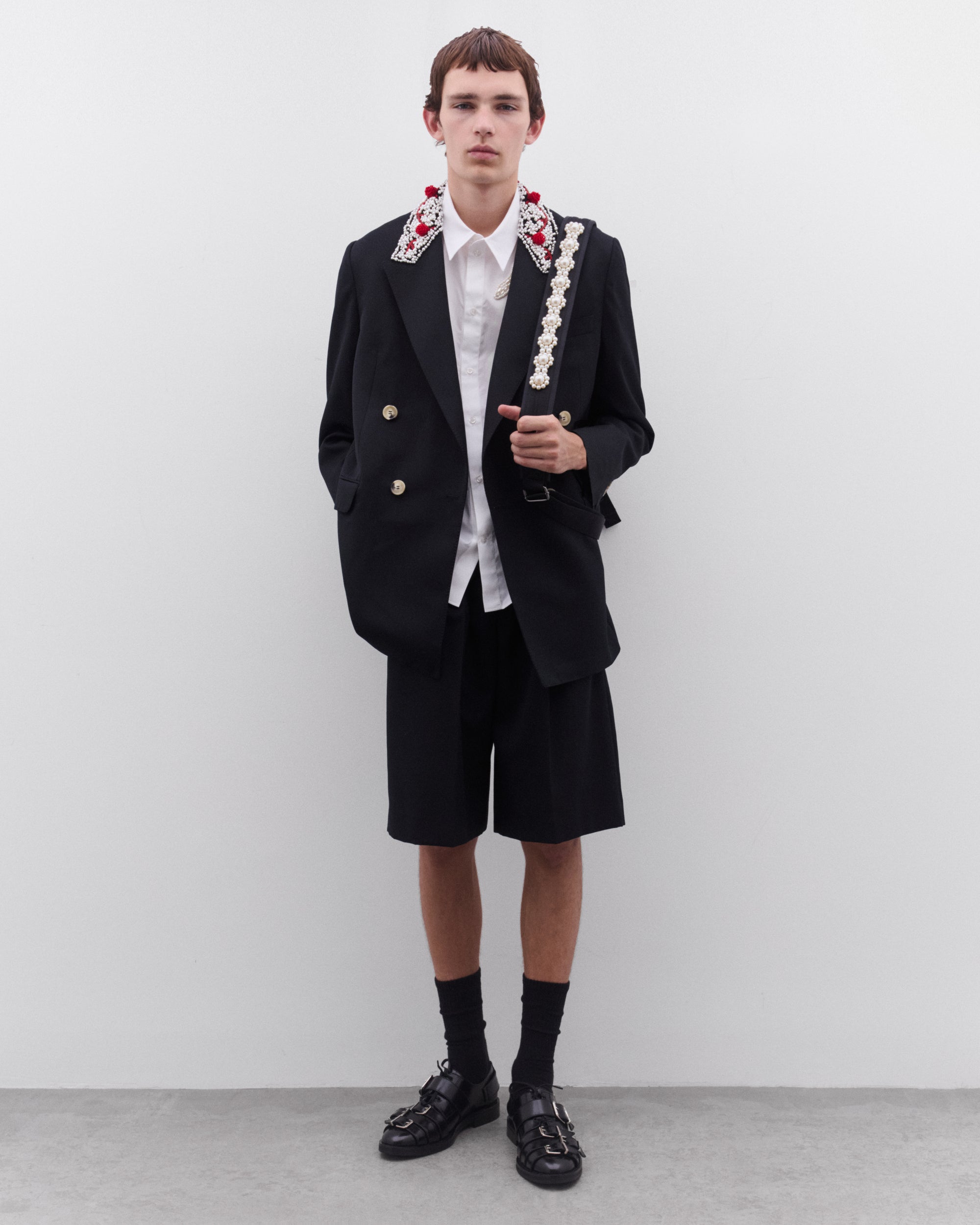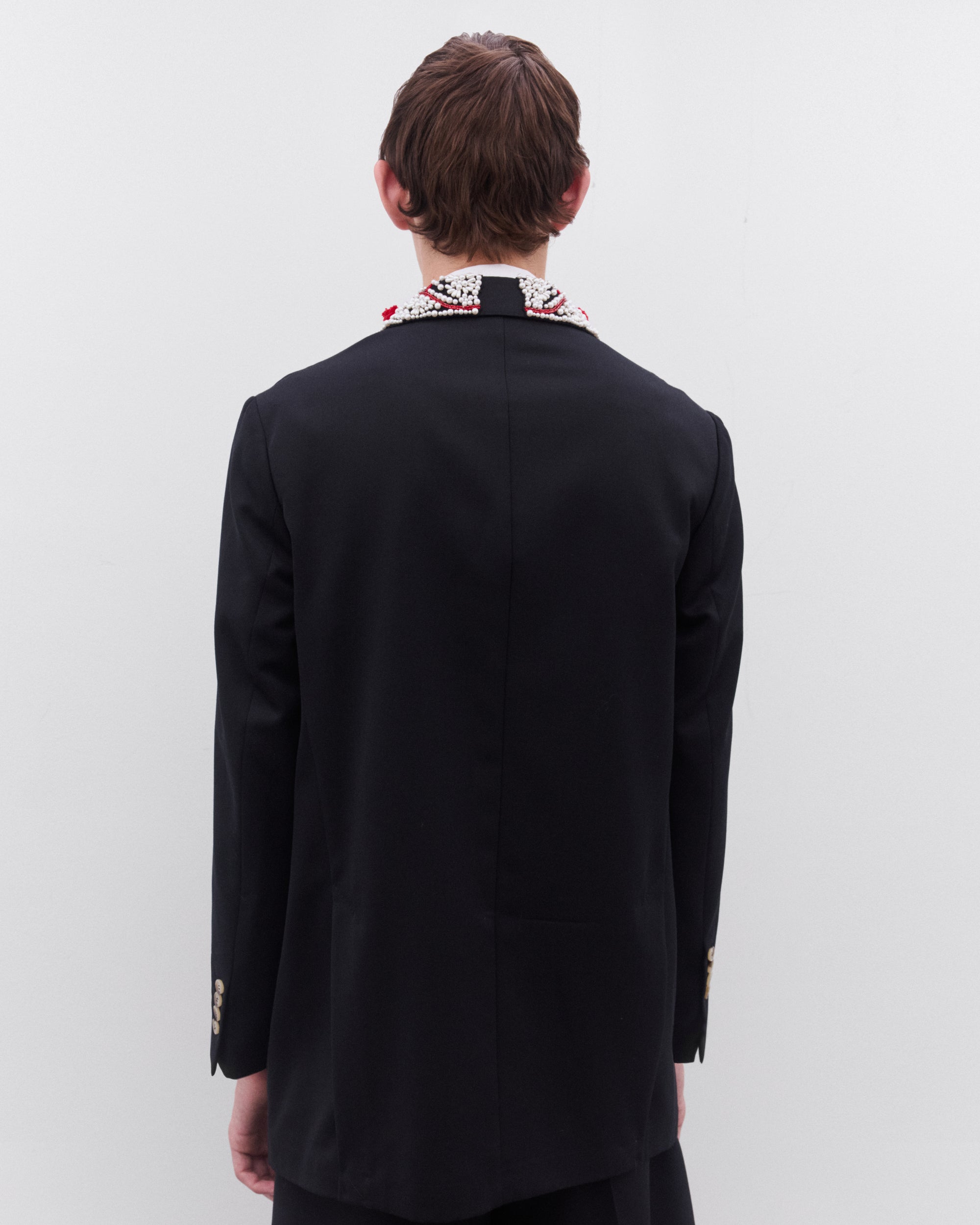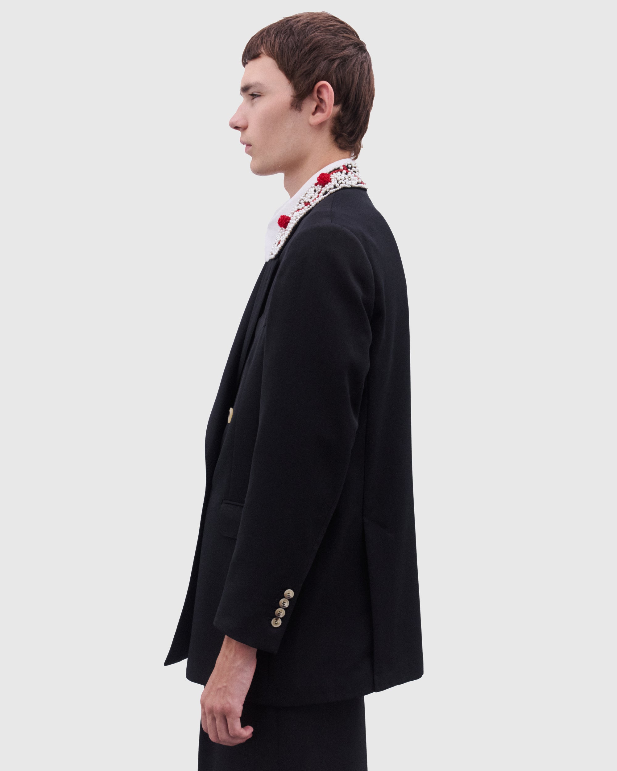 Signature daisy pearl on backSignature embellishmentDouble-breasted button closureRelaxed fit