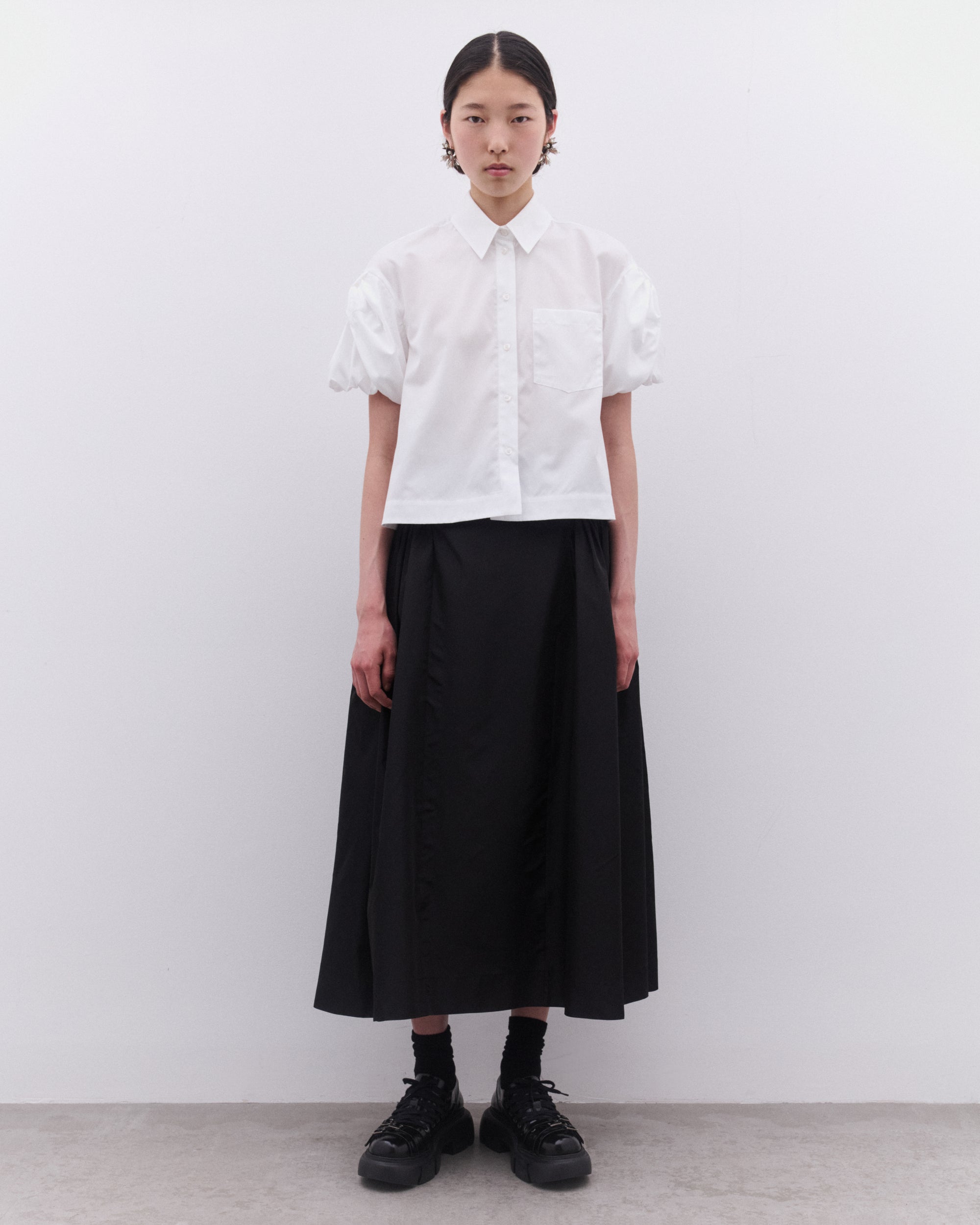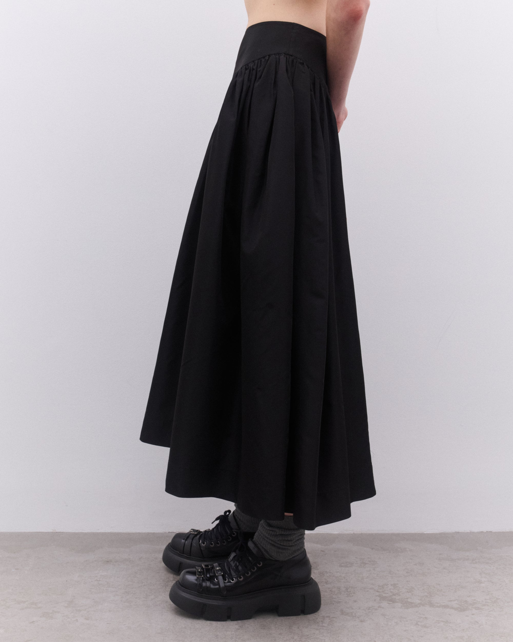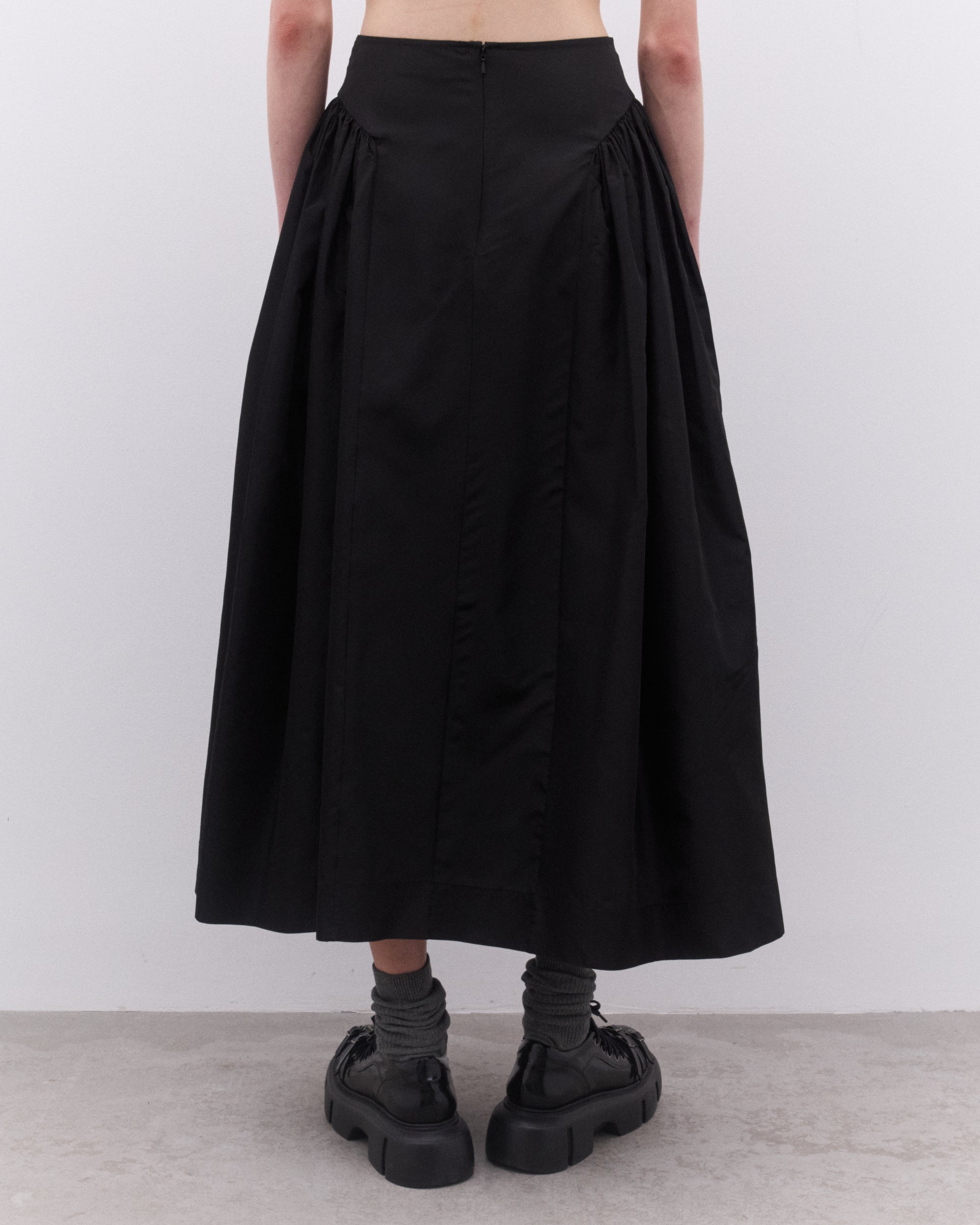 Gathered fabric at hipMidi skirt lengthRear zip closure
