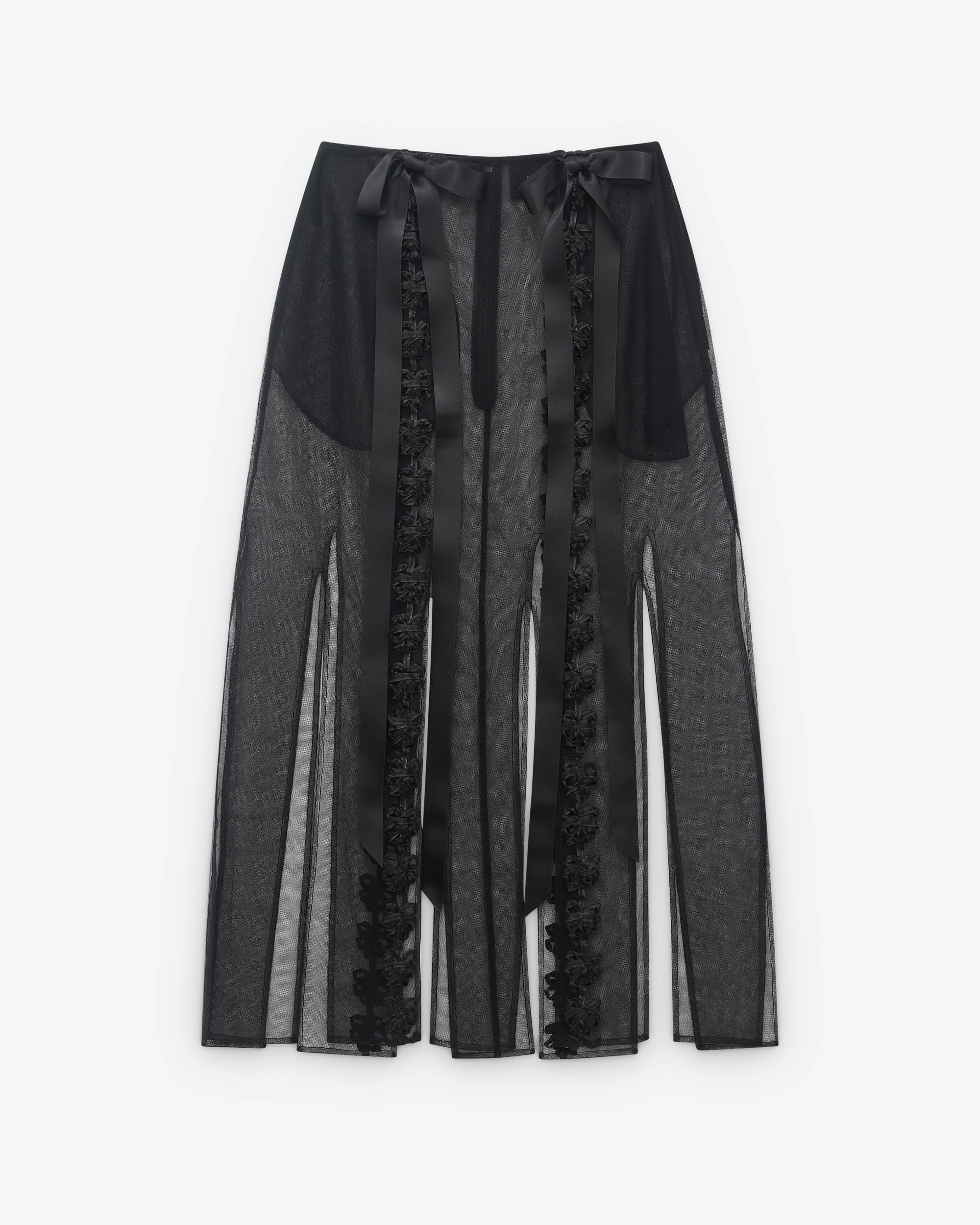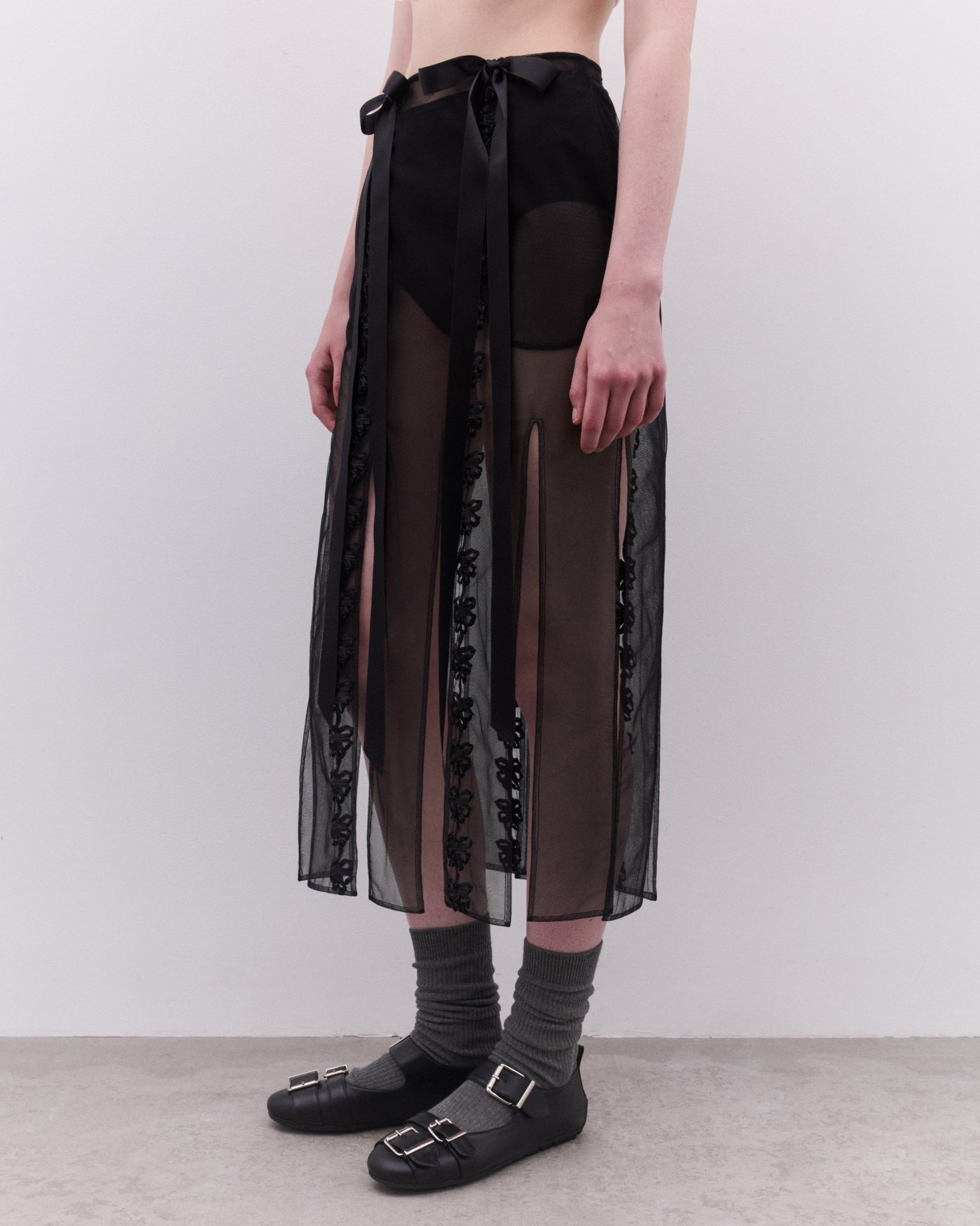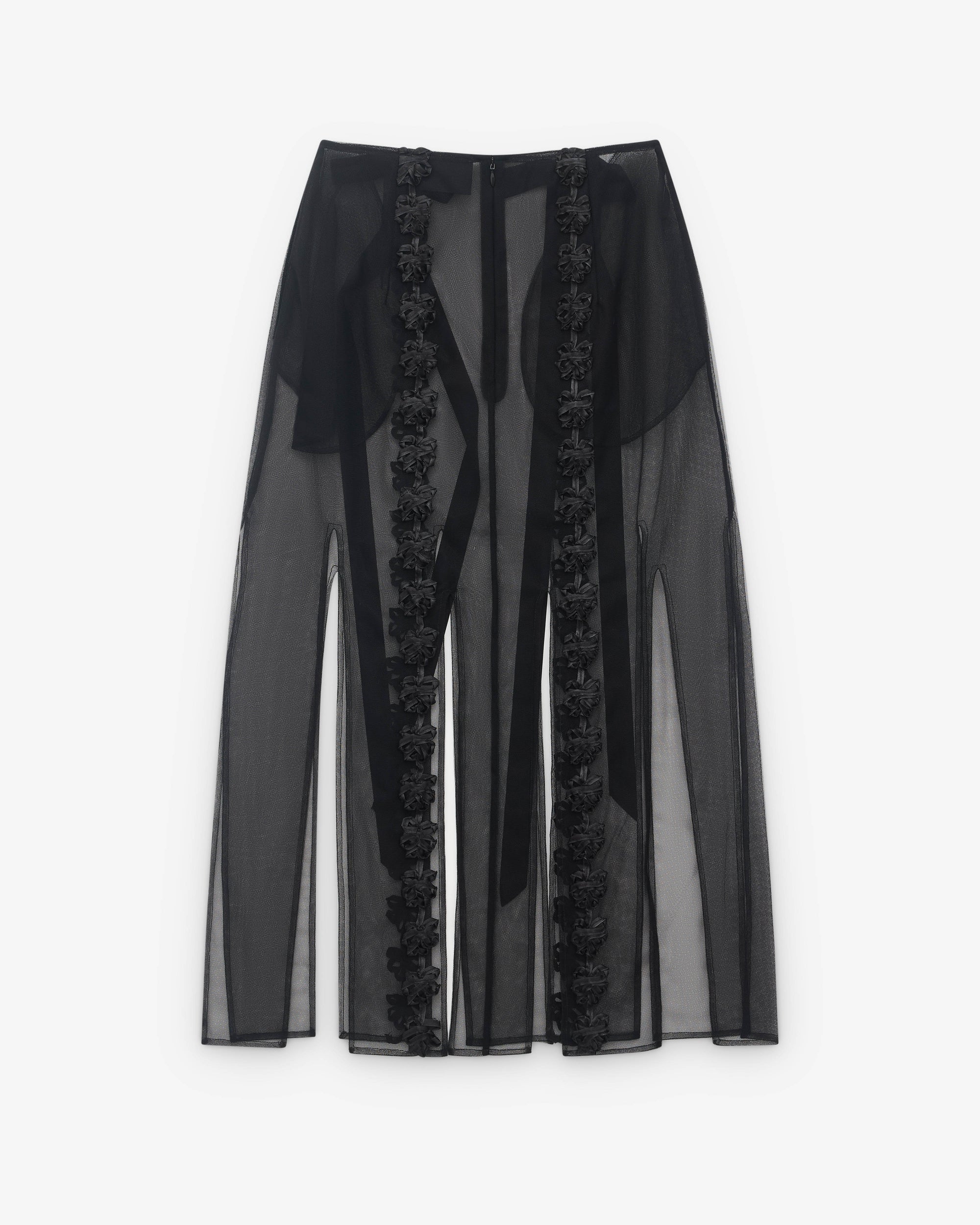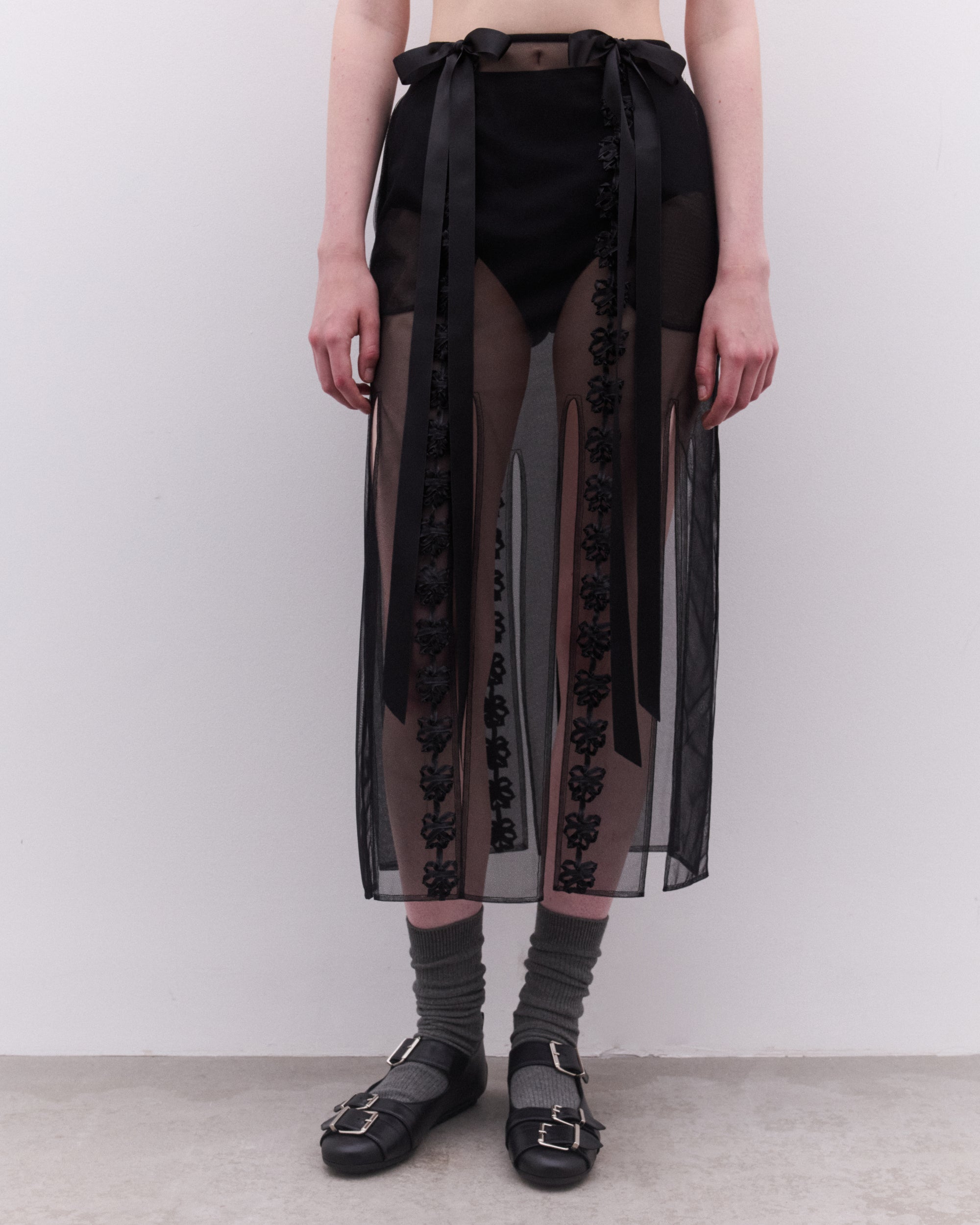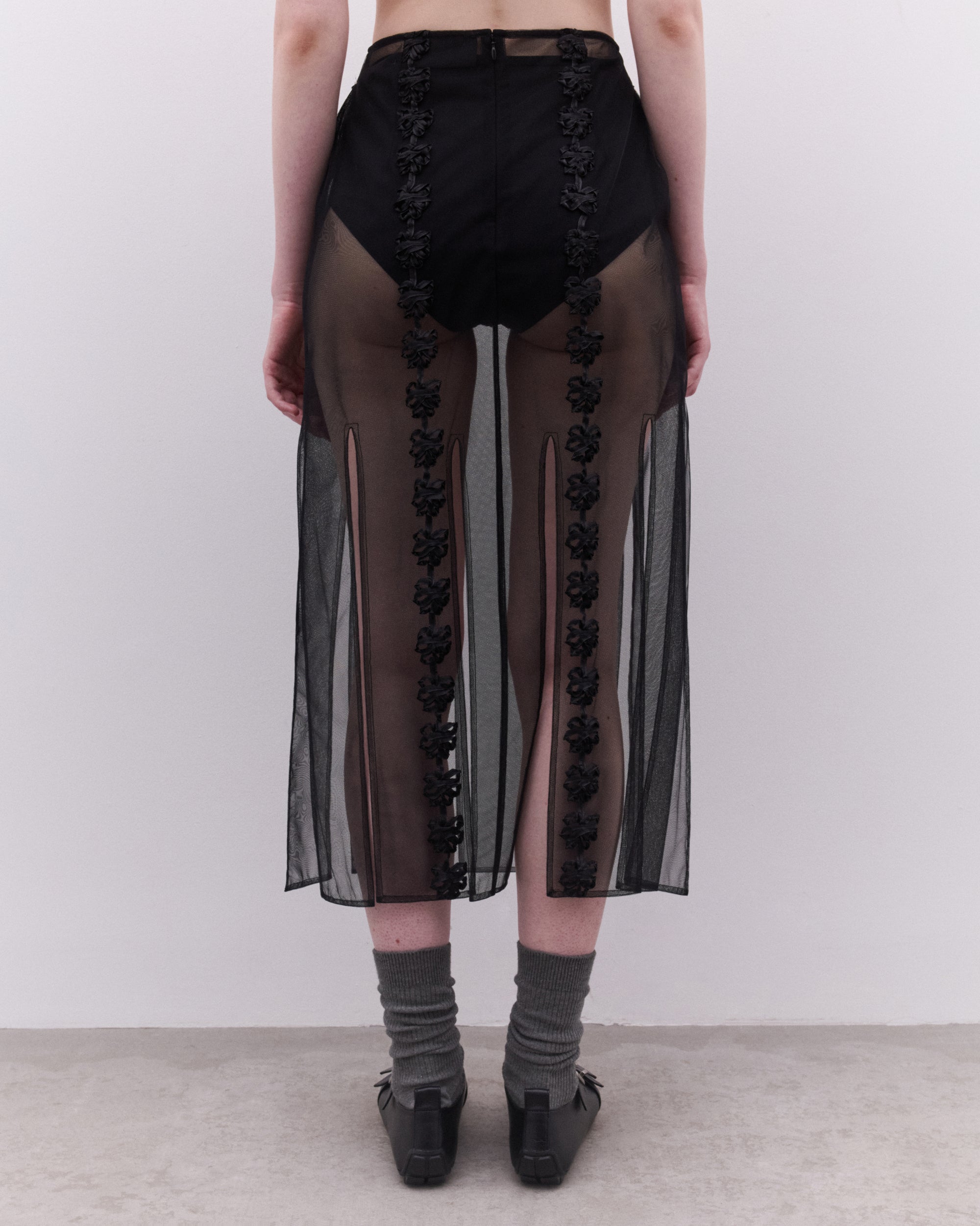 Mid-lengthSlits at hemBow detailSheerDaisy chain at front and backSide seam pockets