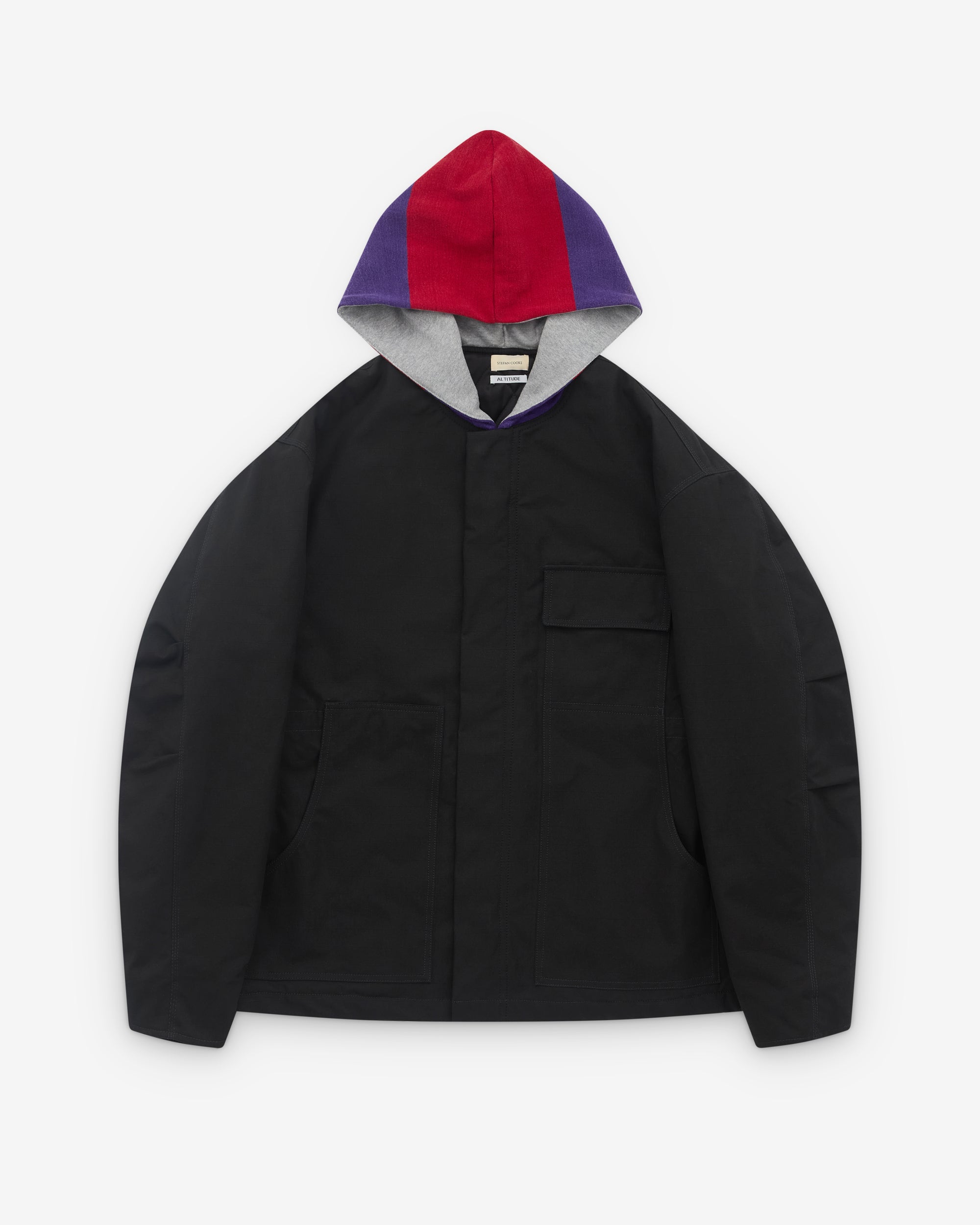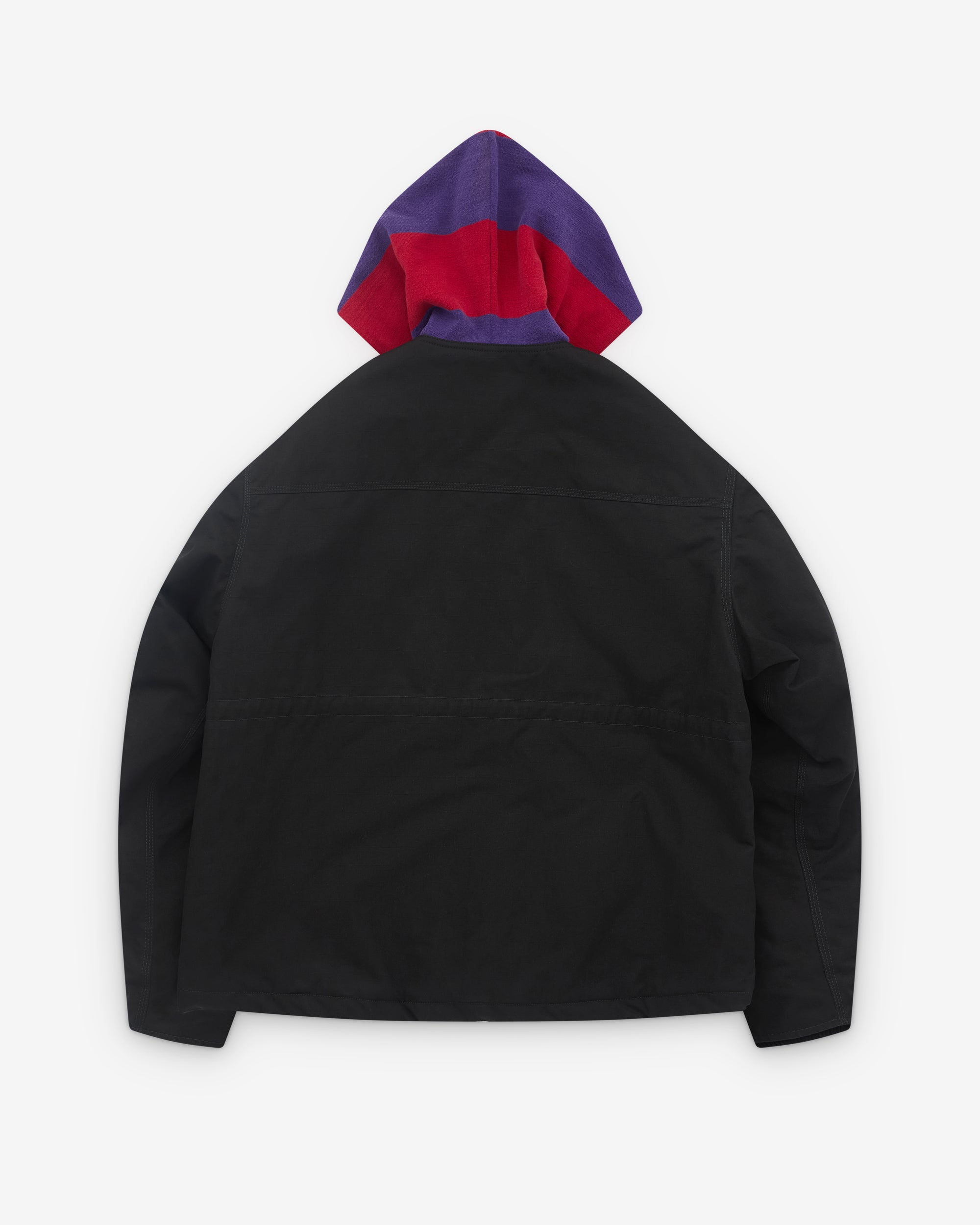 Hood in vintage multi colour rugby jerseyTwo front patch pocket & one internal pocketHiden internal drawstring around the waistTwo way zip fasteningQuilted lining