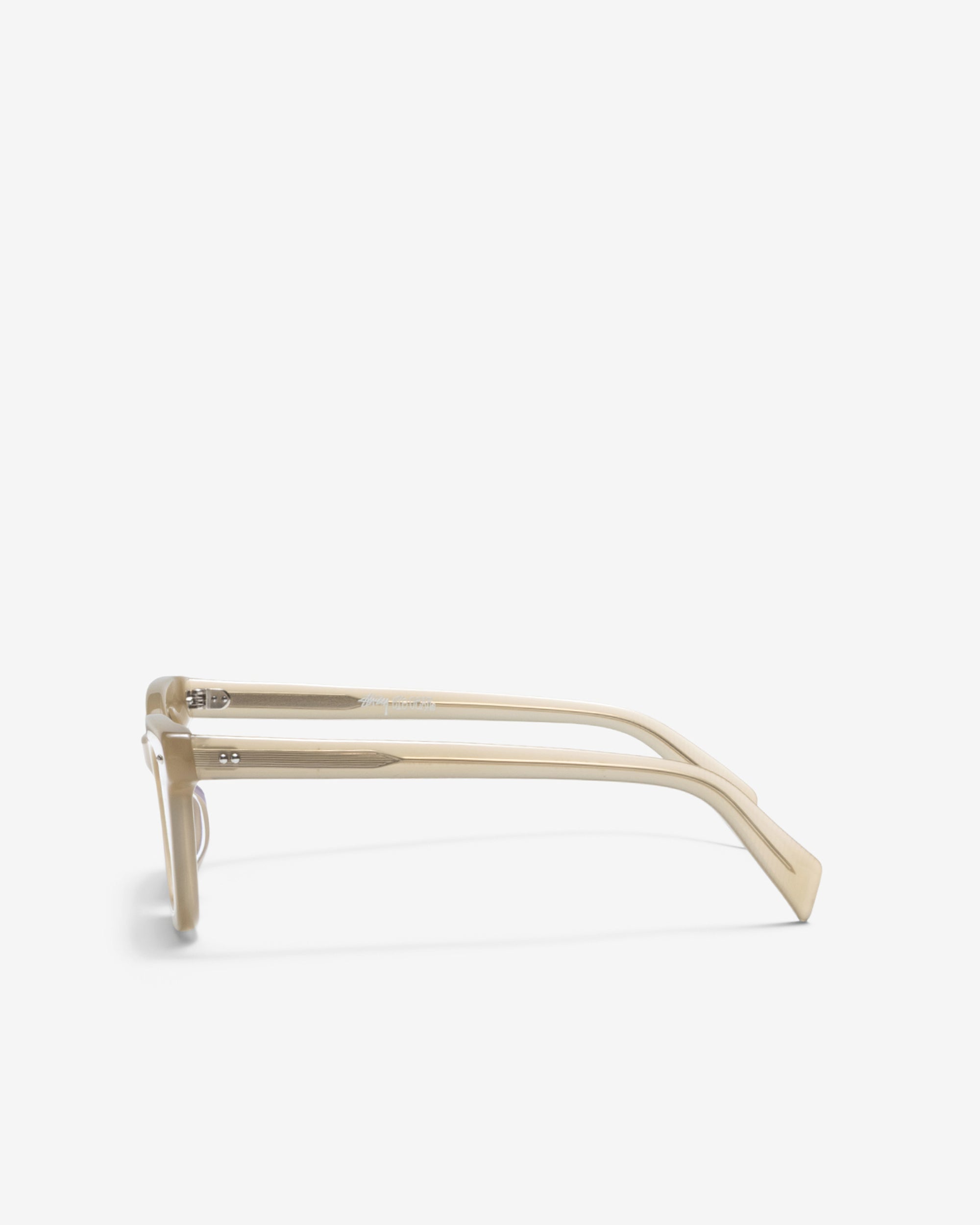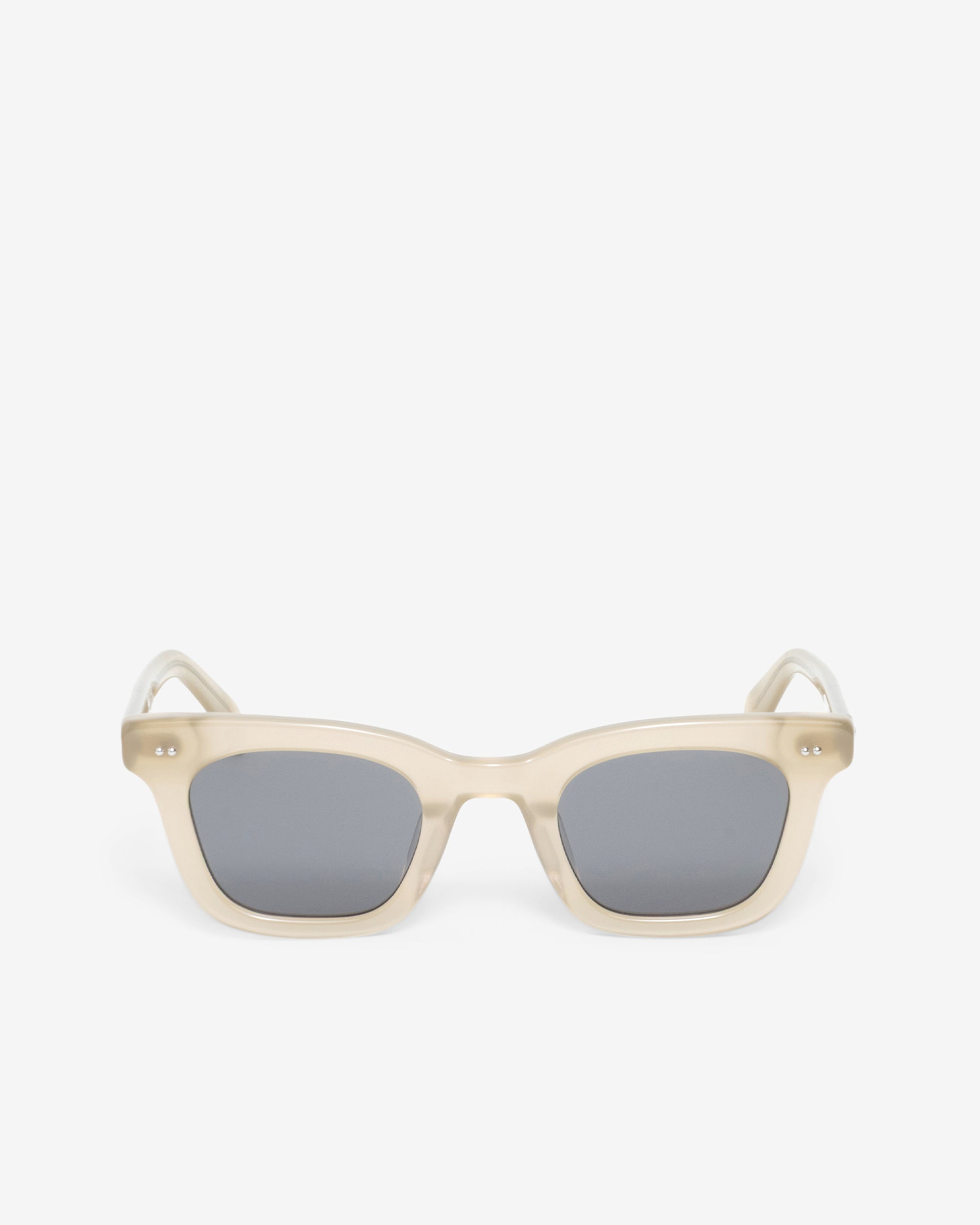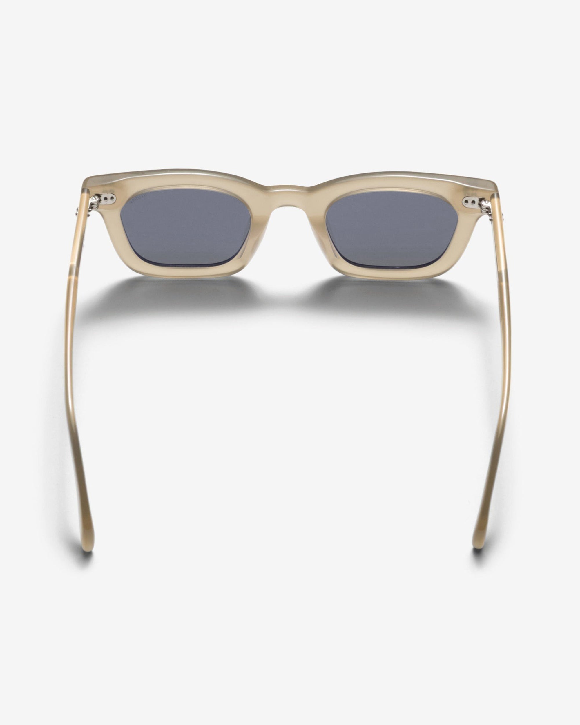 Thick square frames with a wide profile and metallic dome studs at each side. Handmade in dark brown bio-acetate with brown tinted recycled lenses. Features laser-engraved logo detailing at the lens corner.