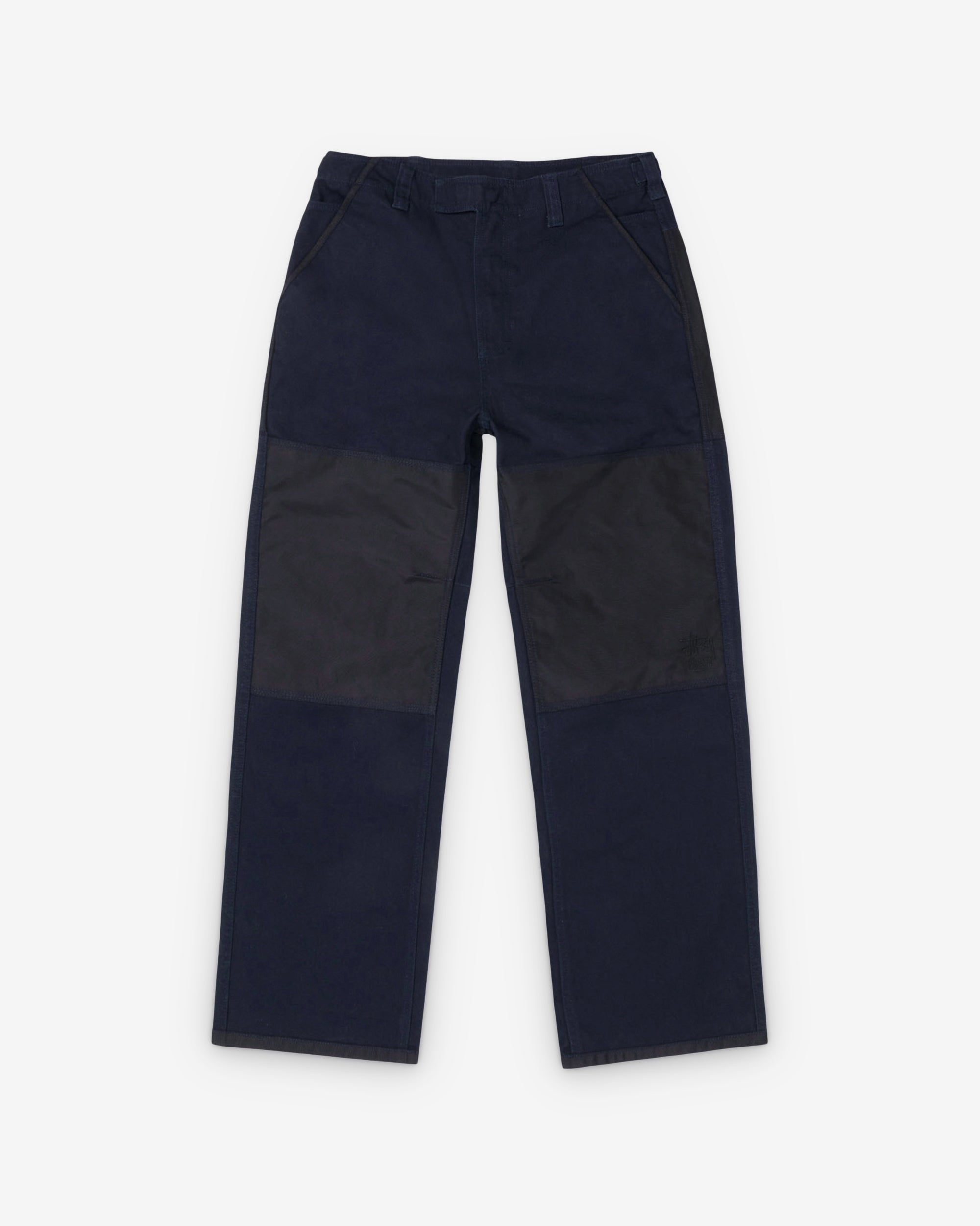 Tonal Stüssy embroidery at left knee