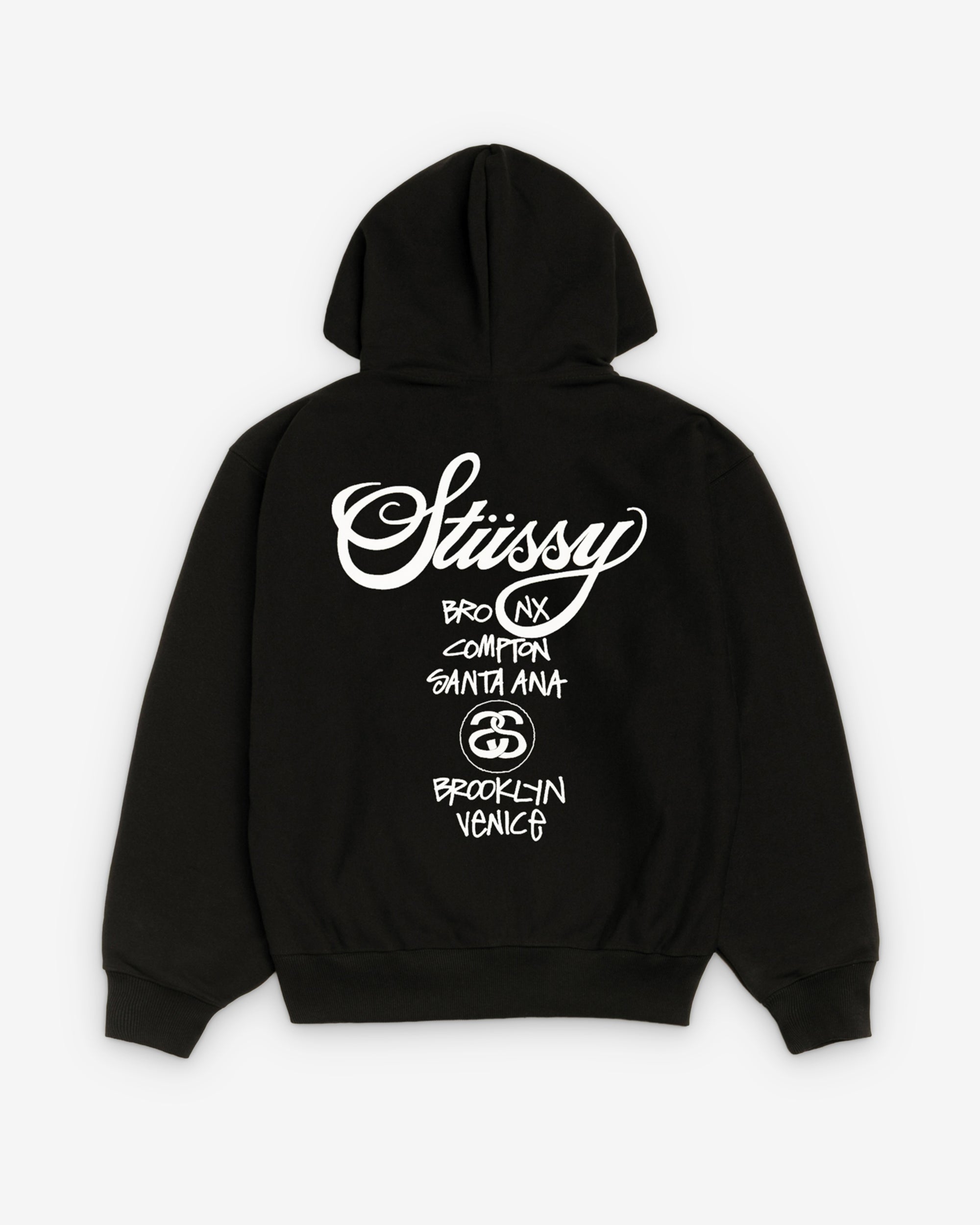 Relaxed fit zip-front fleece hoodieHeavyweight 430gsm cotton blendYKK zip front closureScreen printed artworkRound drawcord in hoodRibbed cuffs and hemPatch pocketsUnisex