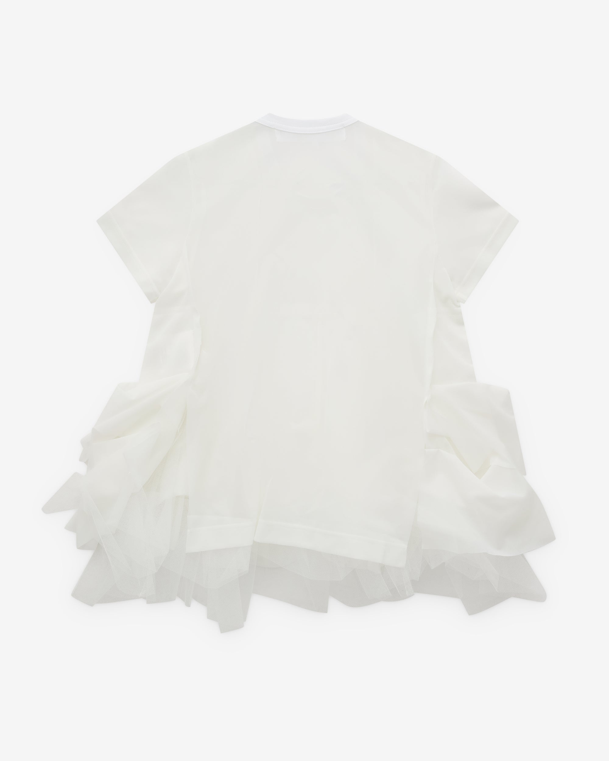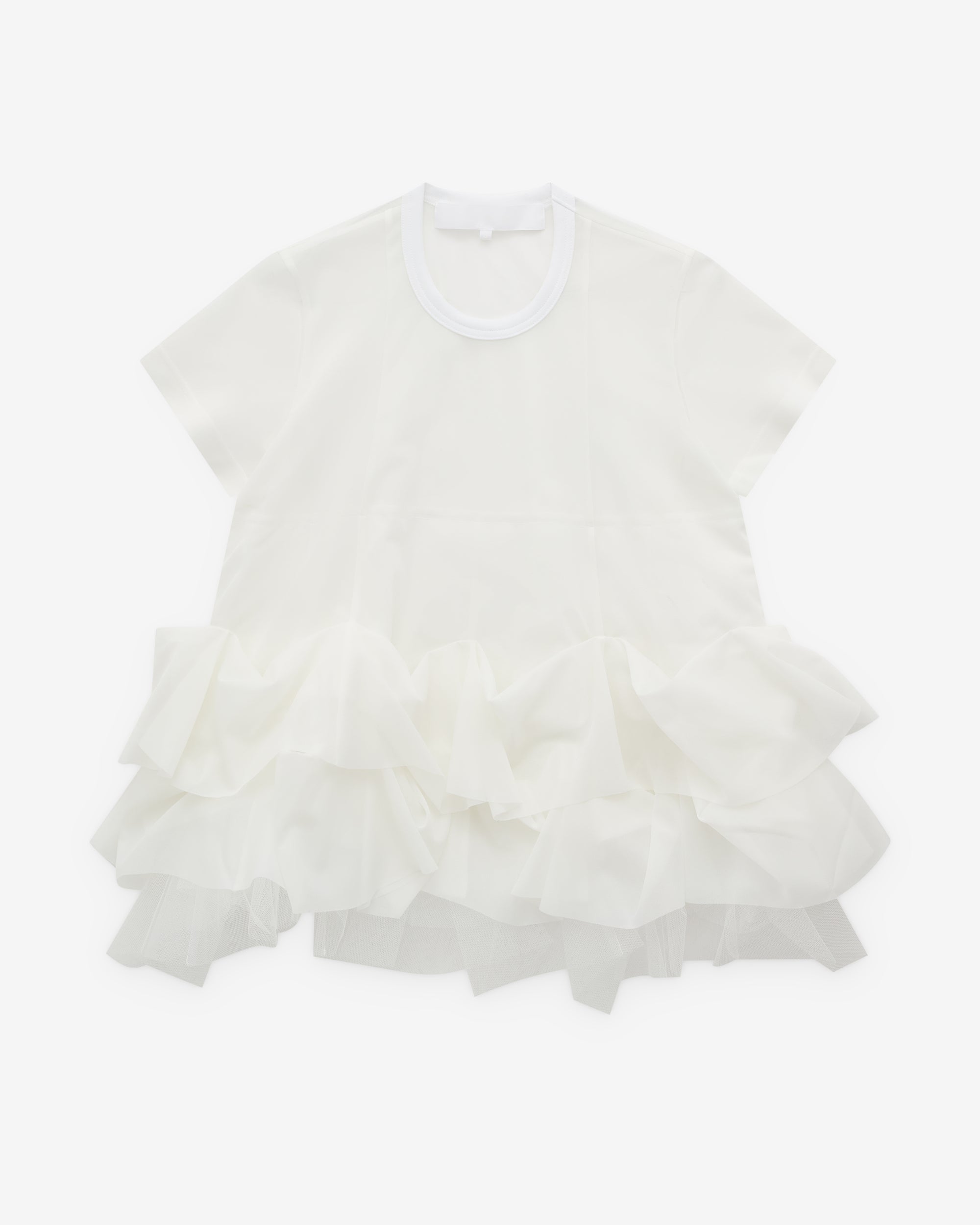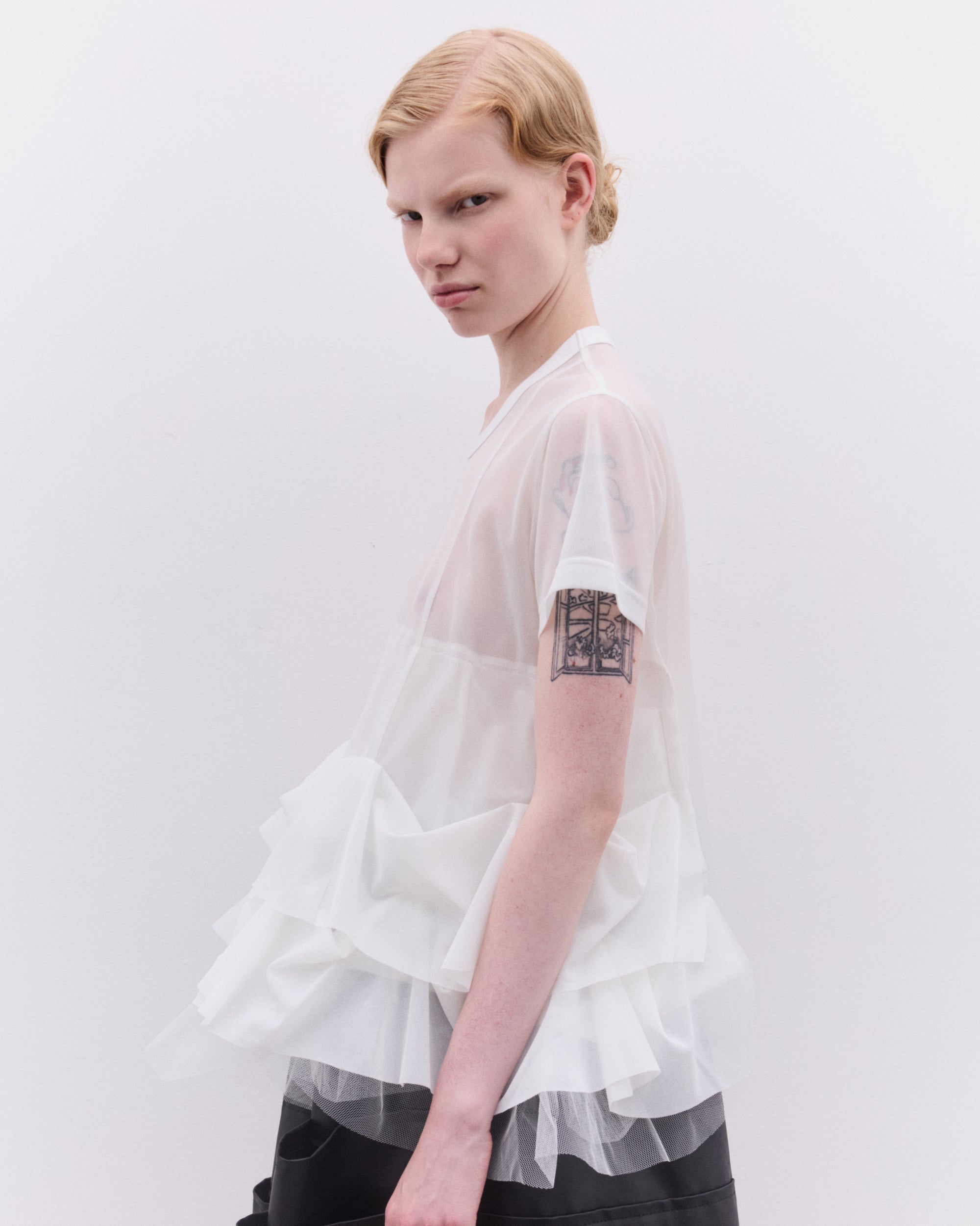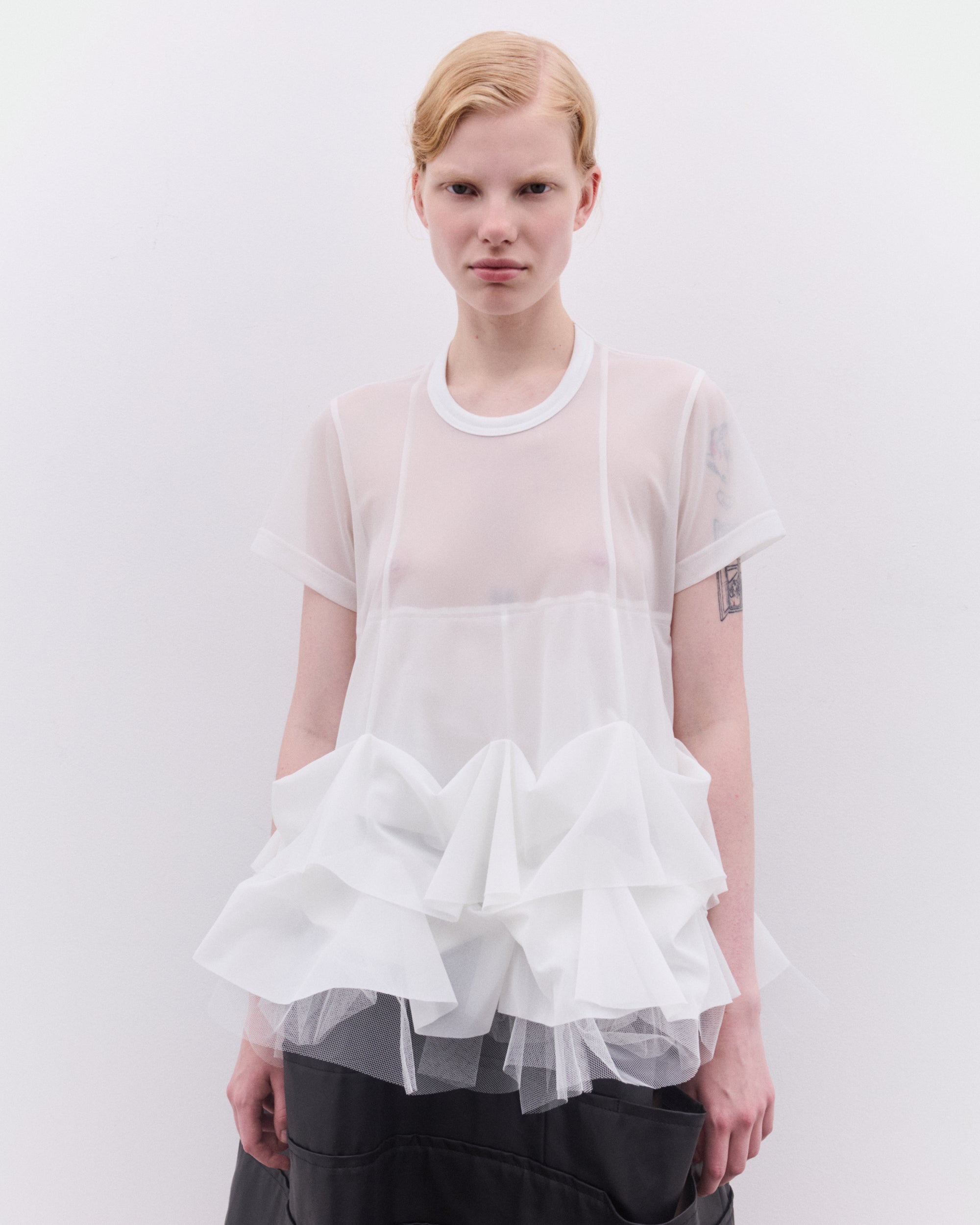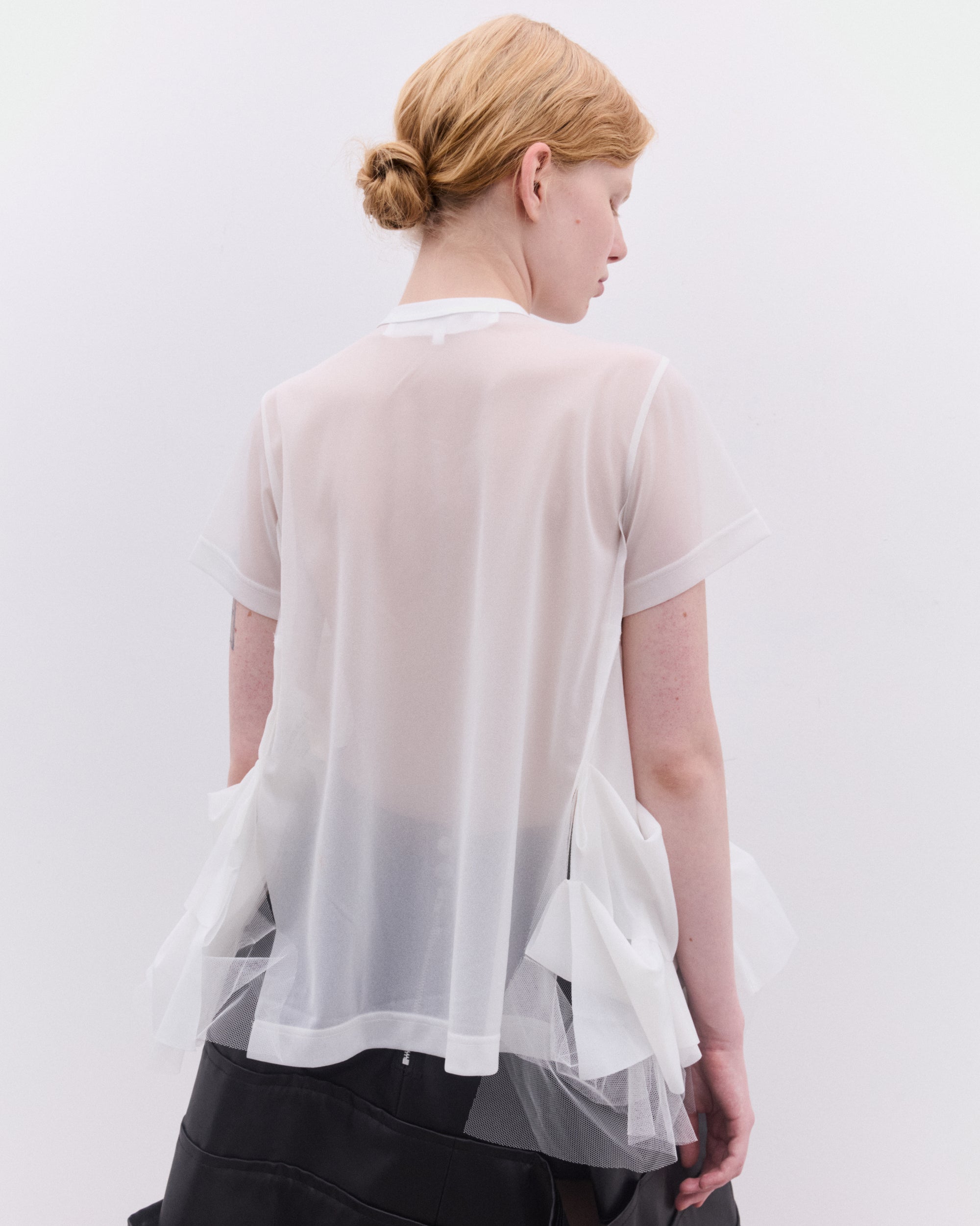 Round collarShort sleevesRear button placketSheer panellingGathered tulle peplum at hem