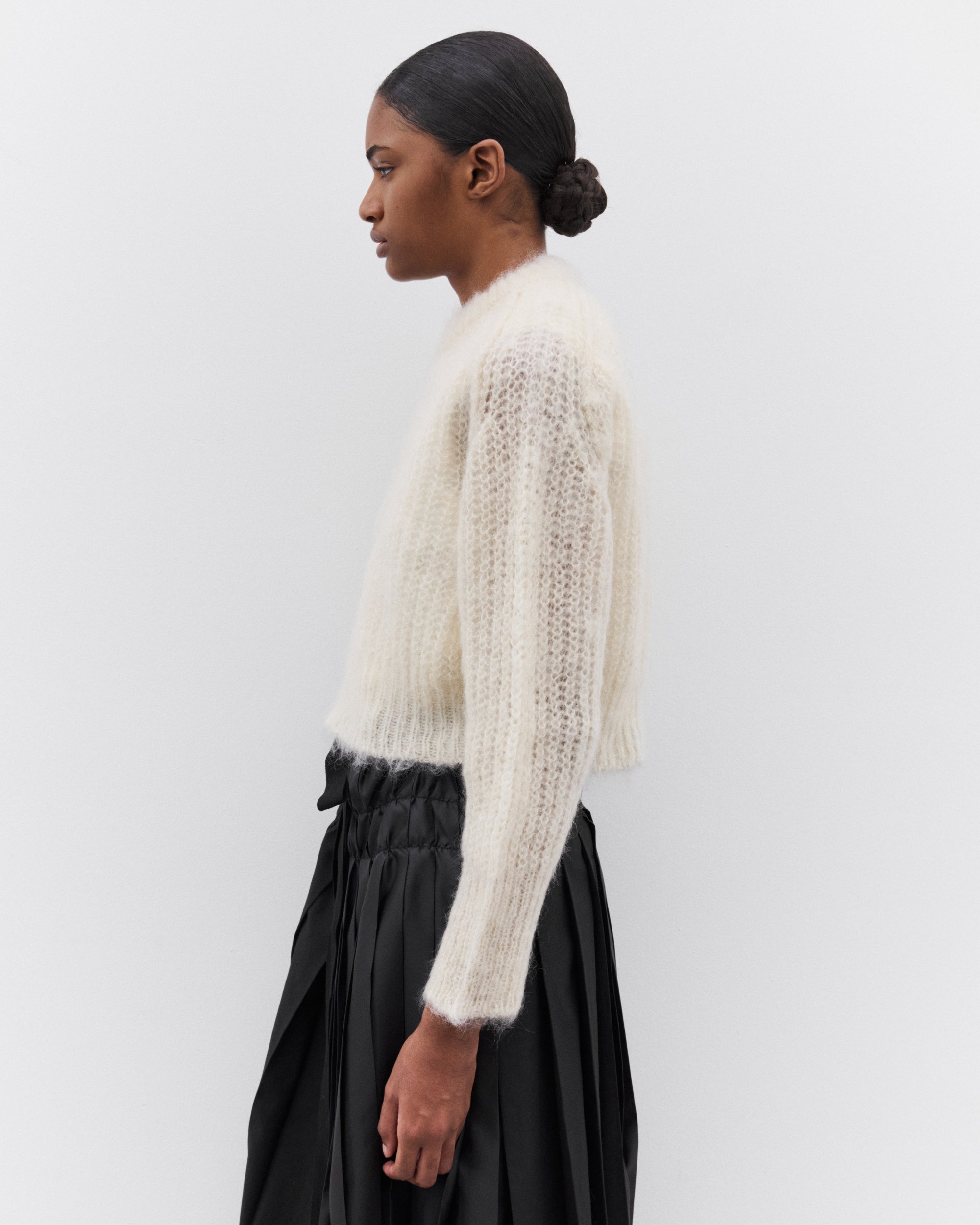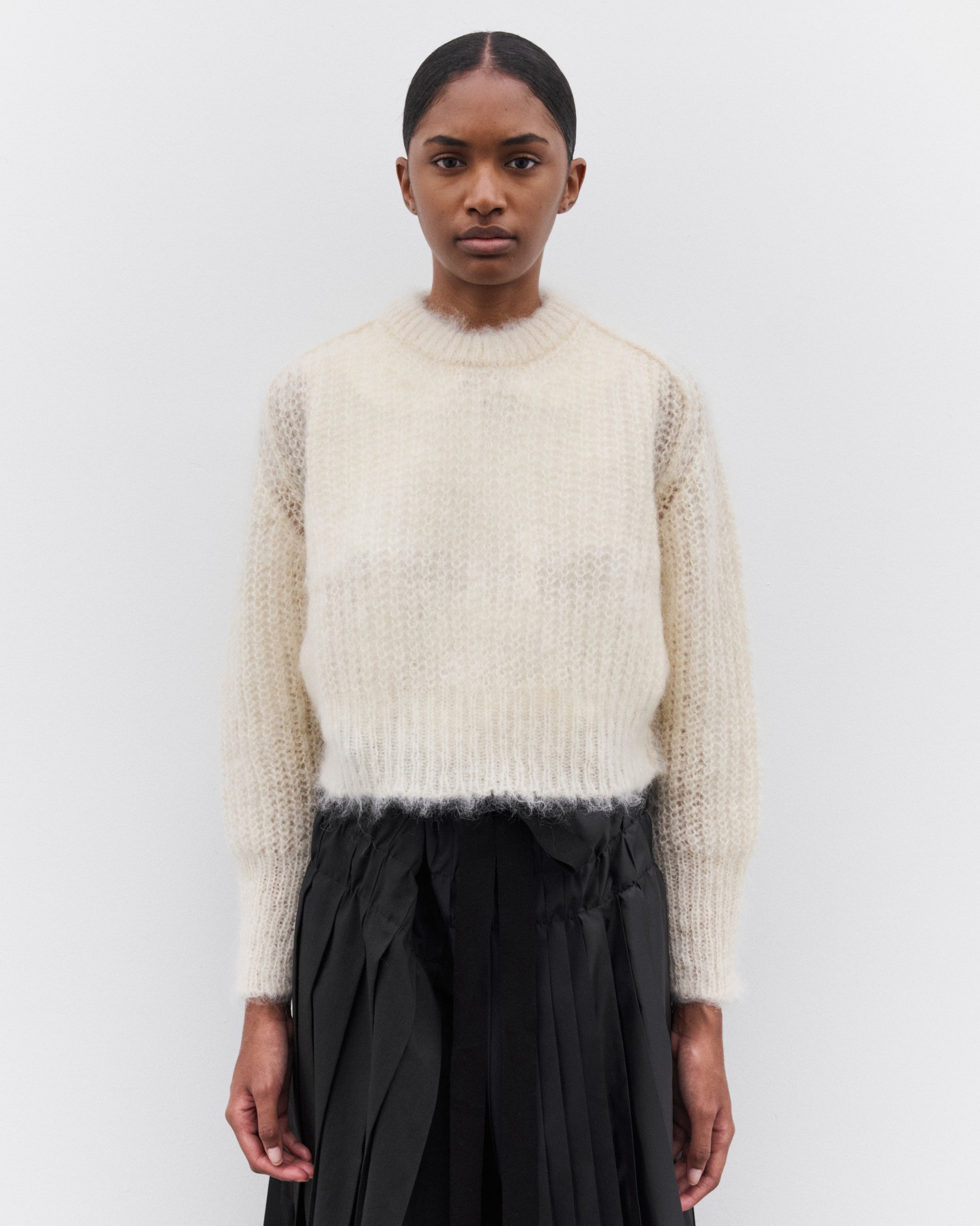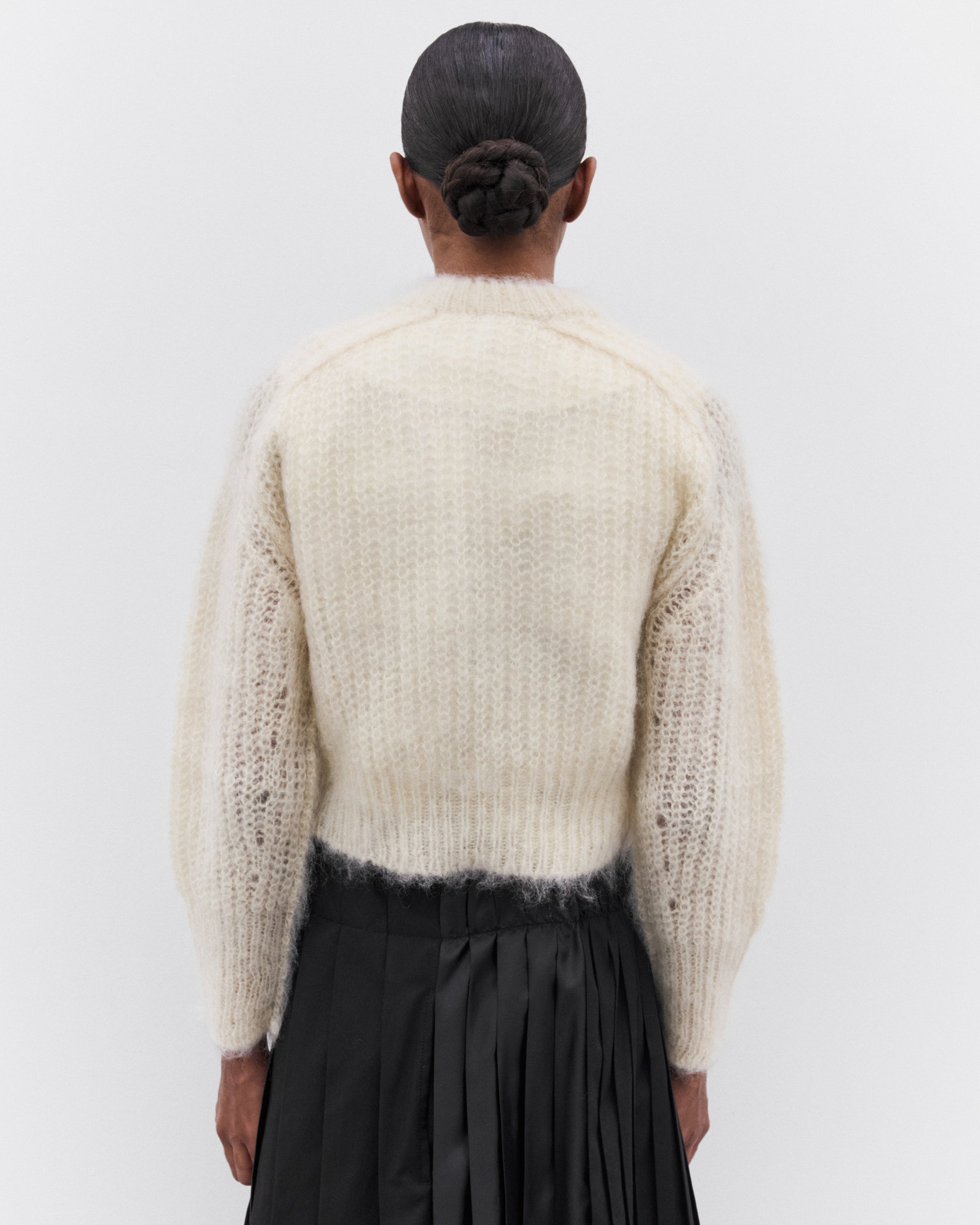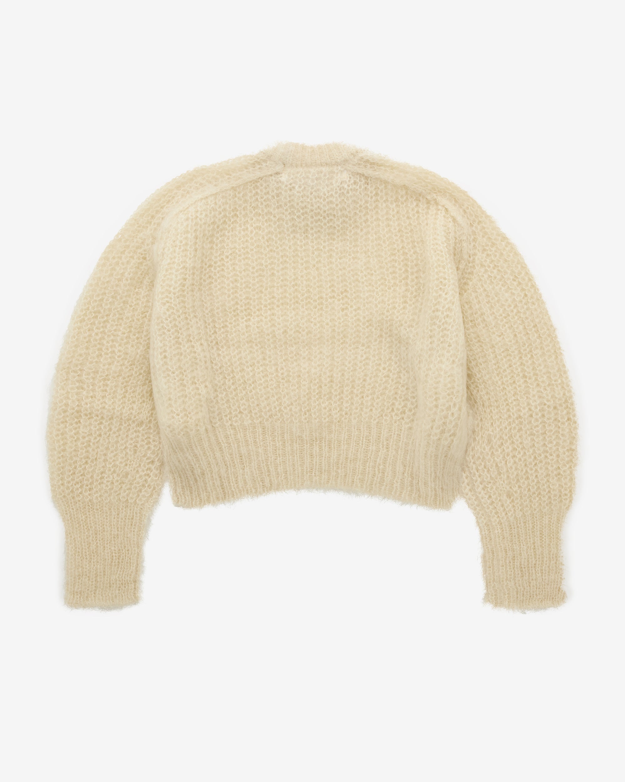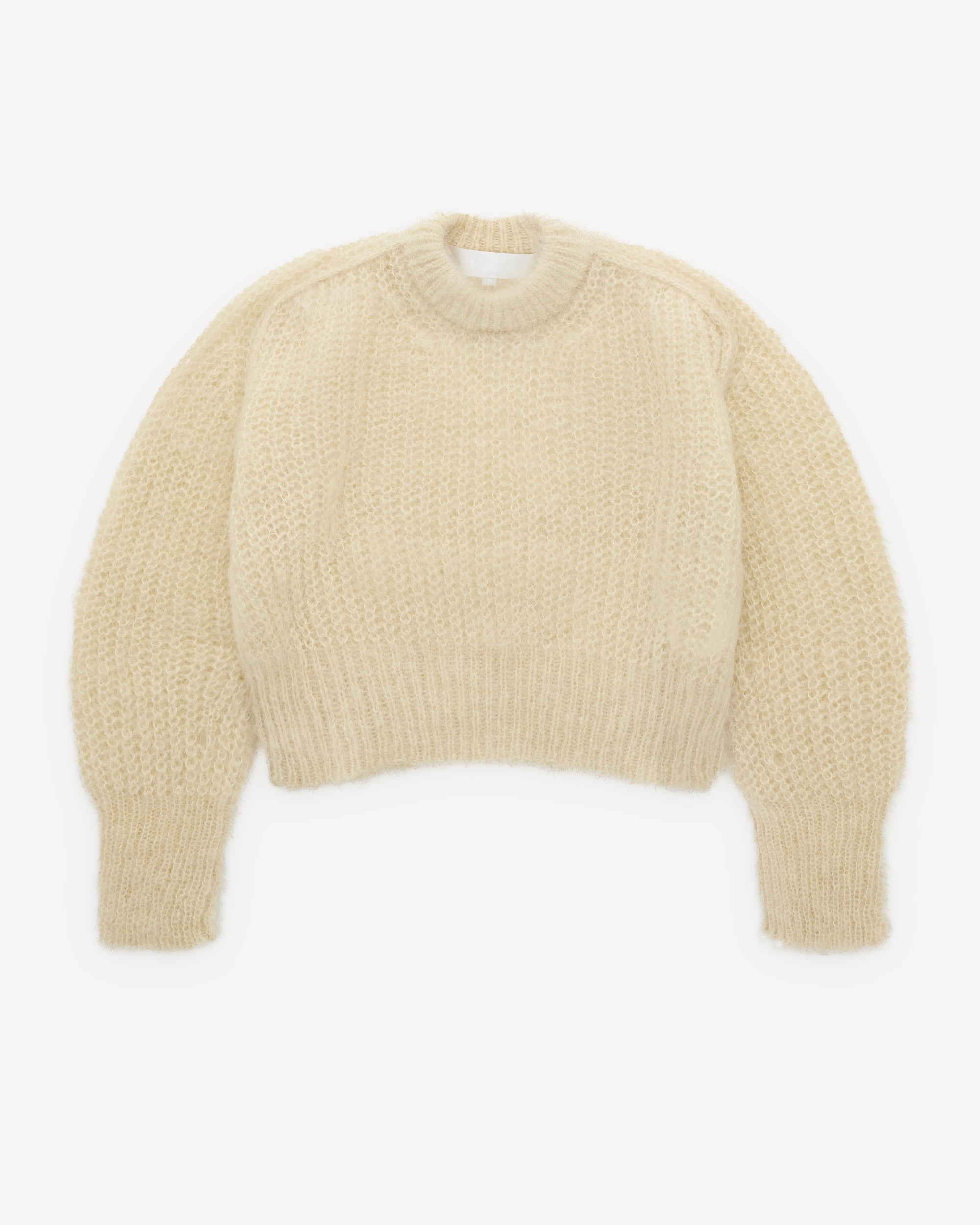 Cropped, boxy fitRound neckRaglan sleevesFuzzy knit trims