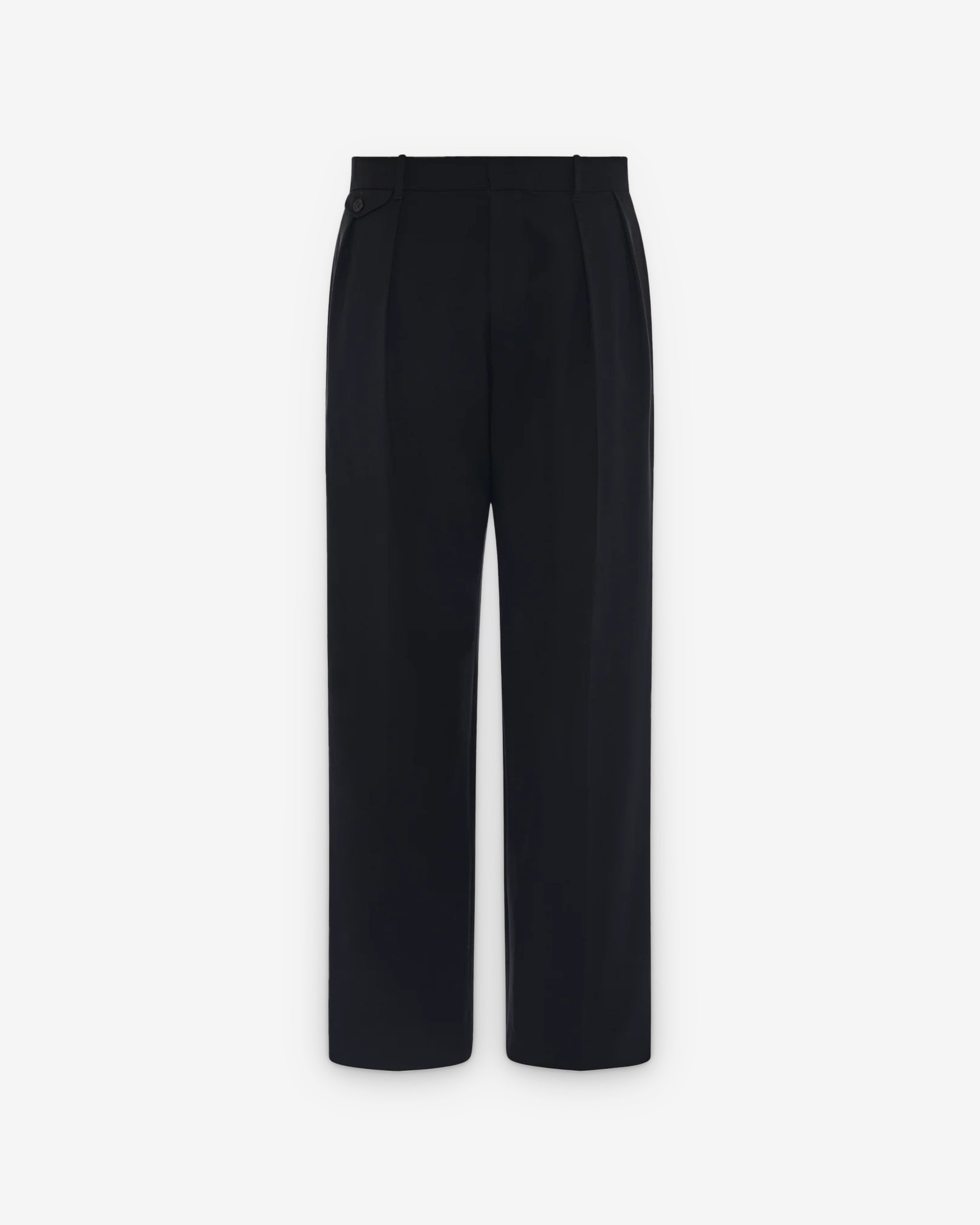 Mid-waisted pant in soft wool gabardine with double pleated front, side seam pockets, button-down back pockets and triangular coin pocket.
