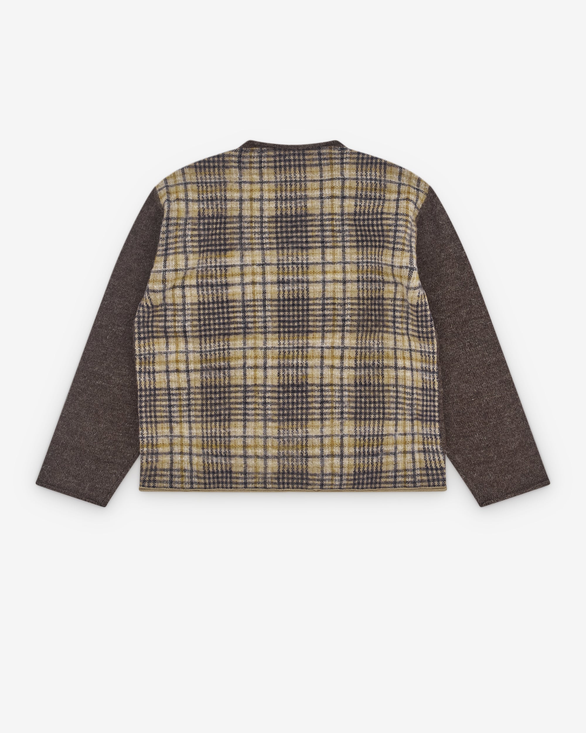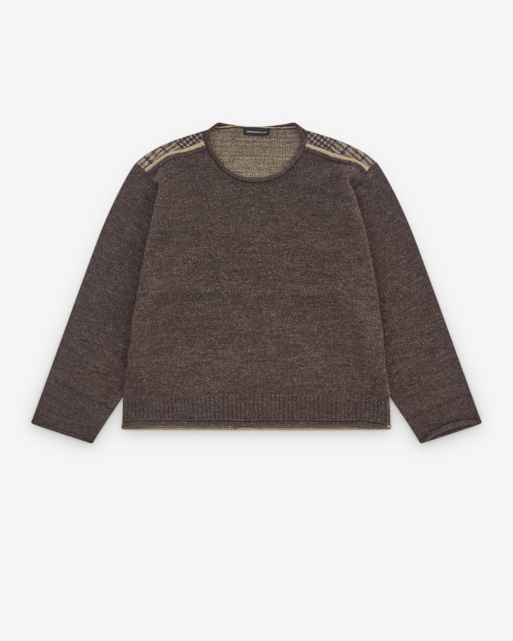 Raw edge rounded neckExposed seams throughoutCheck back panelLong sleevesRibbed hem