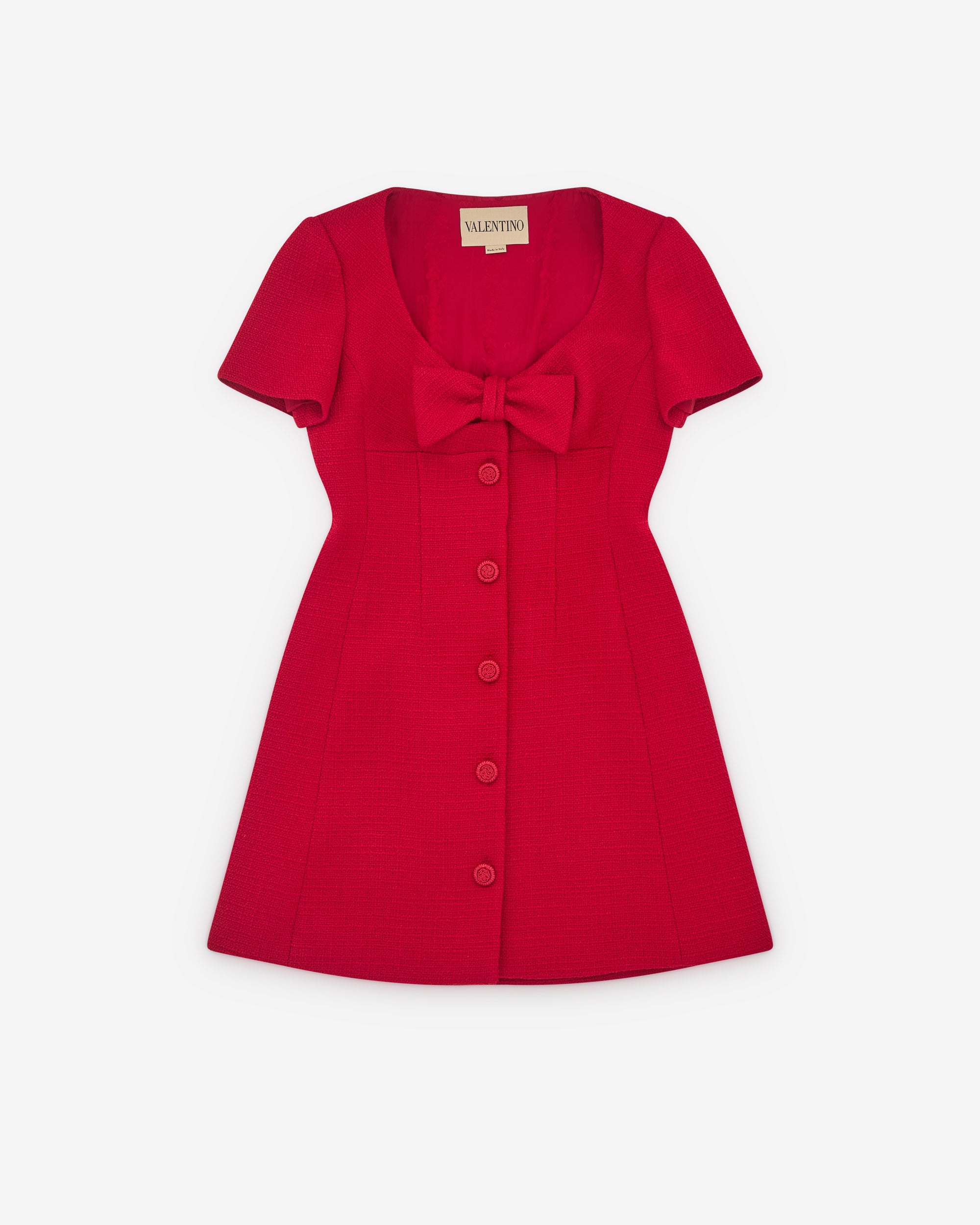Wide necklineThigh lengthFront closure with soutache buttonsShort sleevesInternal lining
