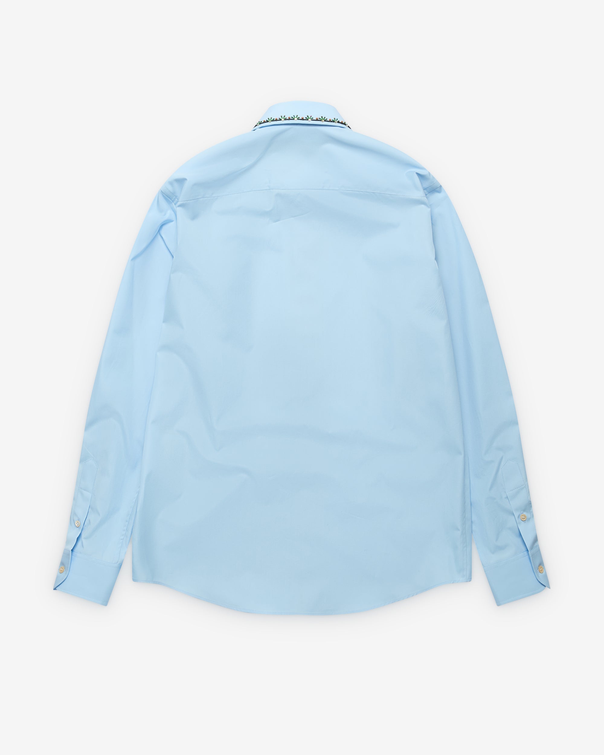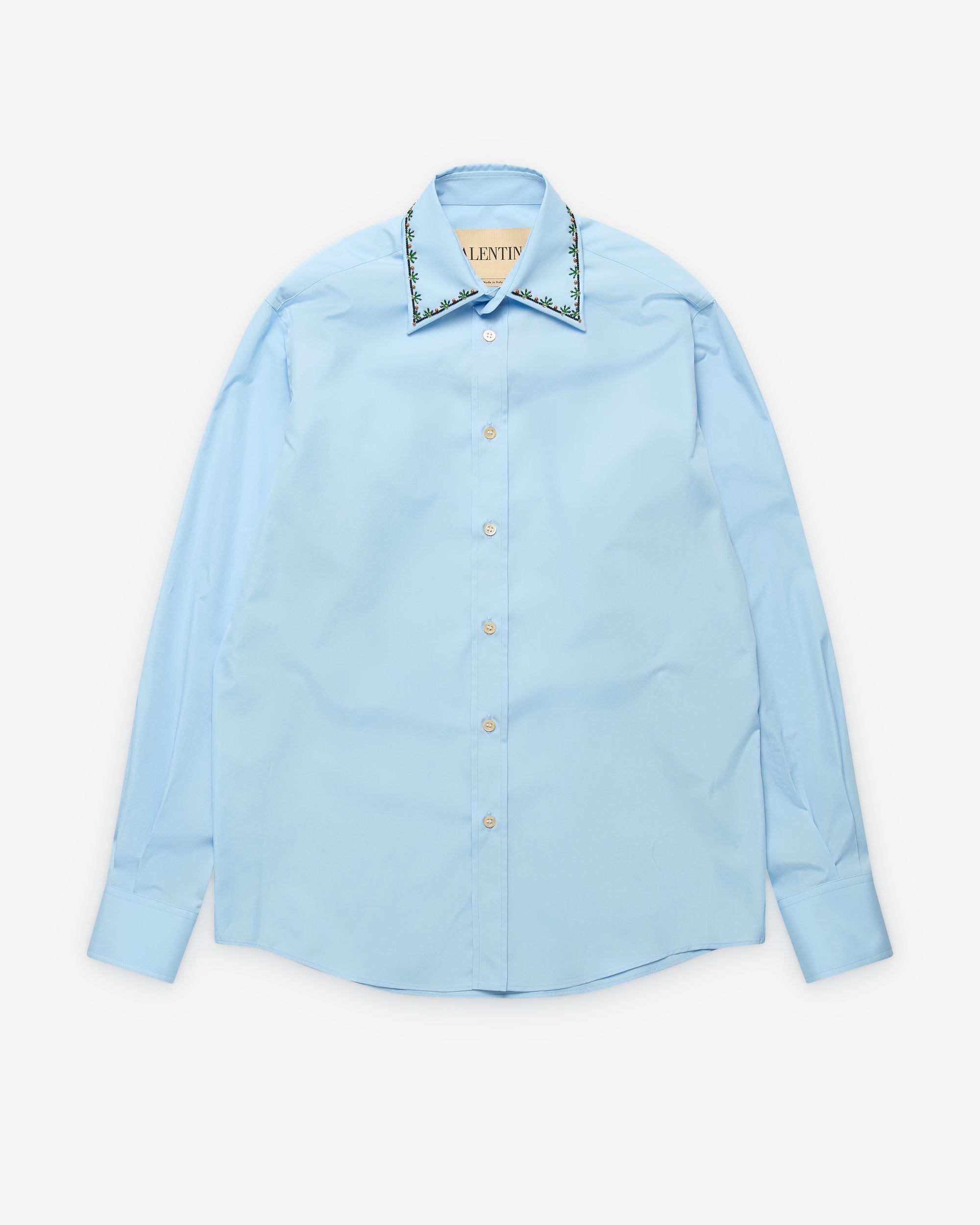 Point collar with embroideryFront button closureCotton poplin fabricButton close cuffsCurved hem
