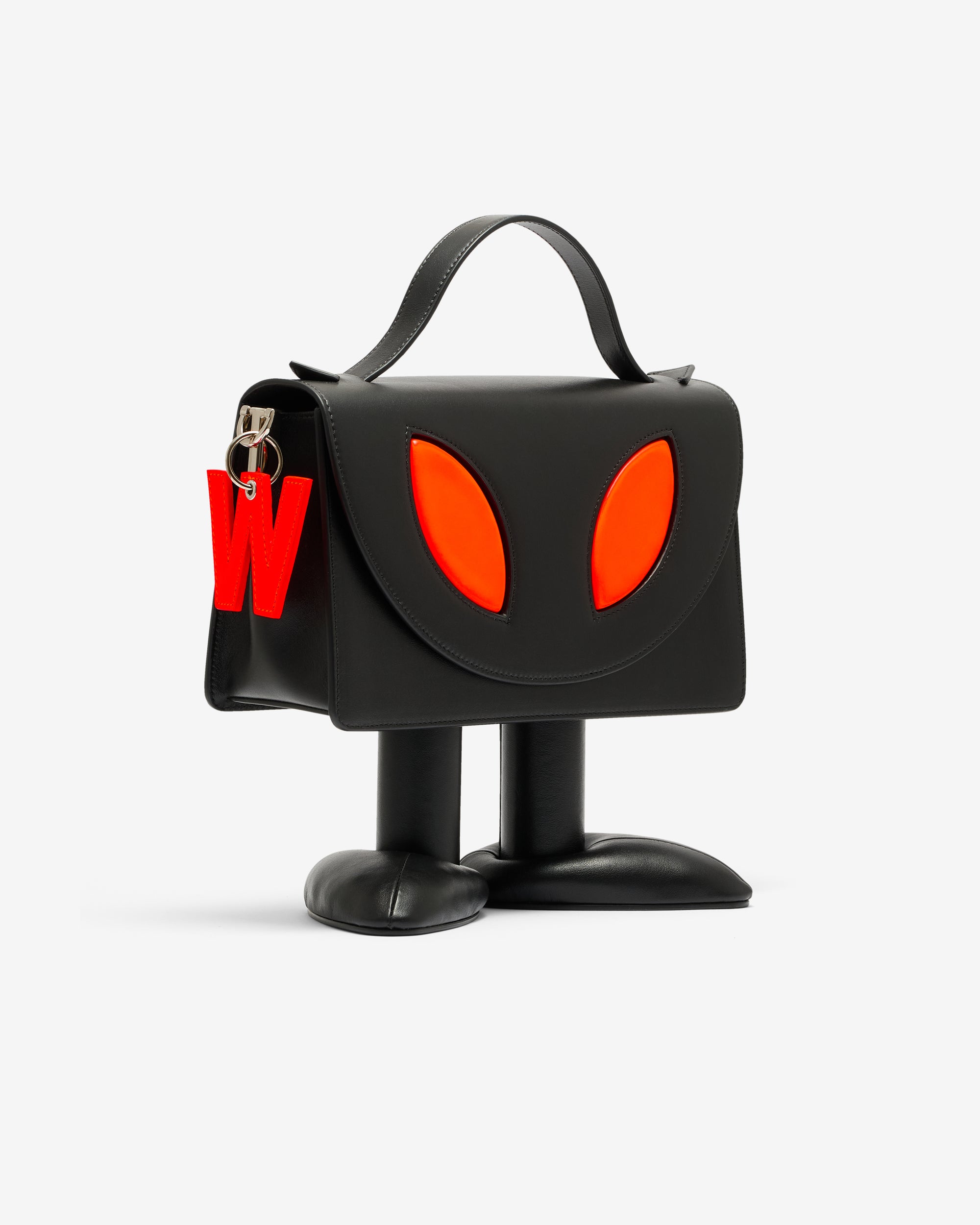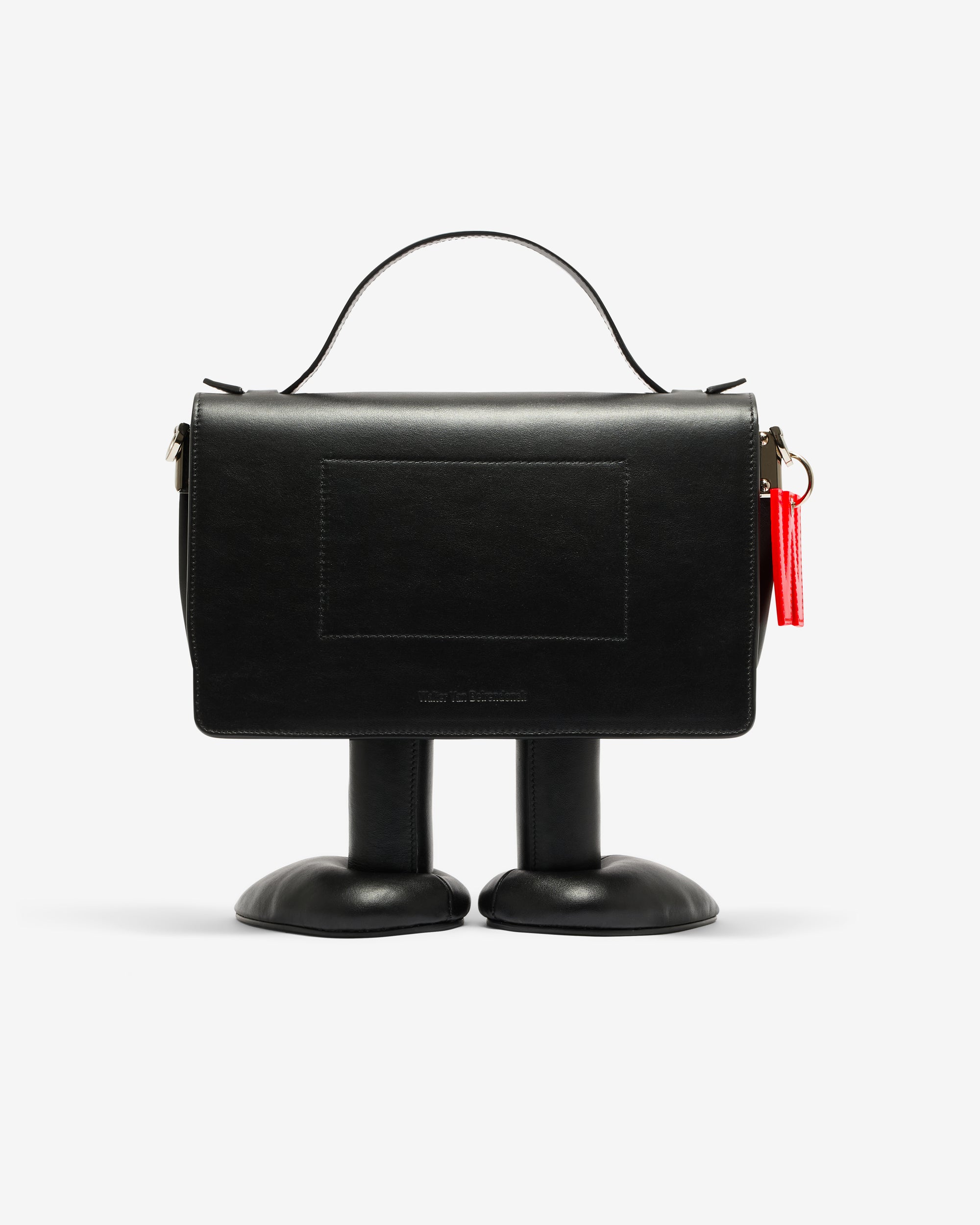 Top carry handleFlap close openingOne internal compartmentAttached charm at sideLeather feet at bottom