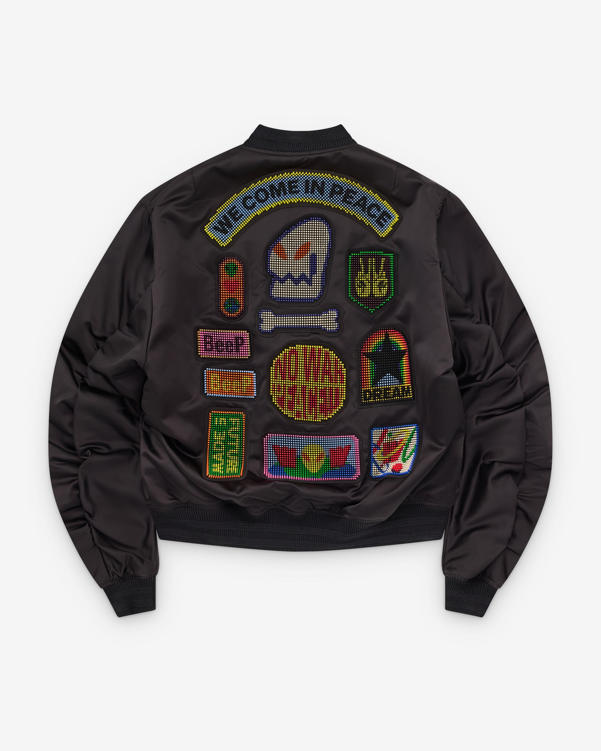 Ribbed bomber collarQuilted lining Concealed zip closureFront pocketsRibbed cuffs and hemGraphic patches throughout