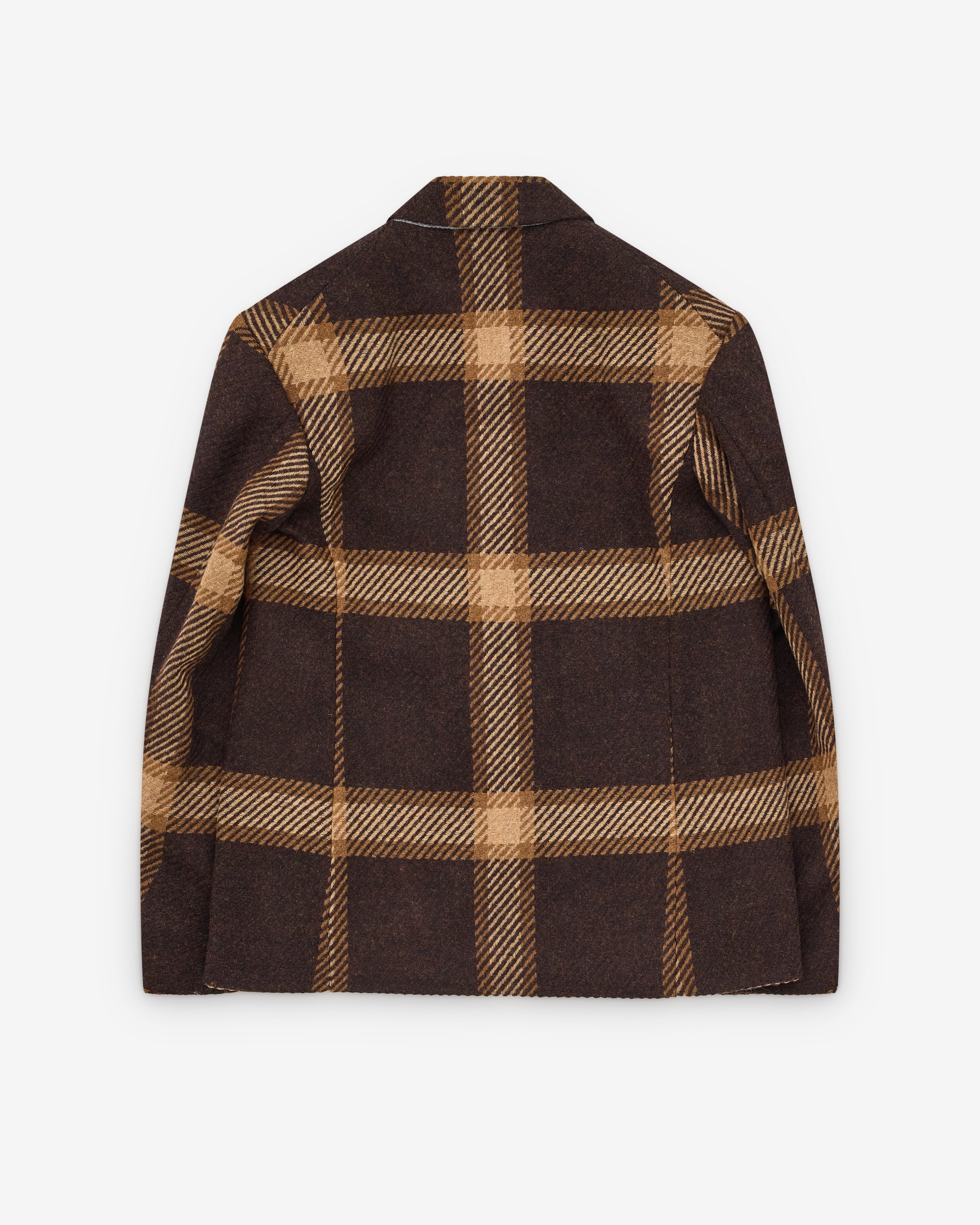 Wool check fabricOpen collarFour button closureInternal lining Single chest pocketTwo patch pocketsBoxy fit