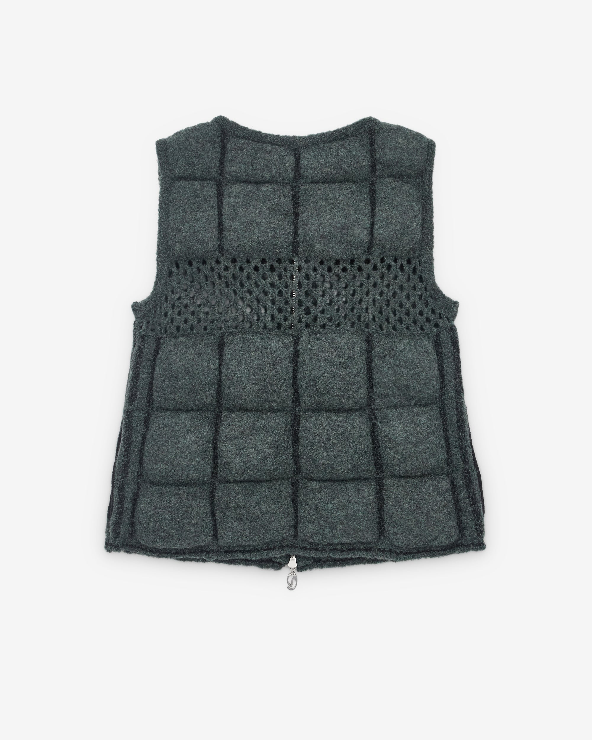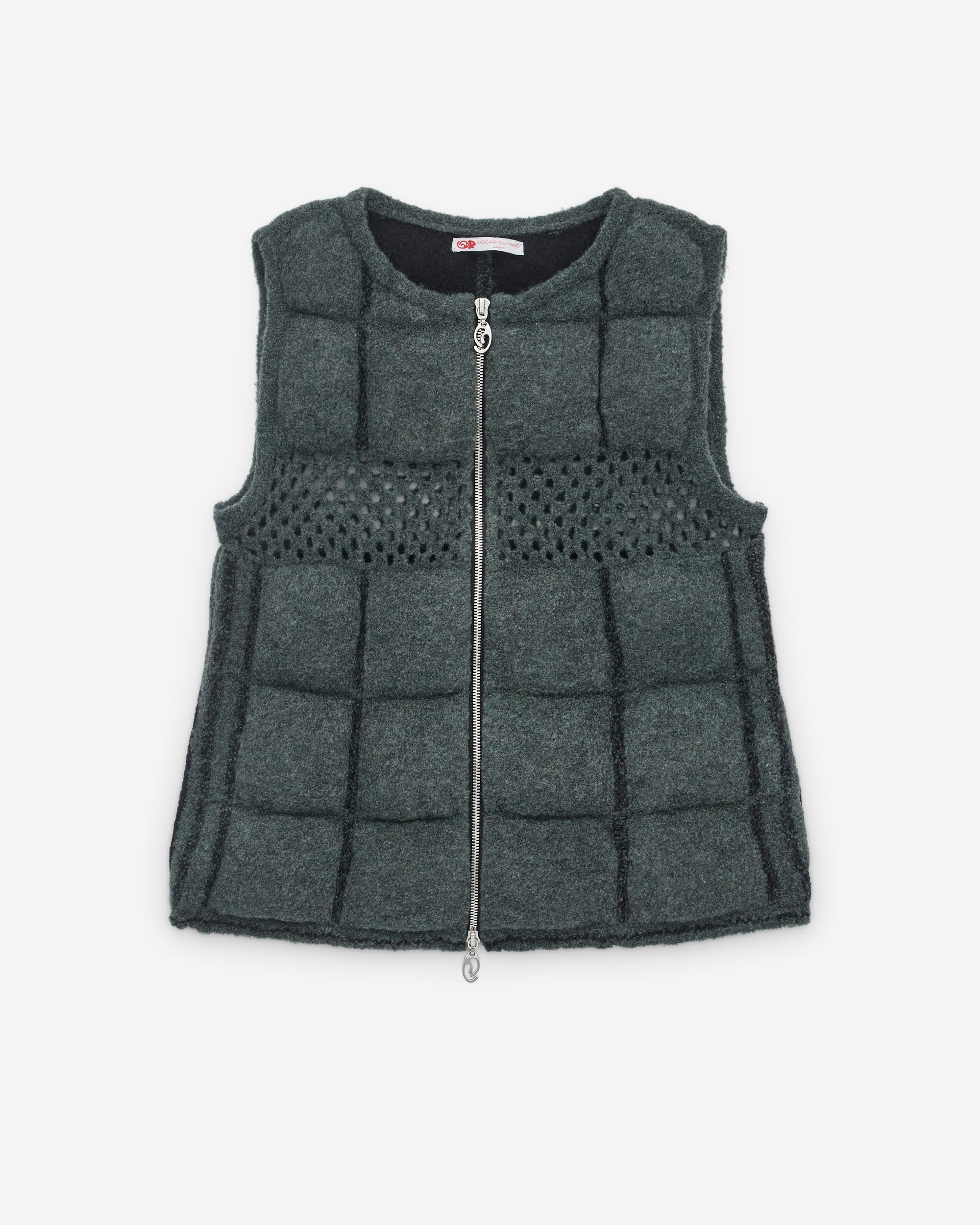 Collarless rounded necklineFront two way zip closurePadded insulation SleevelessWool mesh panel