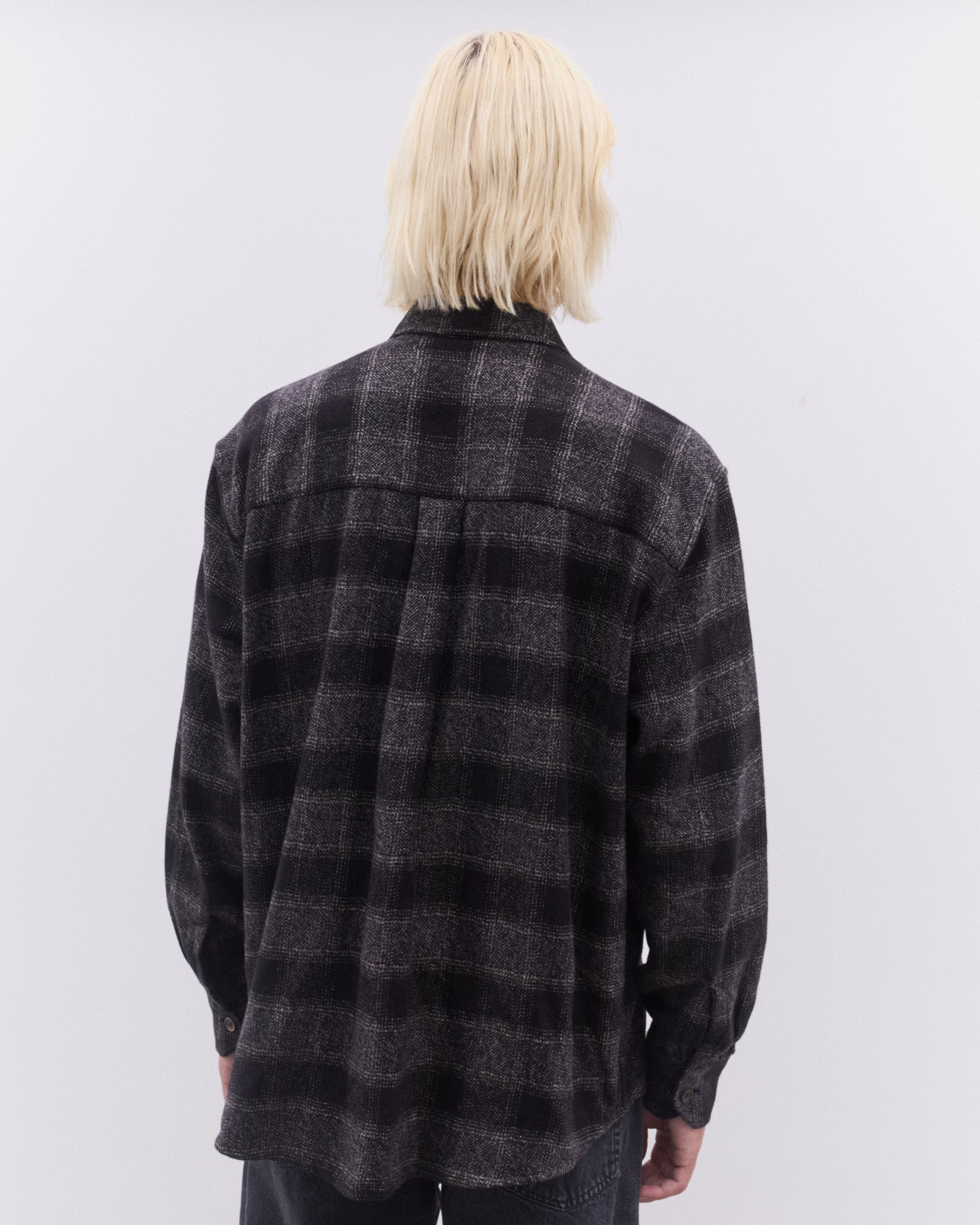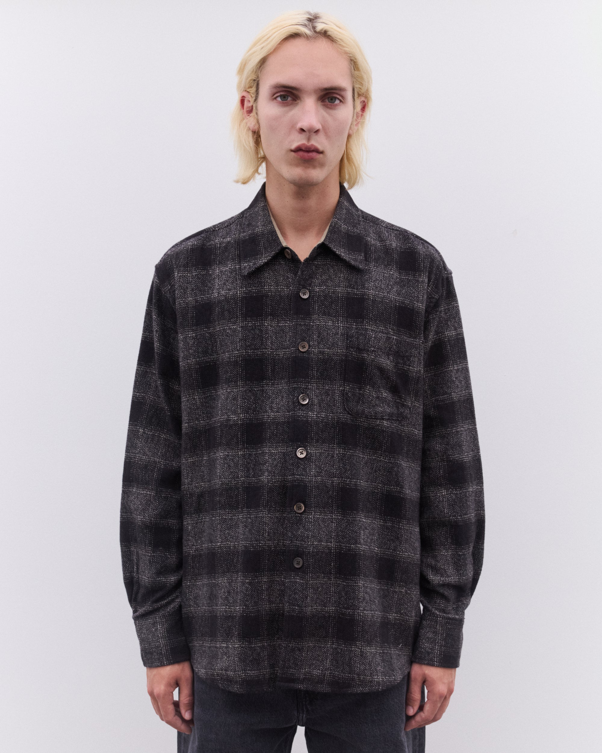 Check patternSingle chest pocketMother of pearl buttonsCurved hemMitered cuffsSlightly oversized fit