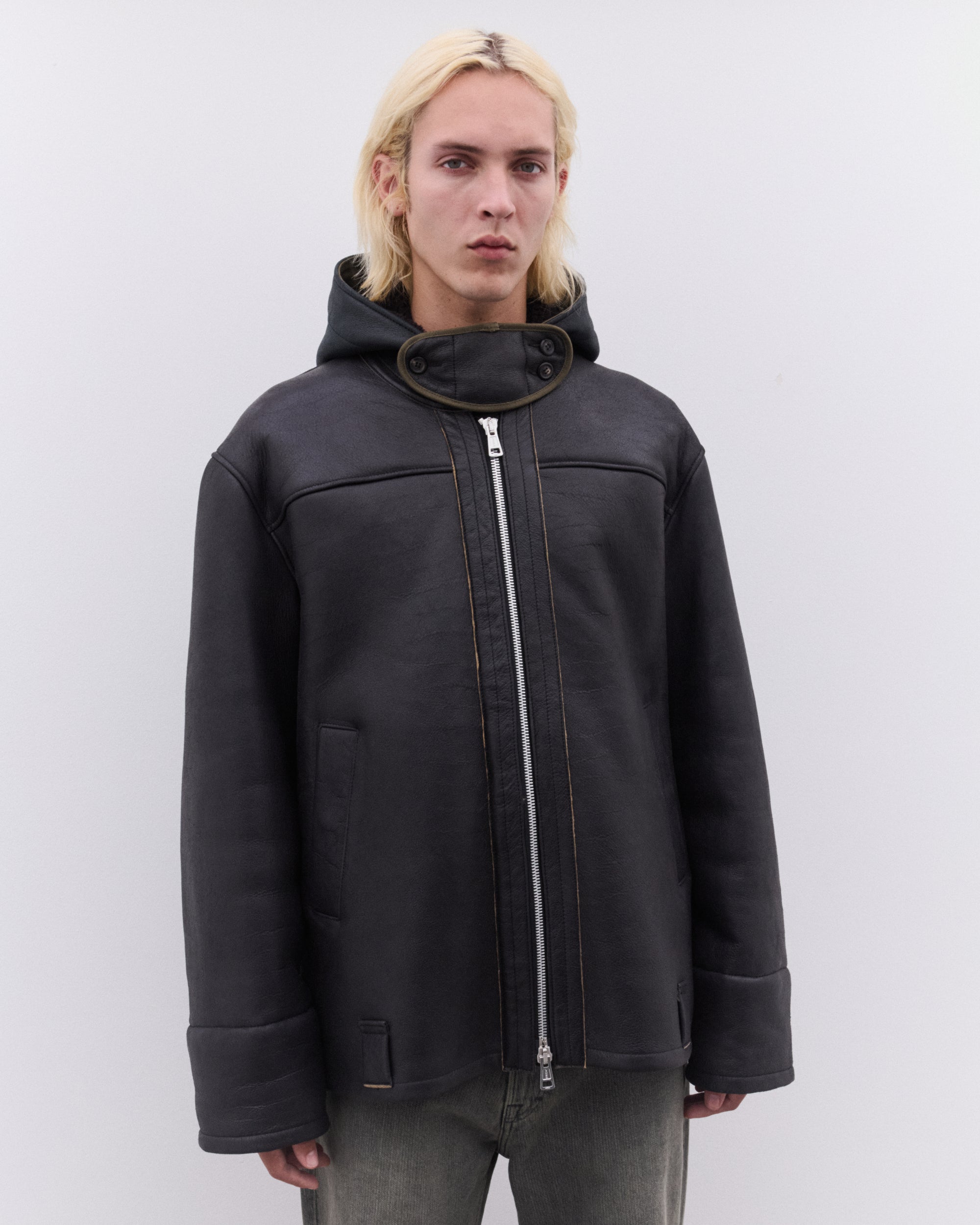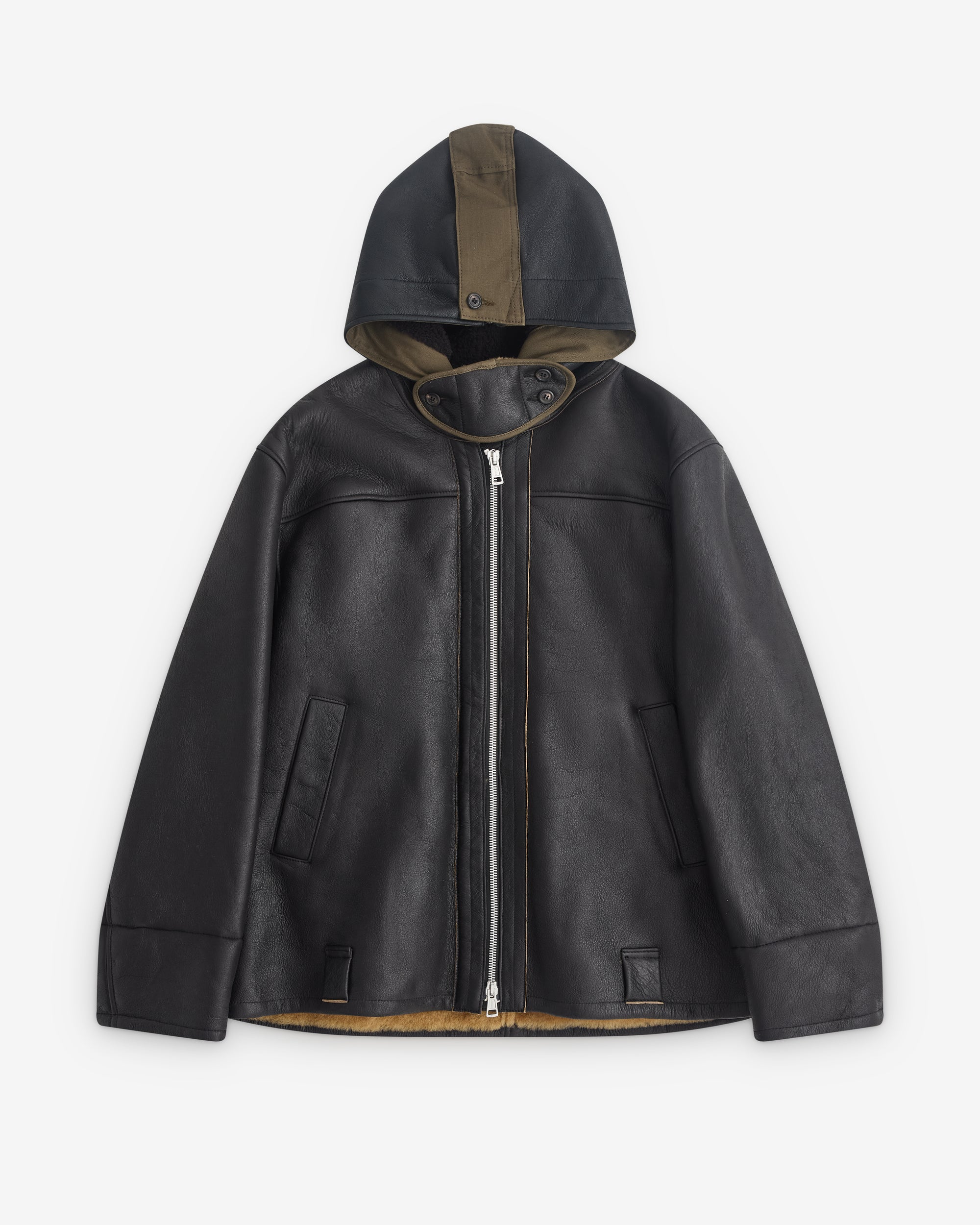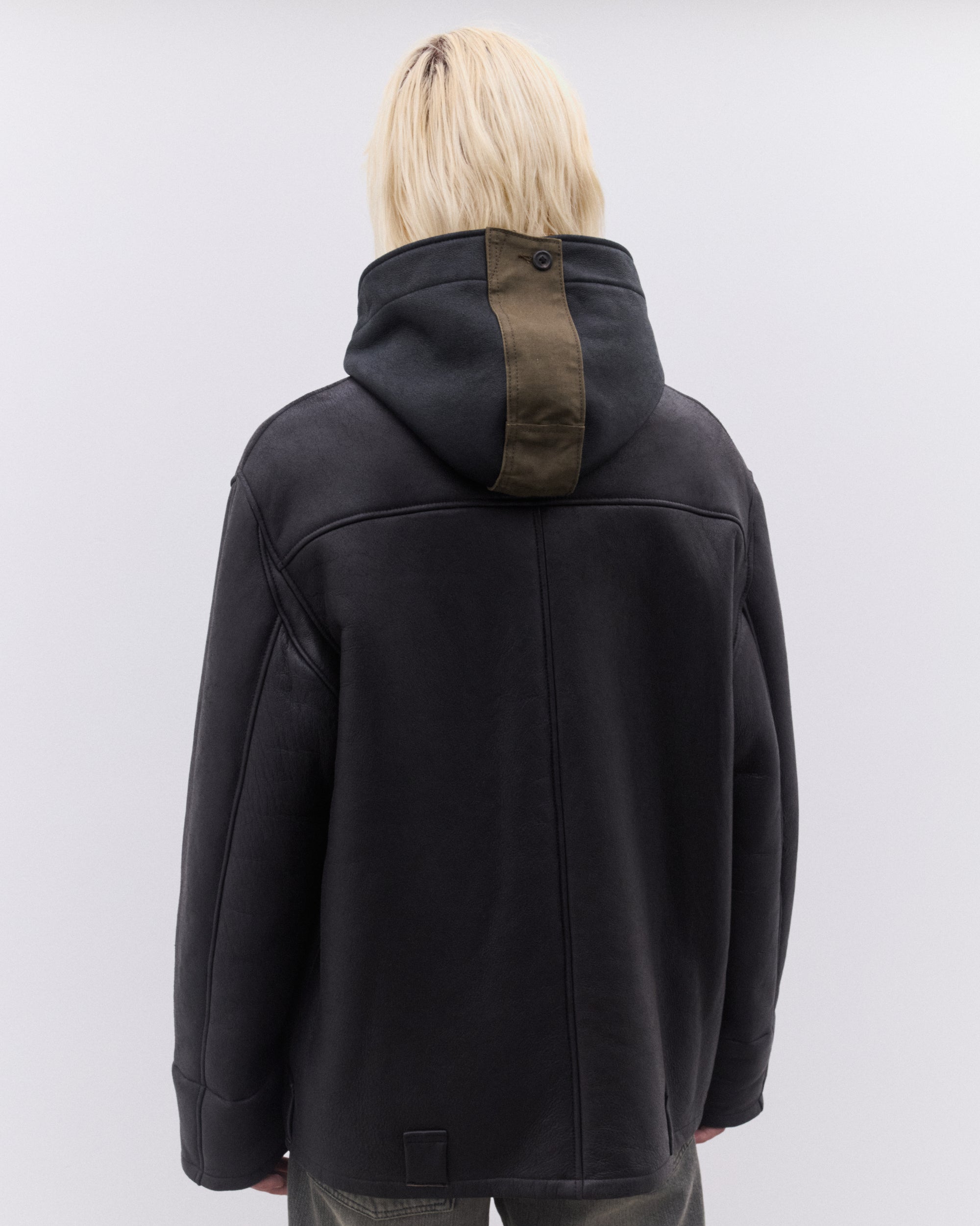 Hooded jacketStorm flap at neckFull length metal two way zipShearling lining Front pocketsCanvas panel at hood