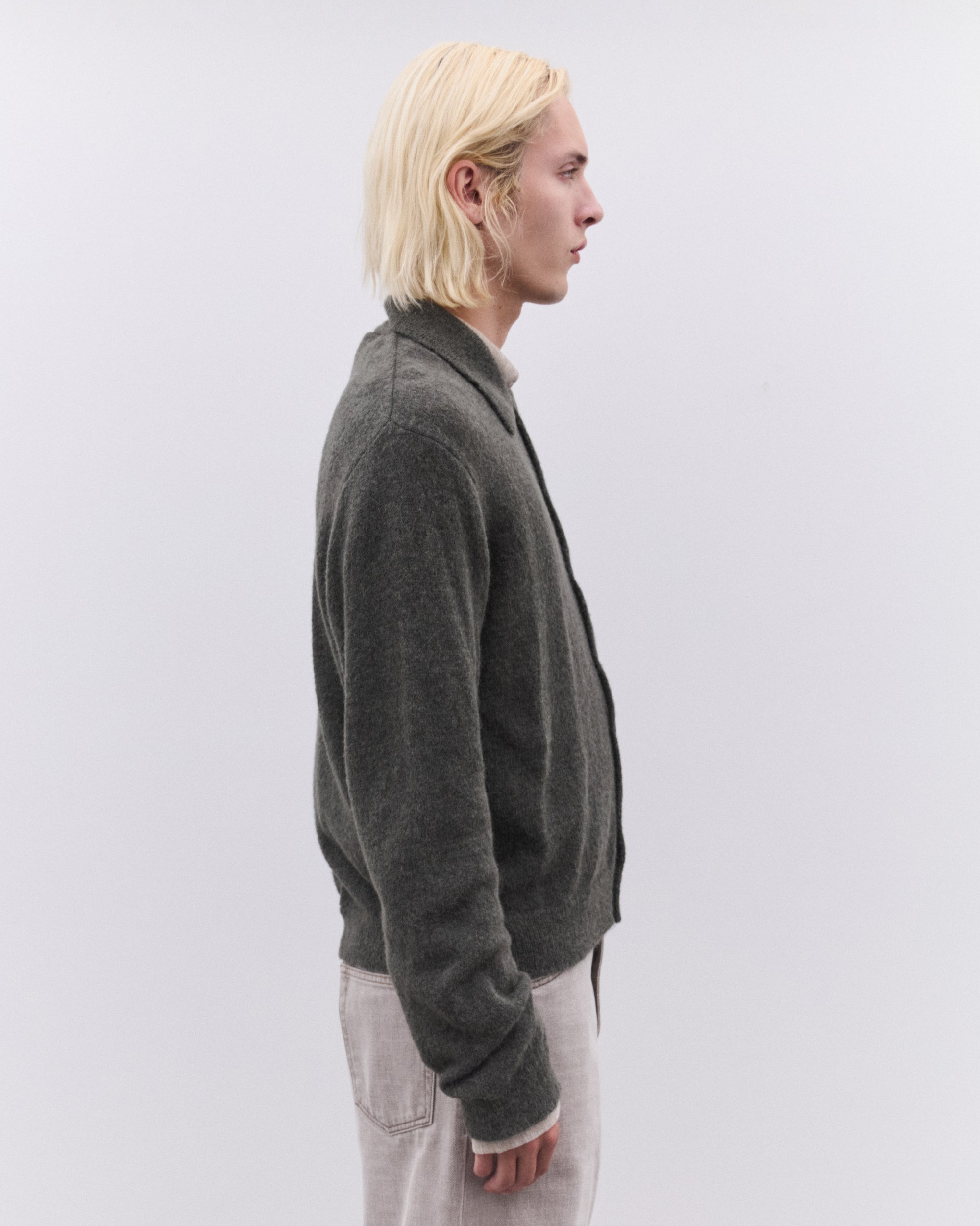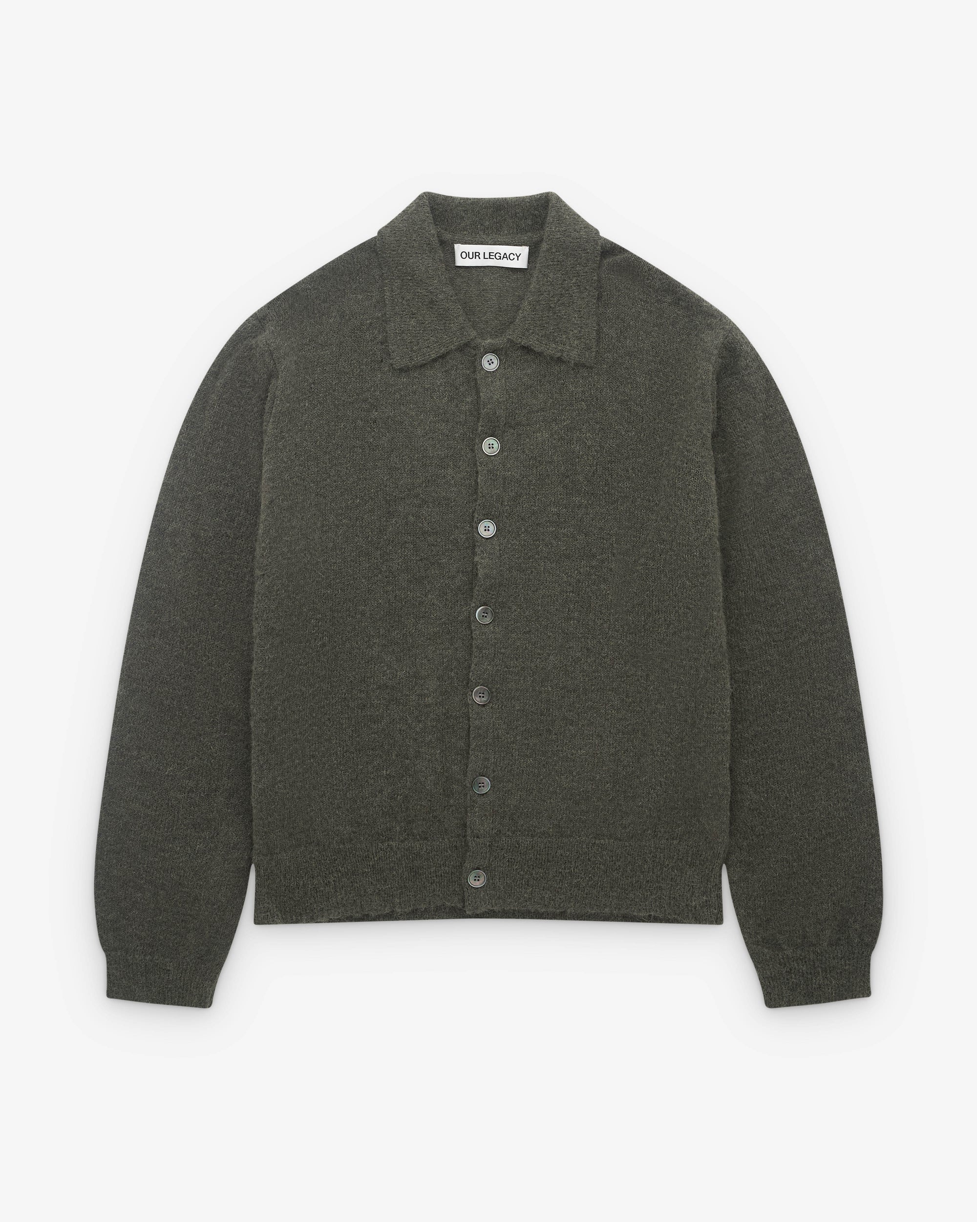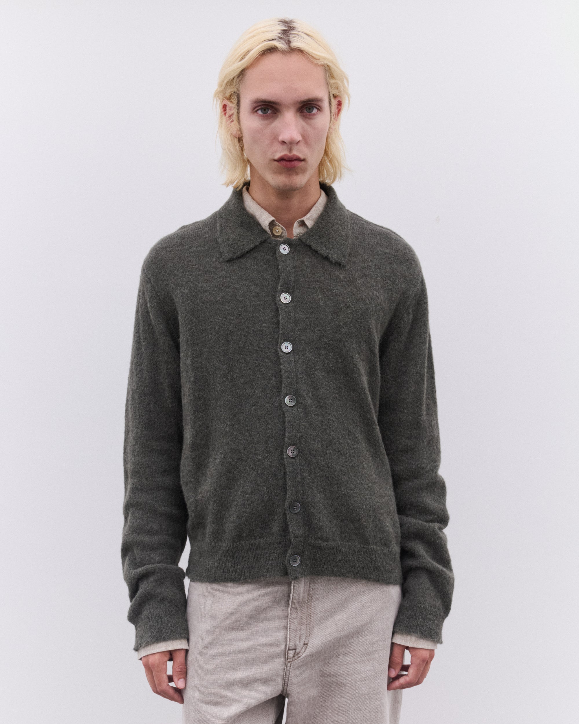 Delicate fabricFine knitPeaked collarHorn buttonsStraight deep ribbed hemRelaxed, boxy fit
