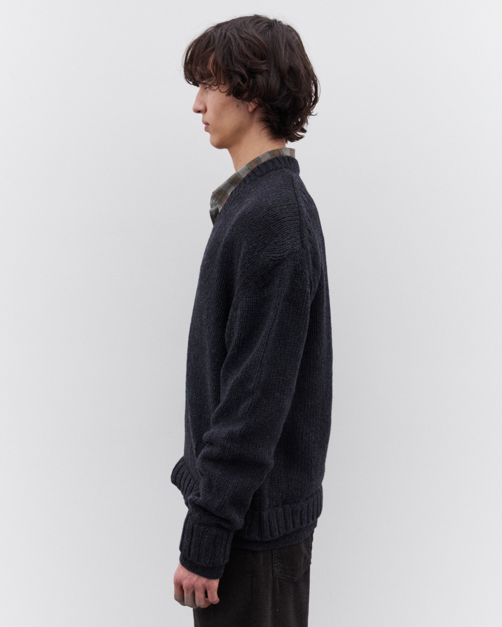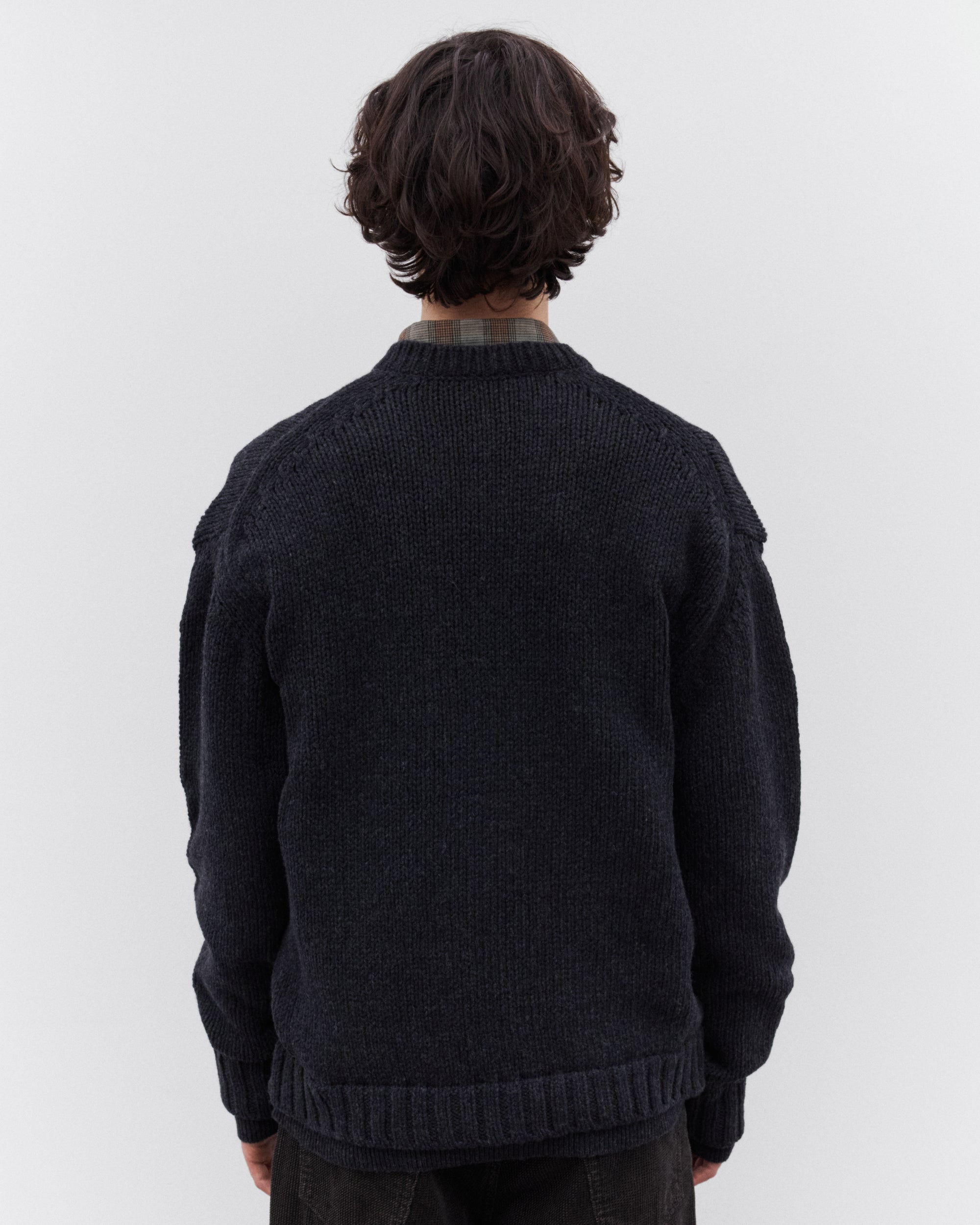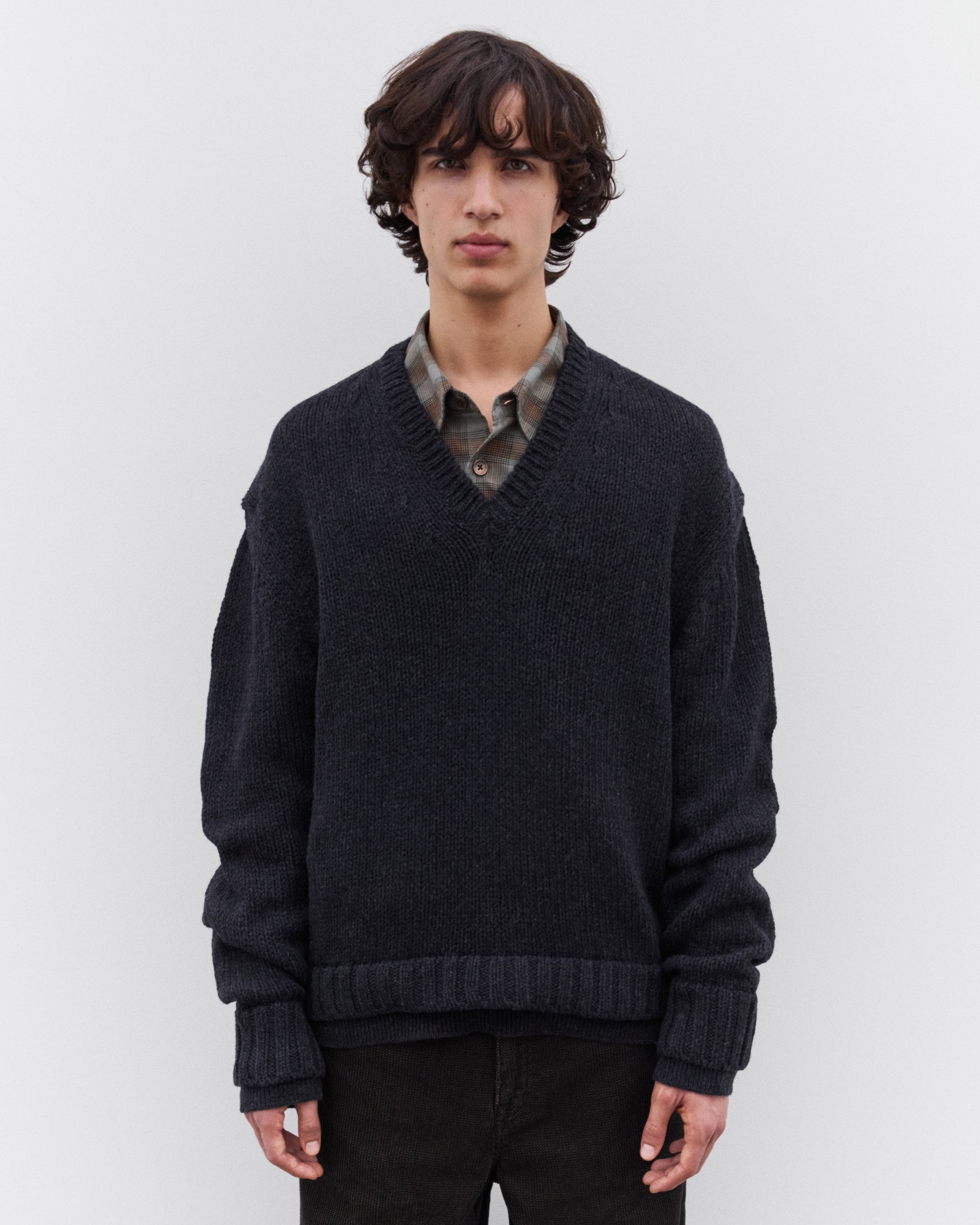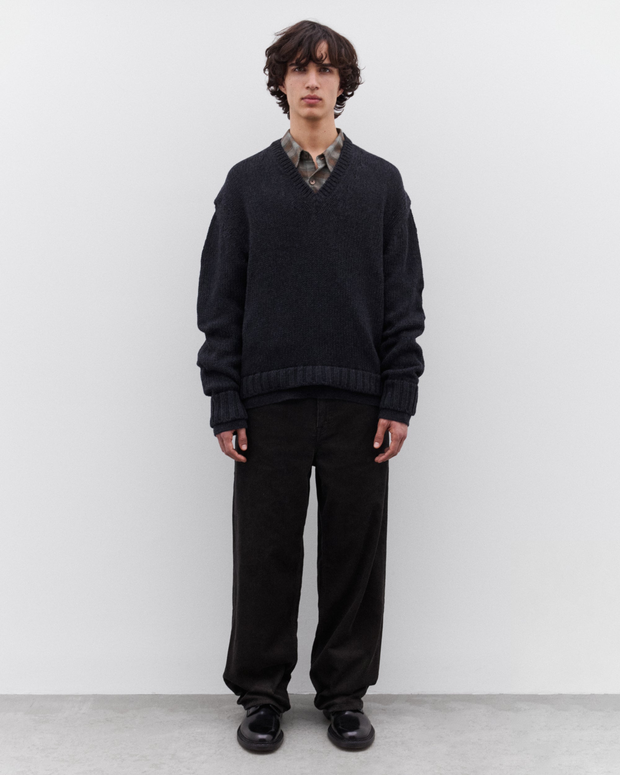 Ribbed knit v-neck lineLong sleevesLayered cuffs and hemBoxy fit
