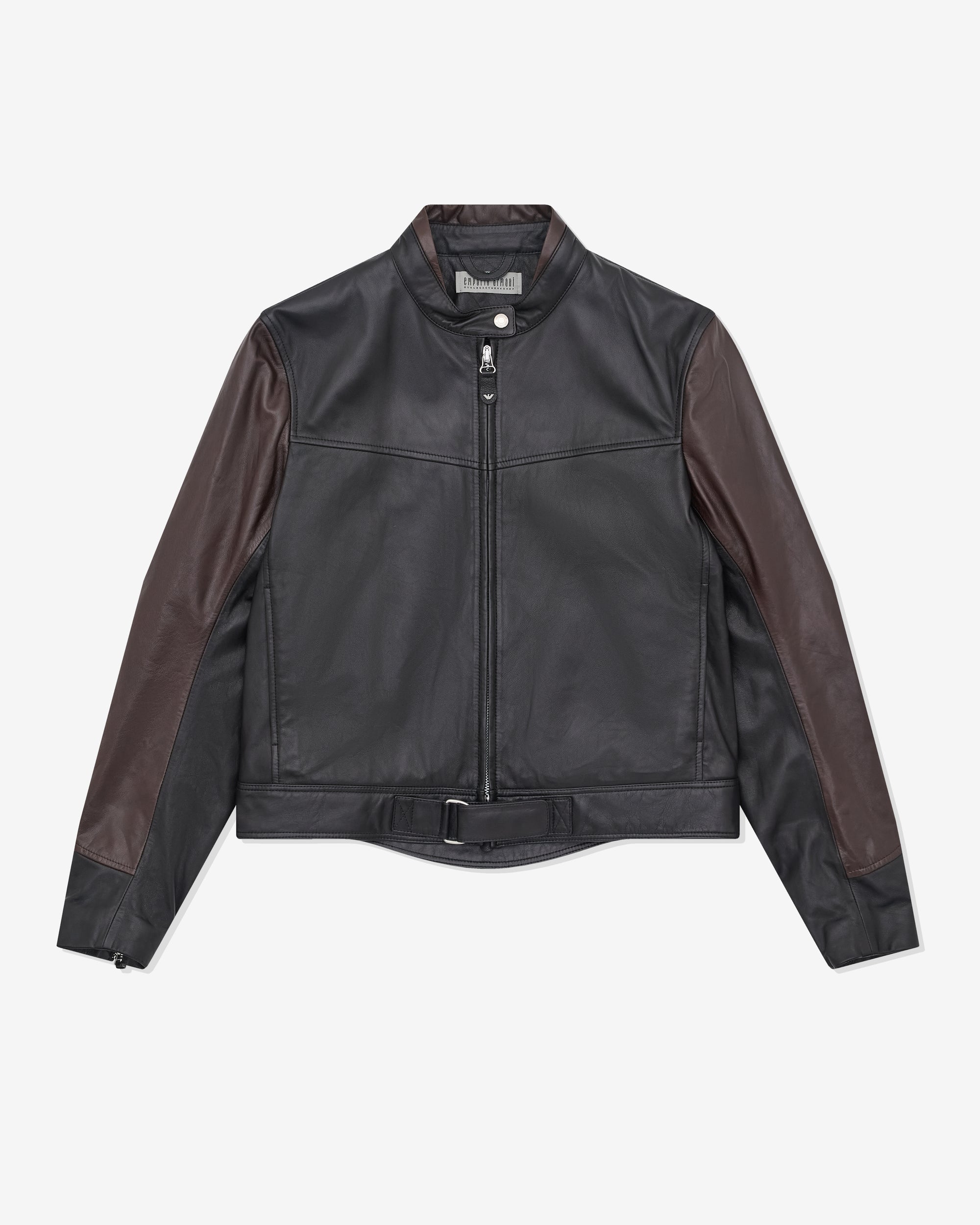 Stand collarCroppedZip and press stud fasteningBuckle at waistZip detail at cuffSilver-tone hardware