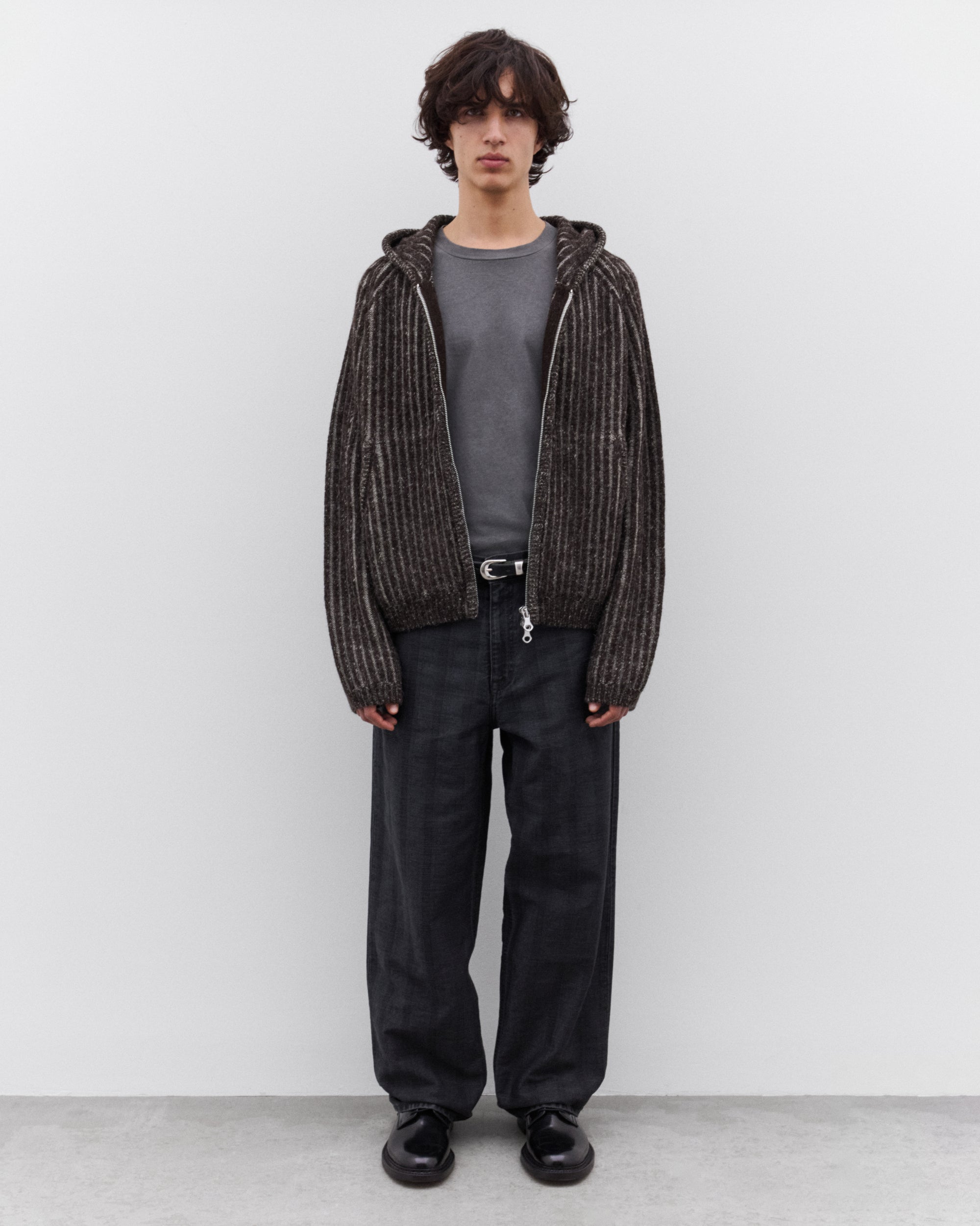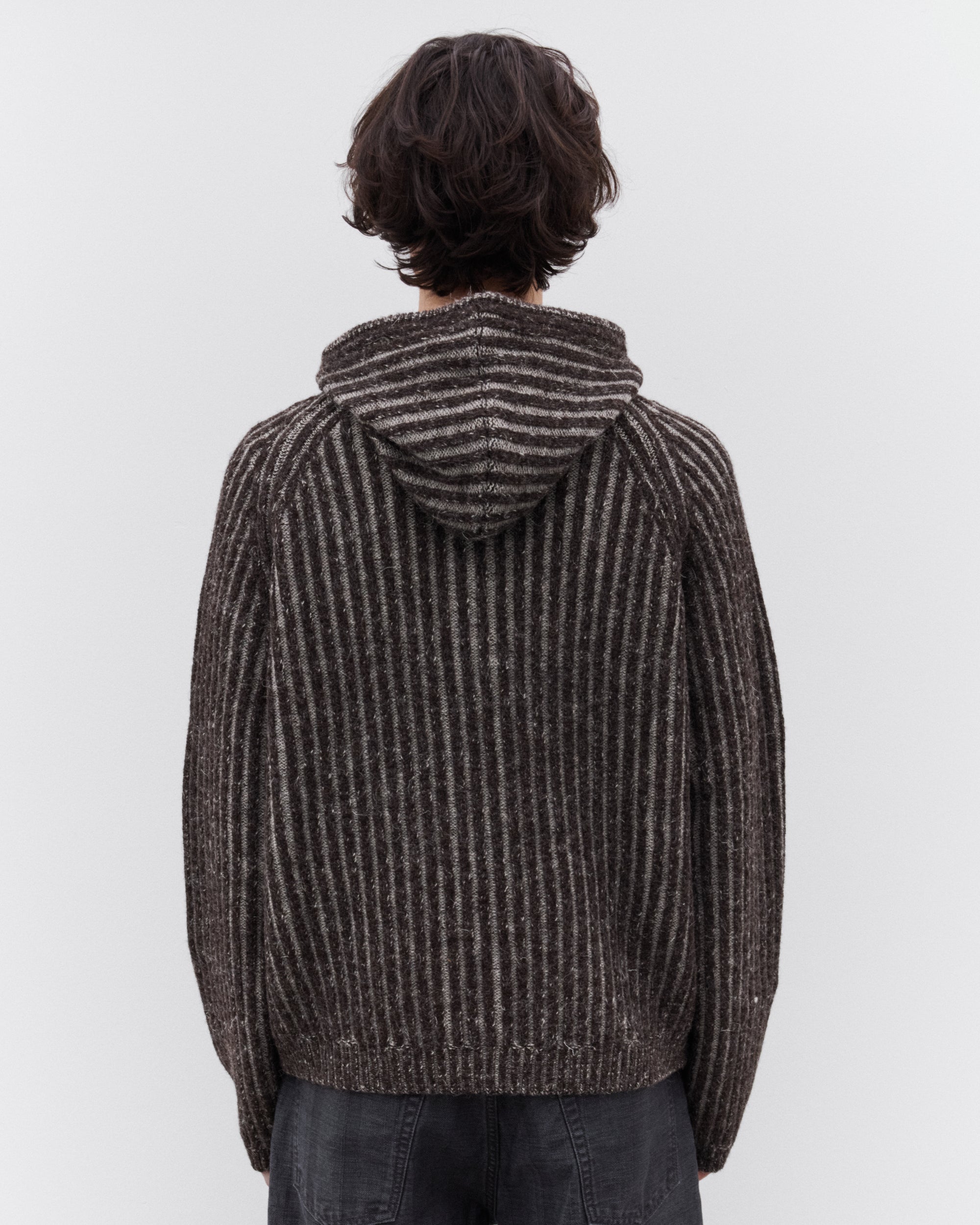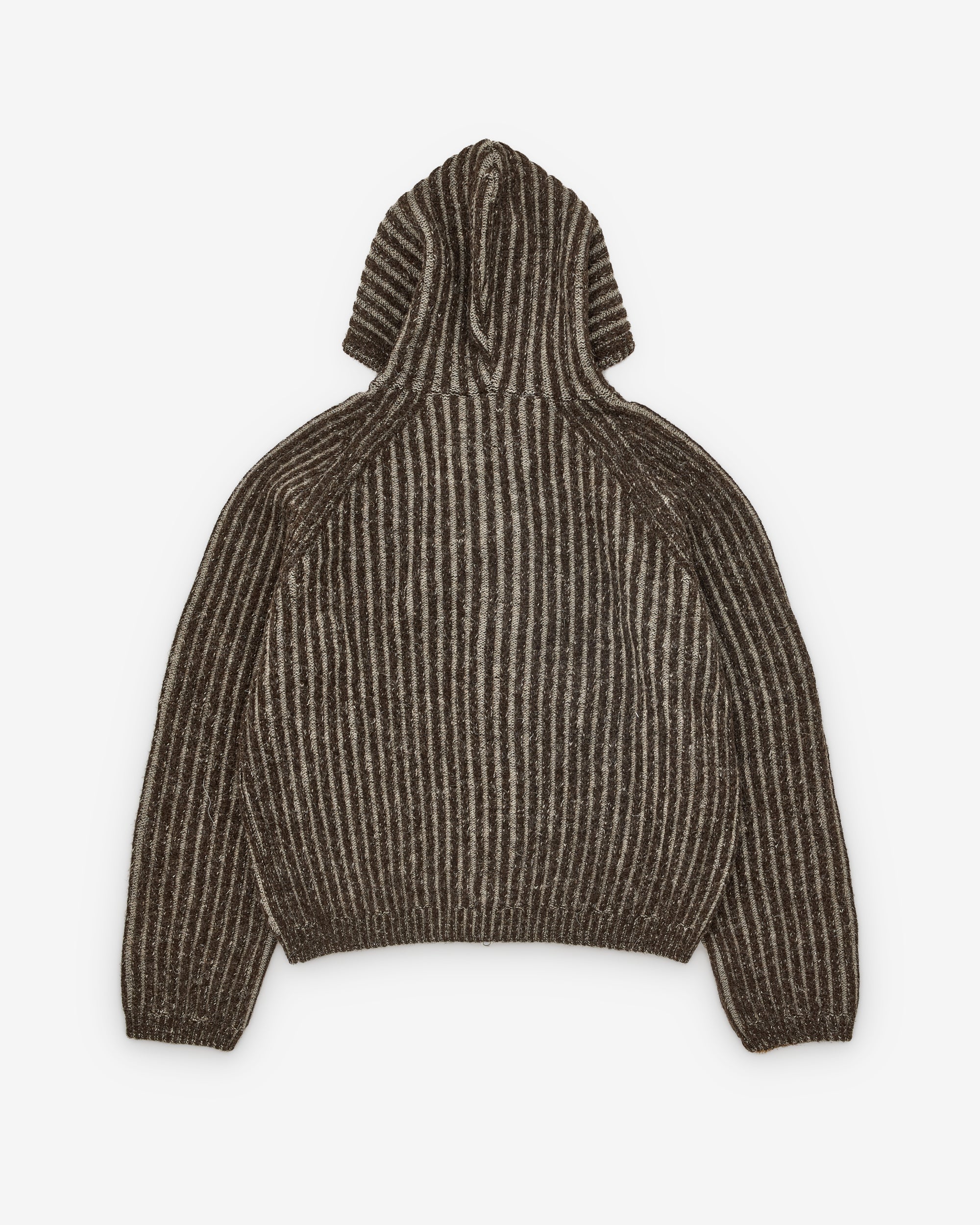 Loose guage ribbed knit fabricHooded styleFront two way zip closureRibbed cuffs and hemFront slip pockets