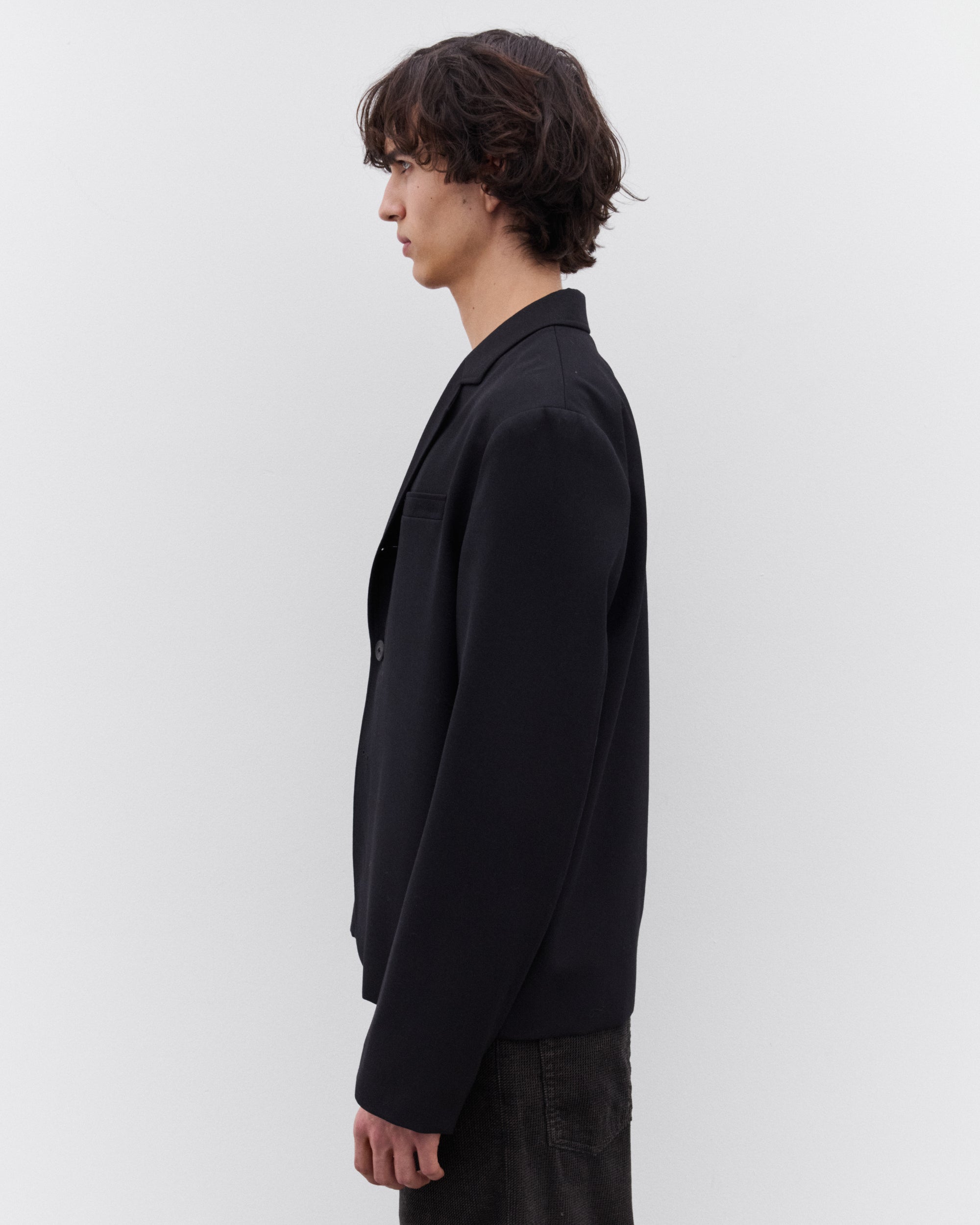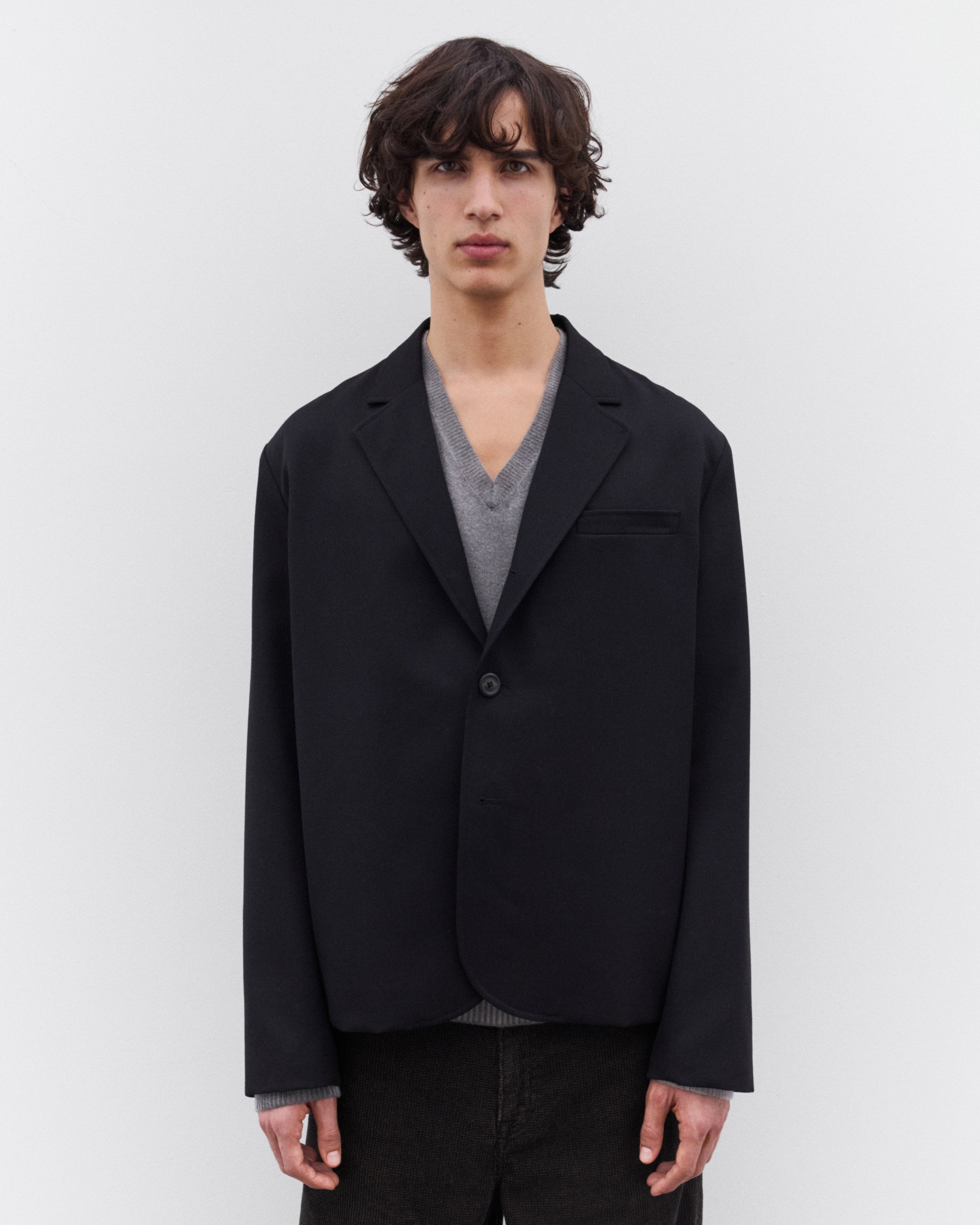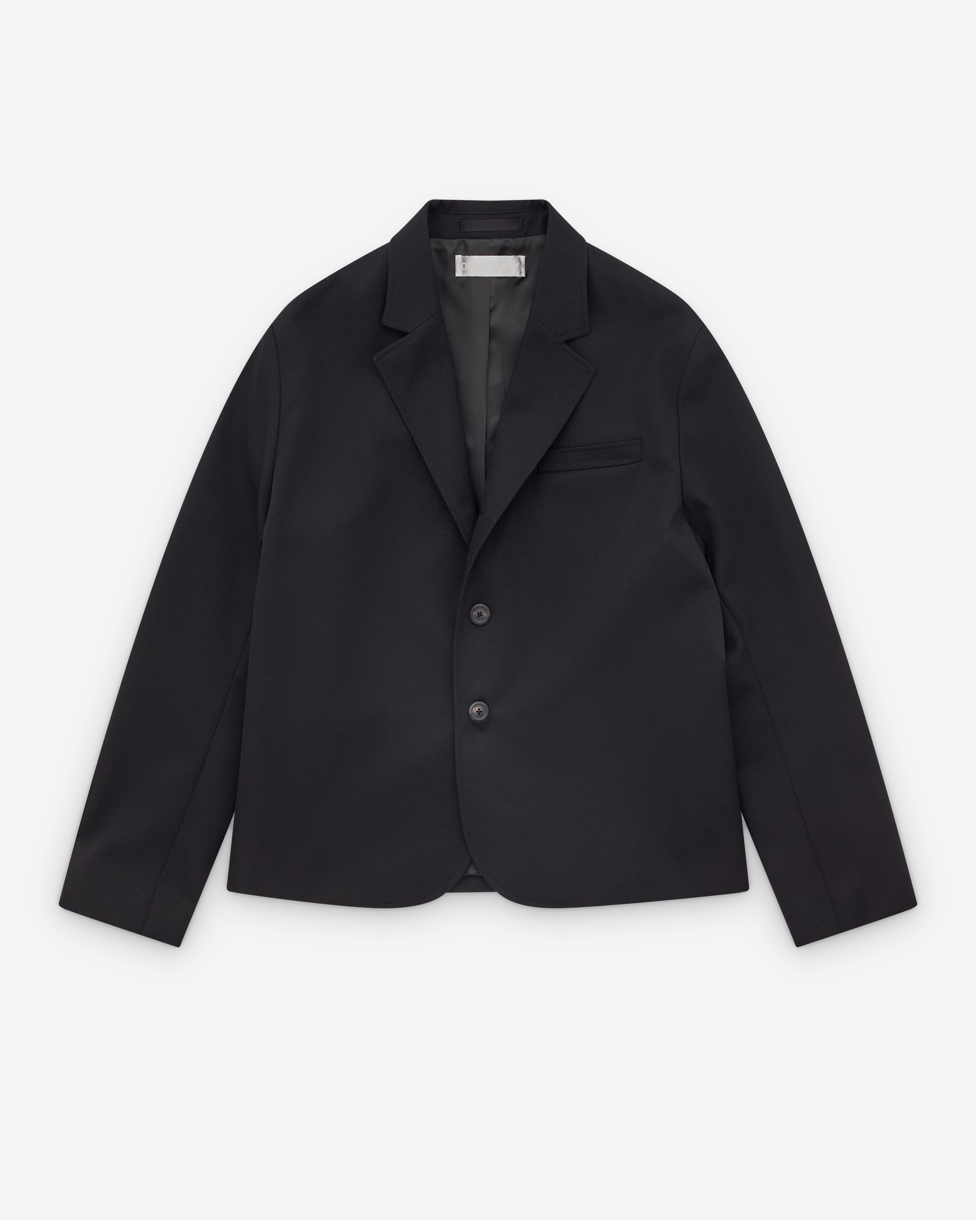 Notched lapelRolling 3 button closureHorn buttonsAngled welt chest pocketFully linedBoxy, cropped fit