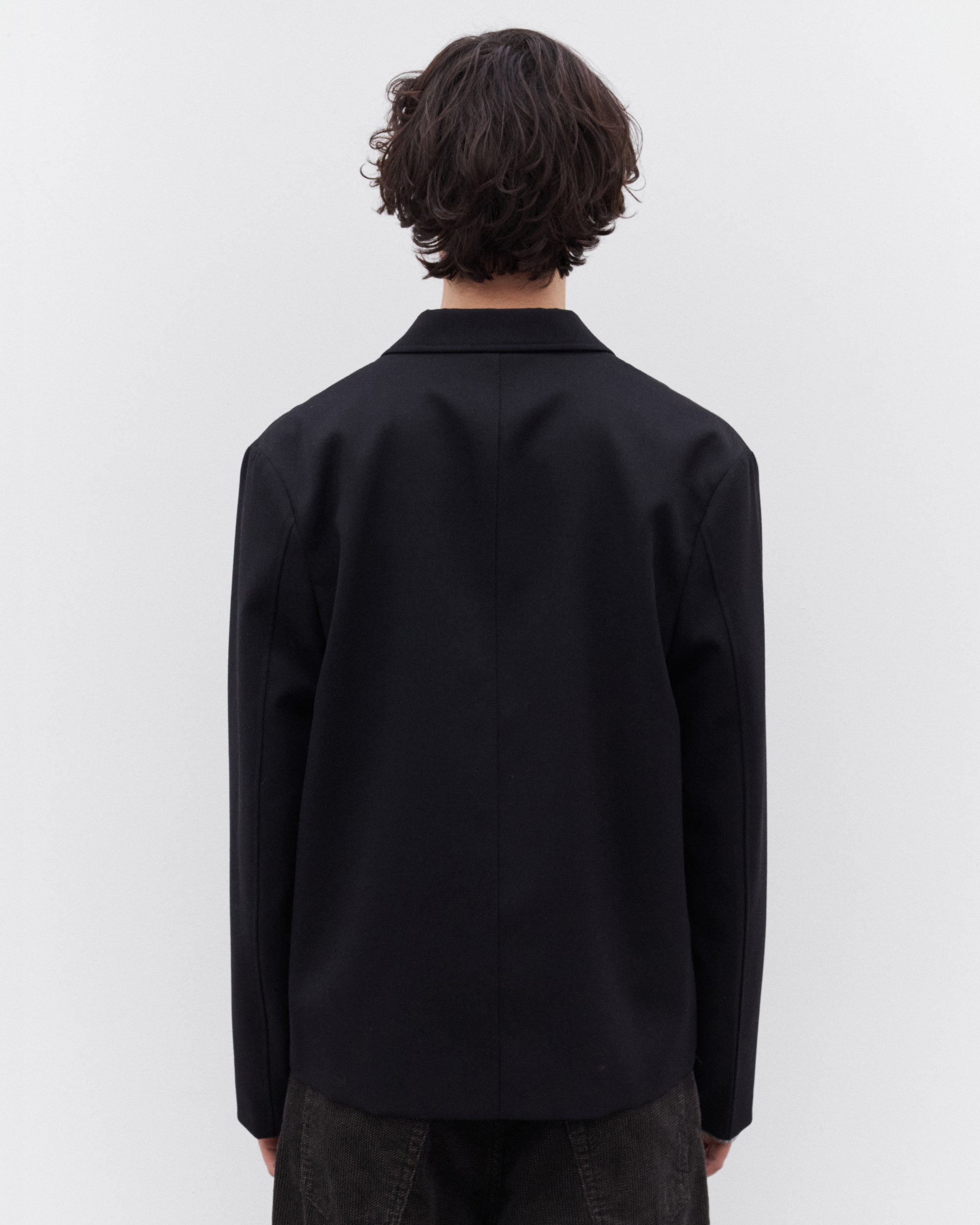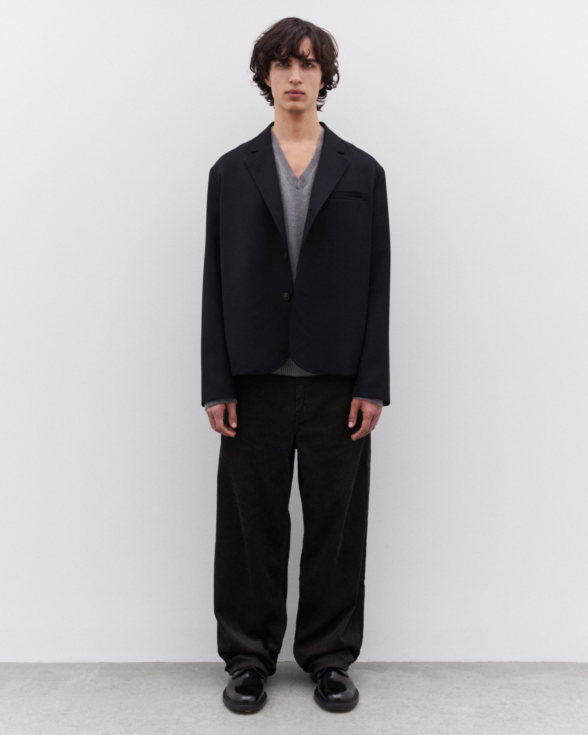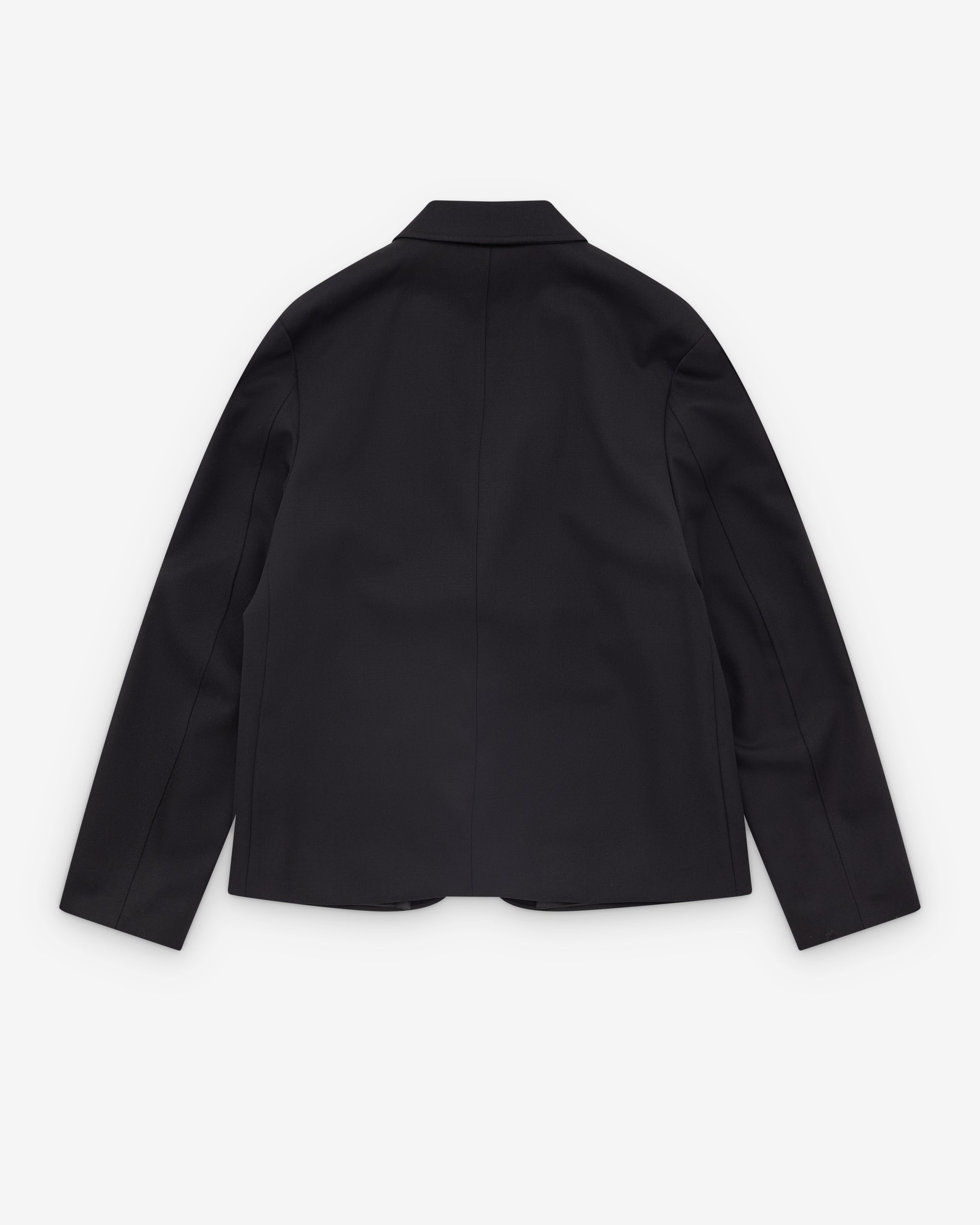 Notched lapelRolling 3 button closureHorn buttonsAngled welt chest pocketFully linedBoxy, cropped fit