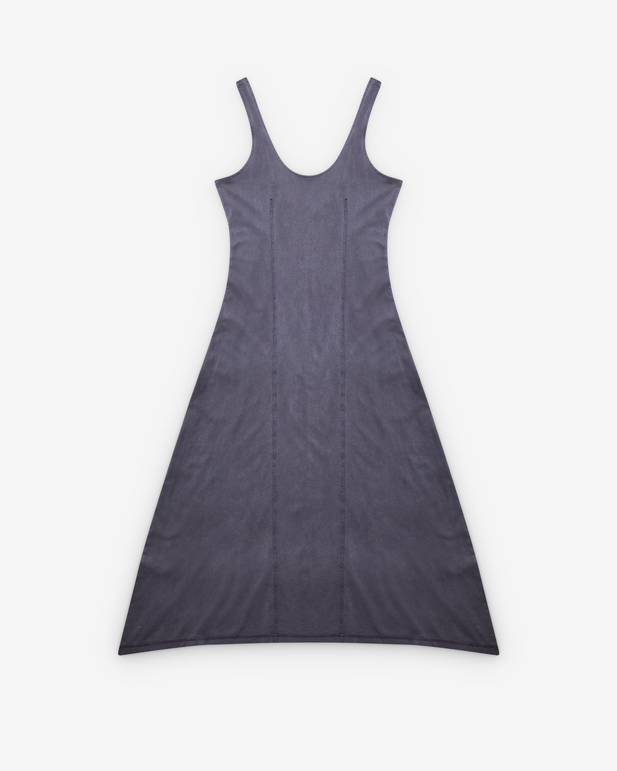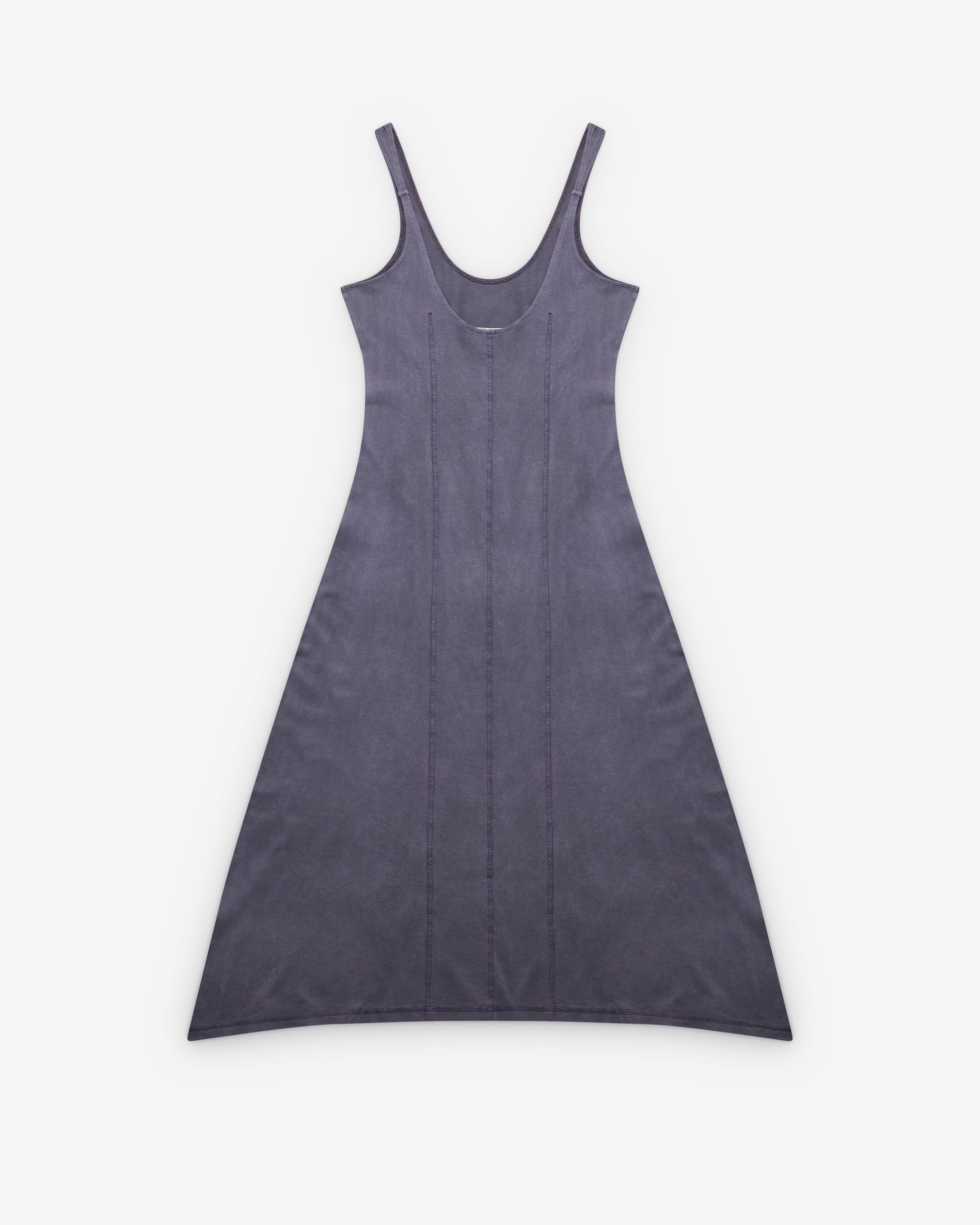 Pigment dyed Low front and back neckline Coverstitched darts front and back Flatlocked center back seam Back strap detail with loop creating a triangular shape Fitted chest and waist with A-line drape