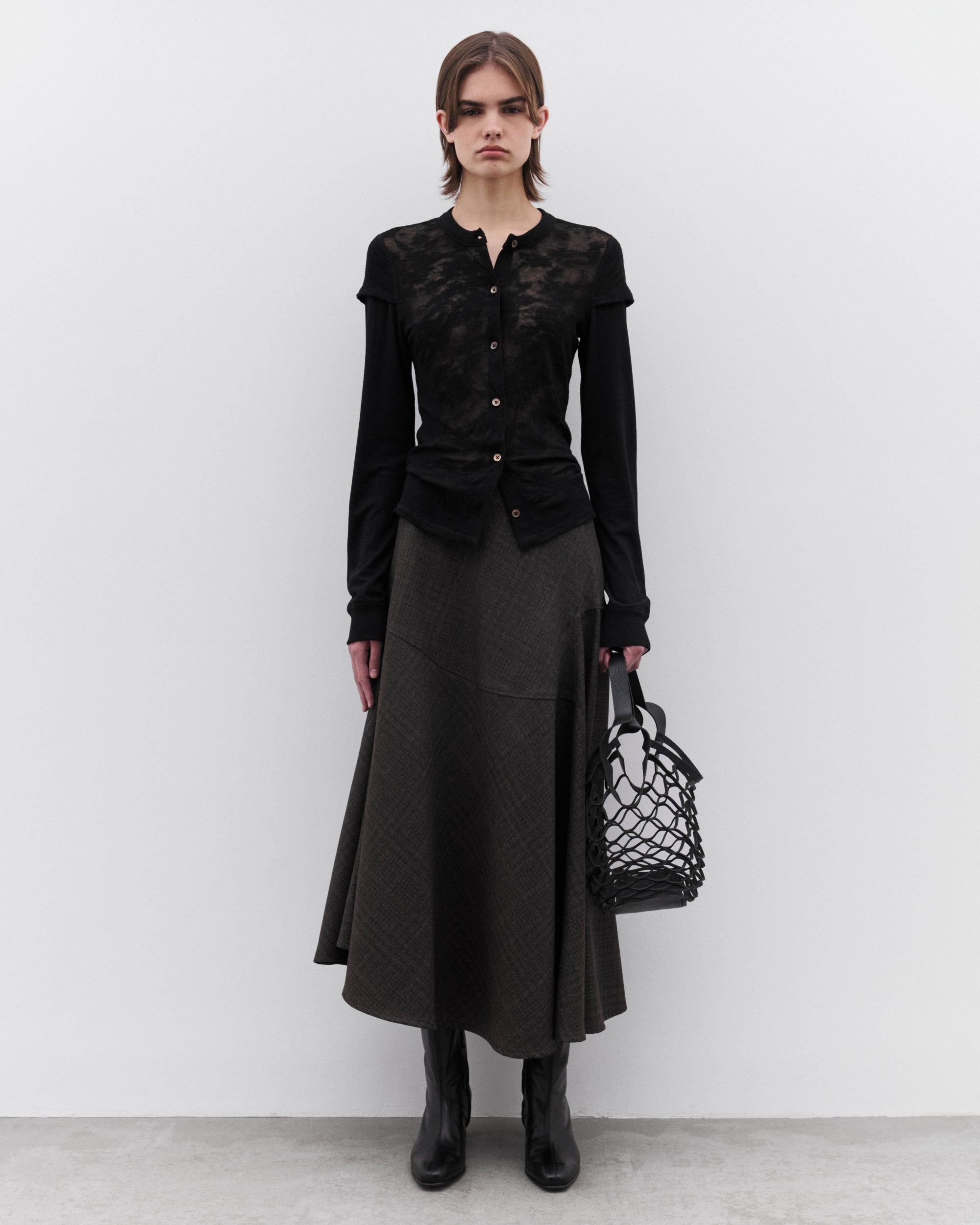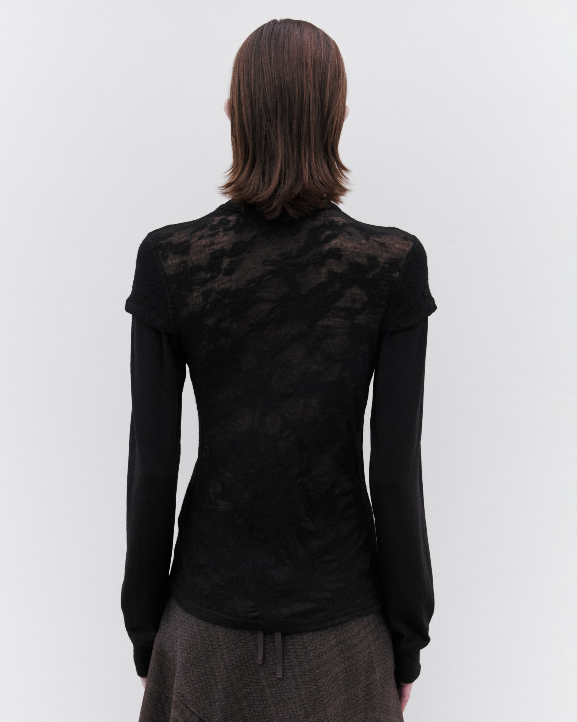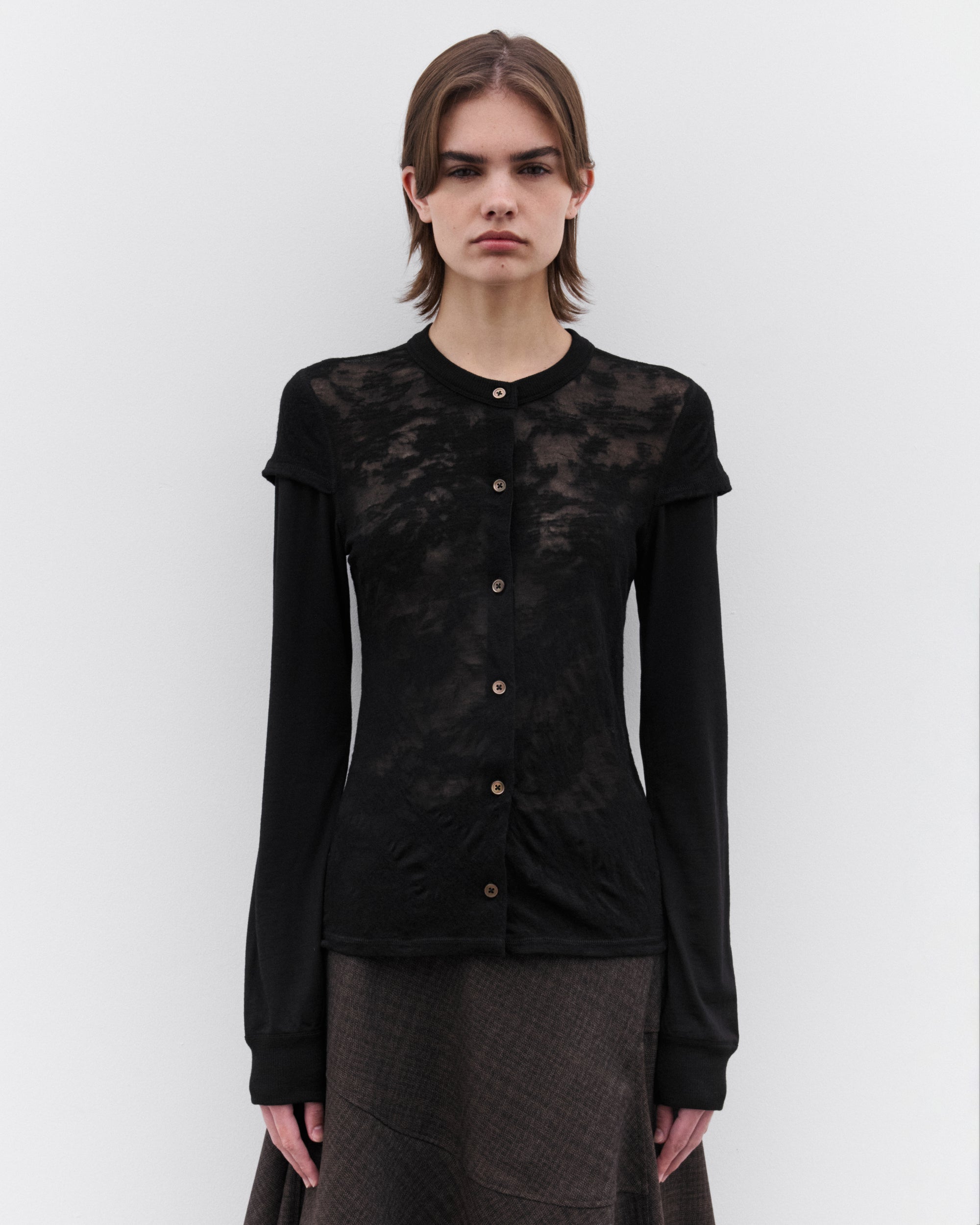 Rounded necklineFront button up closureLayered long sleeveSemi sheer pattern fabric