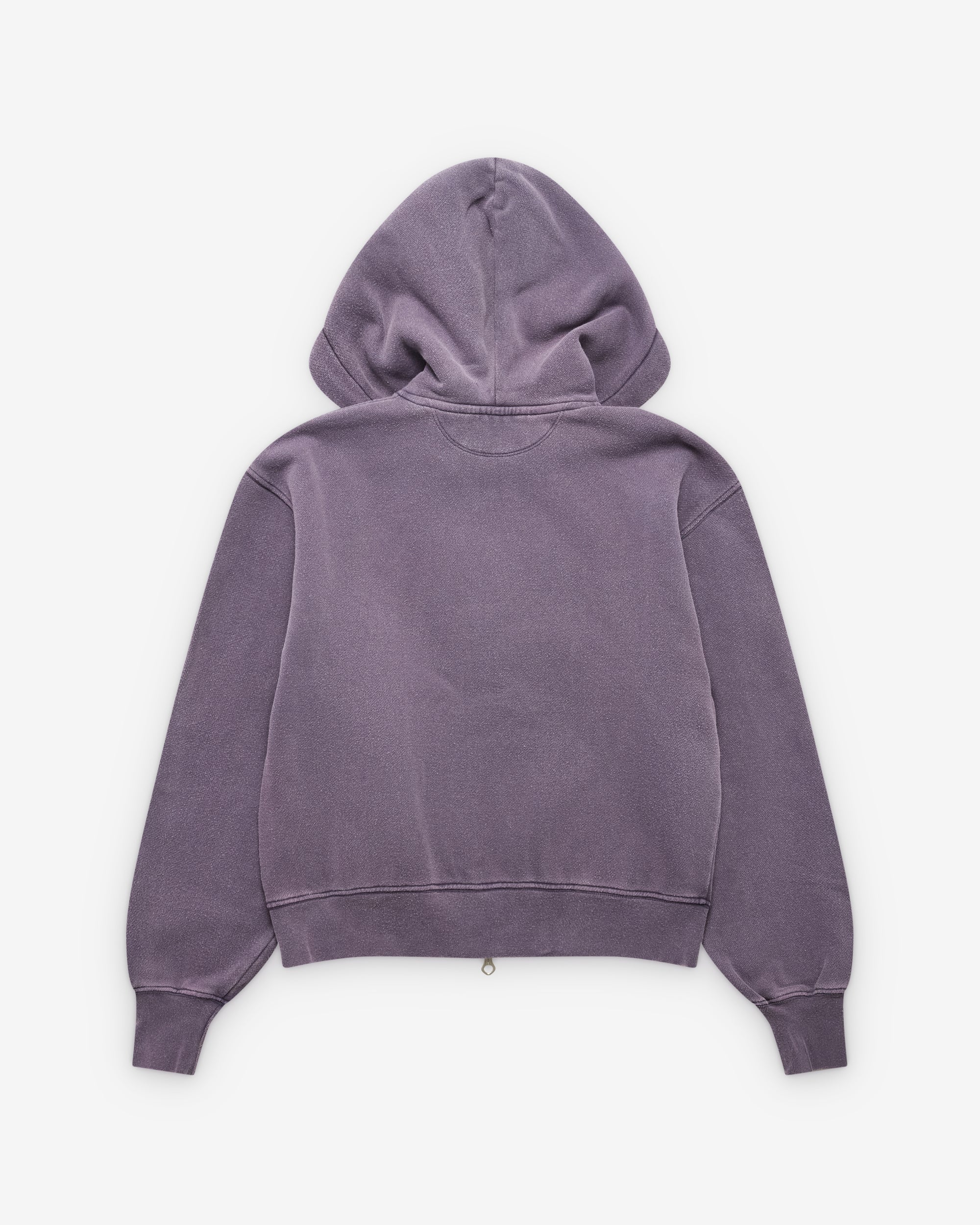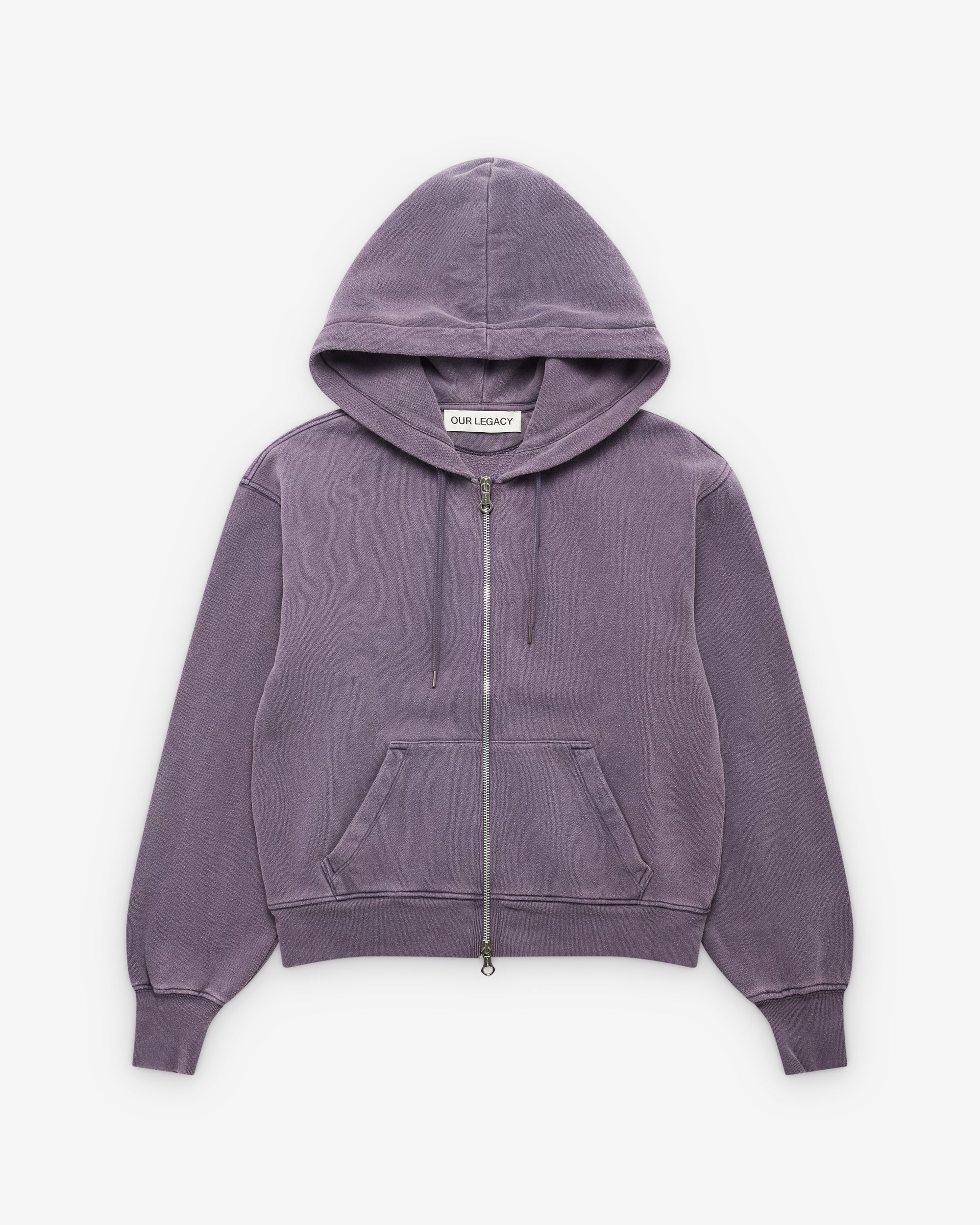 Drawstring hoodTwo way zipKangaroo pocketRibbed cuffs and hemDropped shouldersBoxy, cropped fit