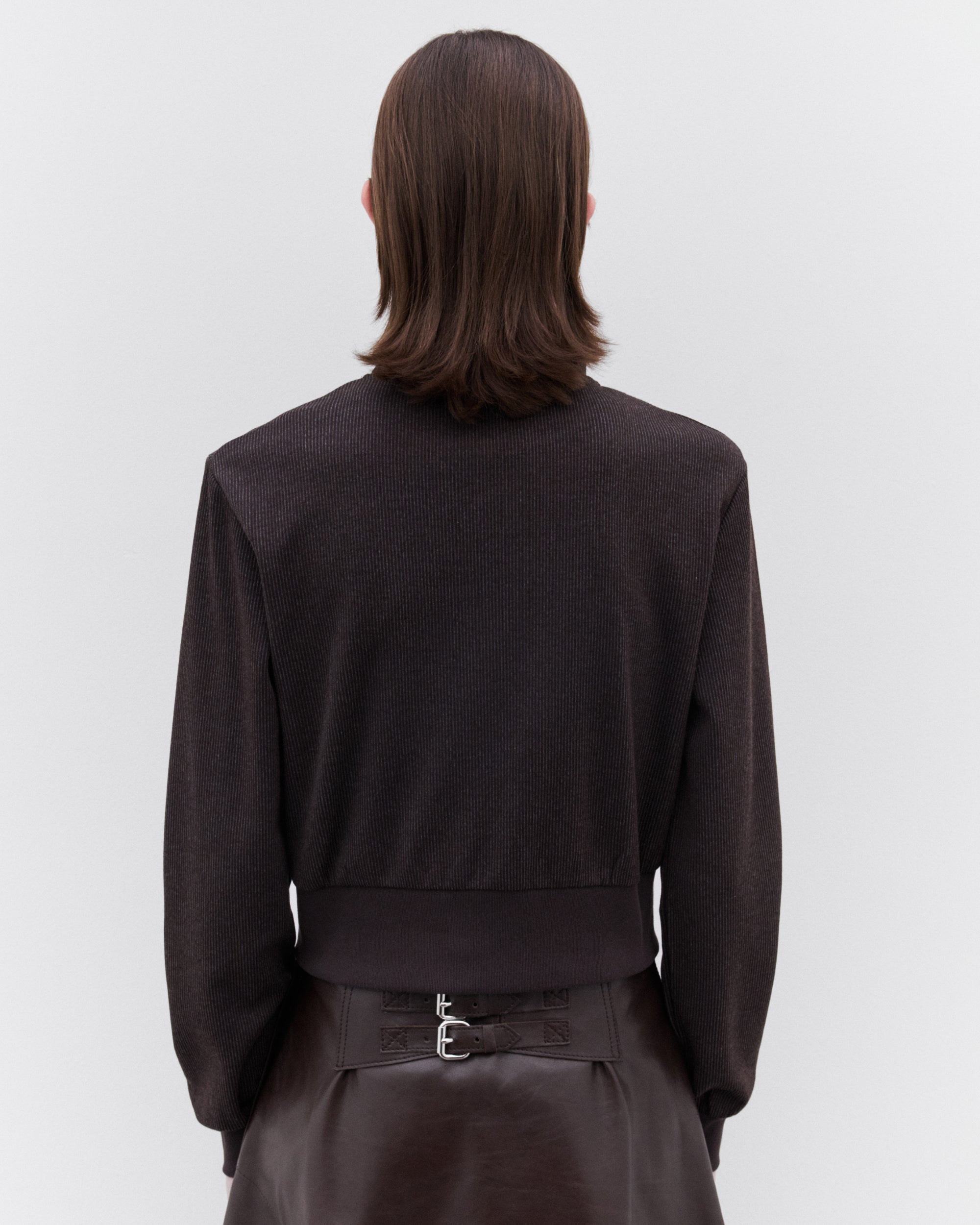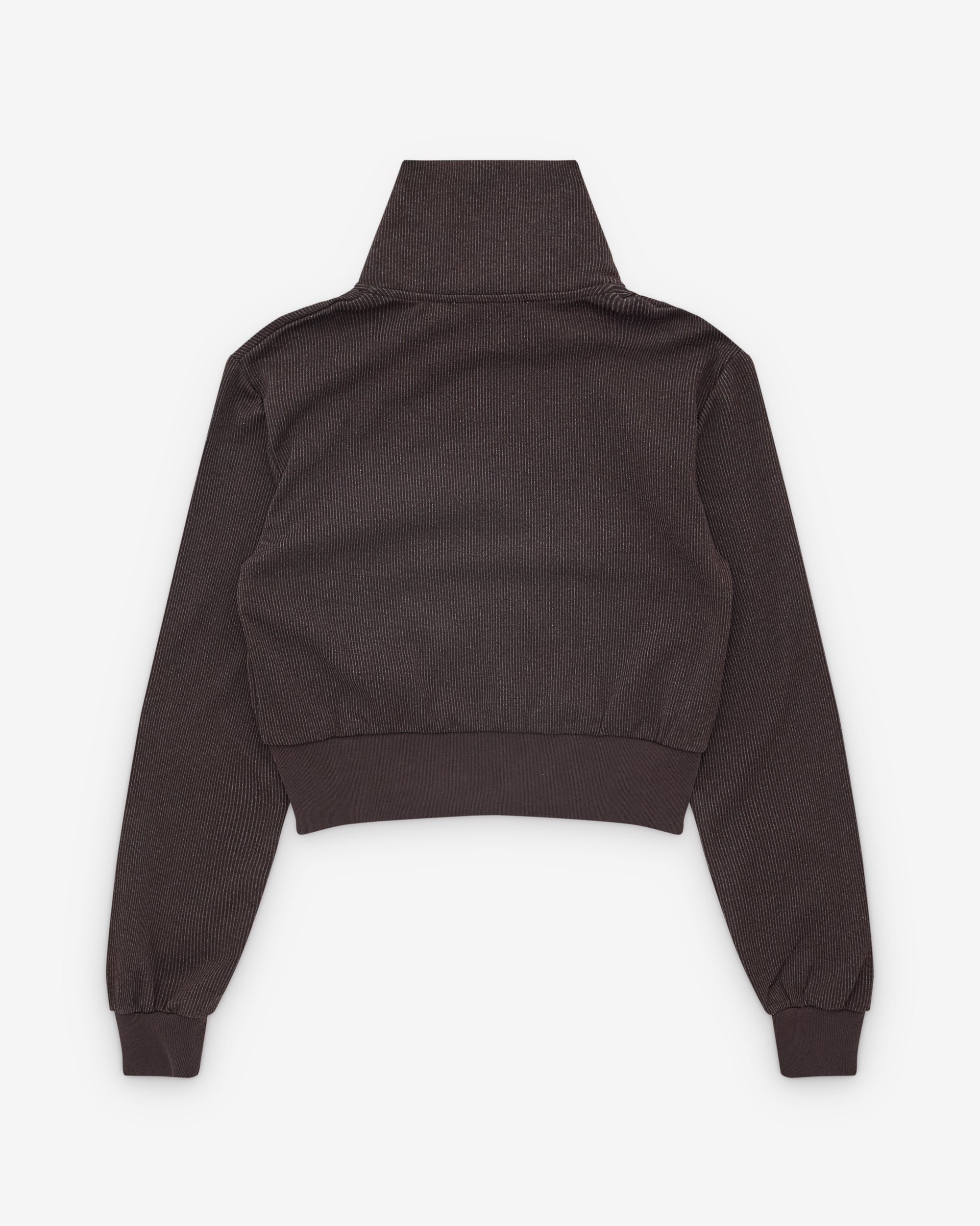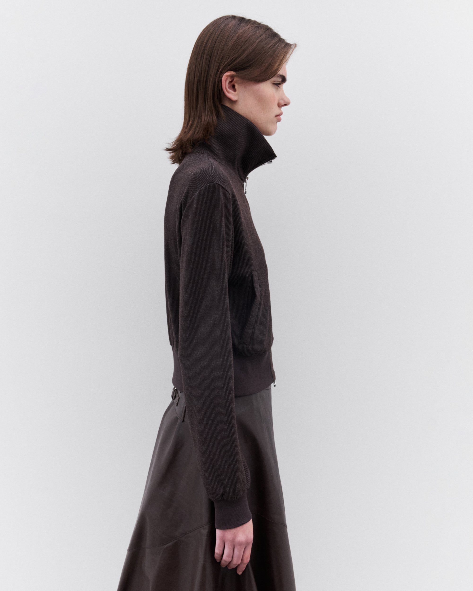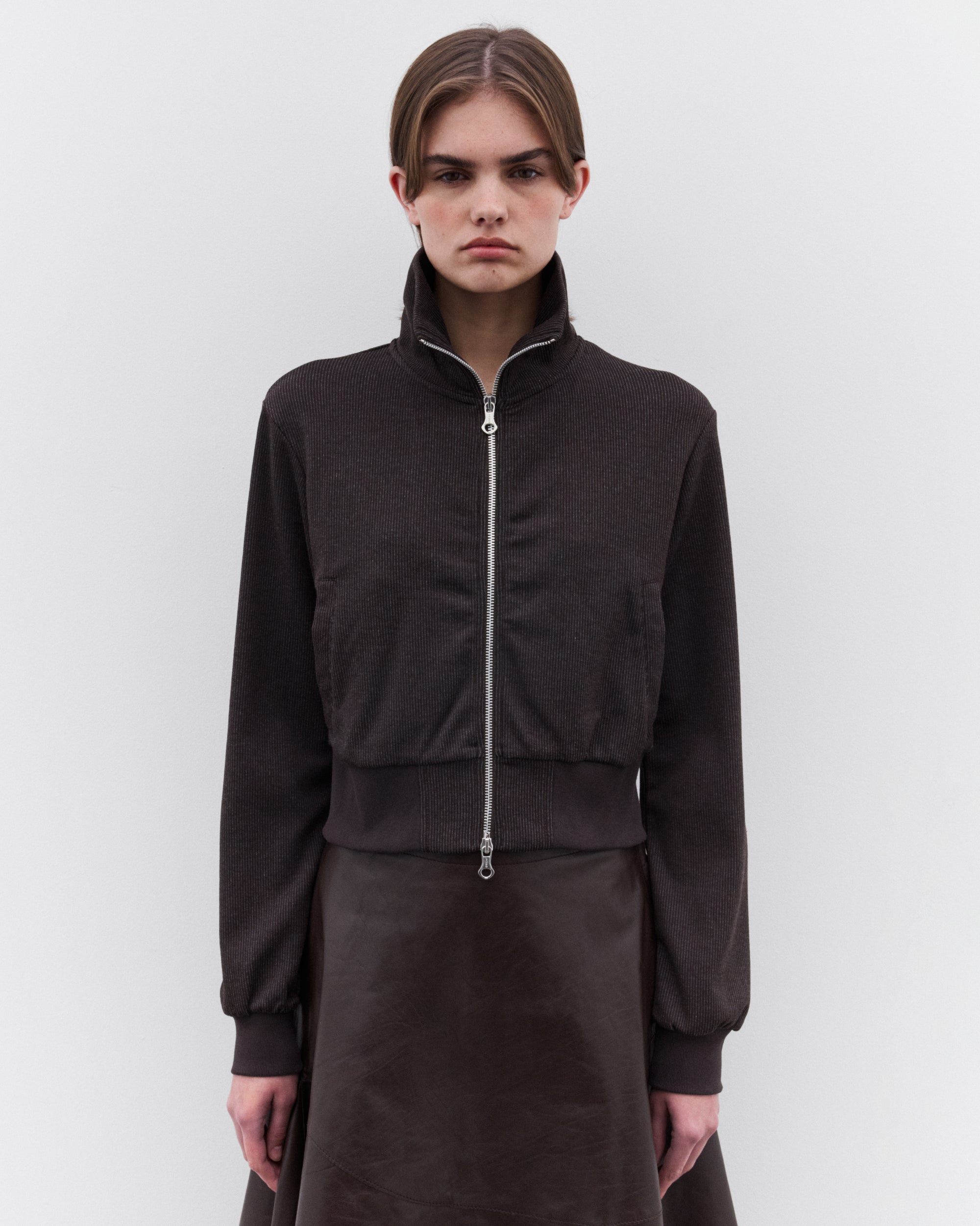 PinstripeLampo two way zipFunnel neck collarRibbed hem and cuffsWelt pocketsCropped, fitted silhouette