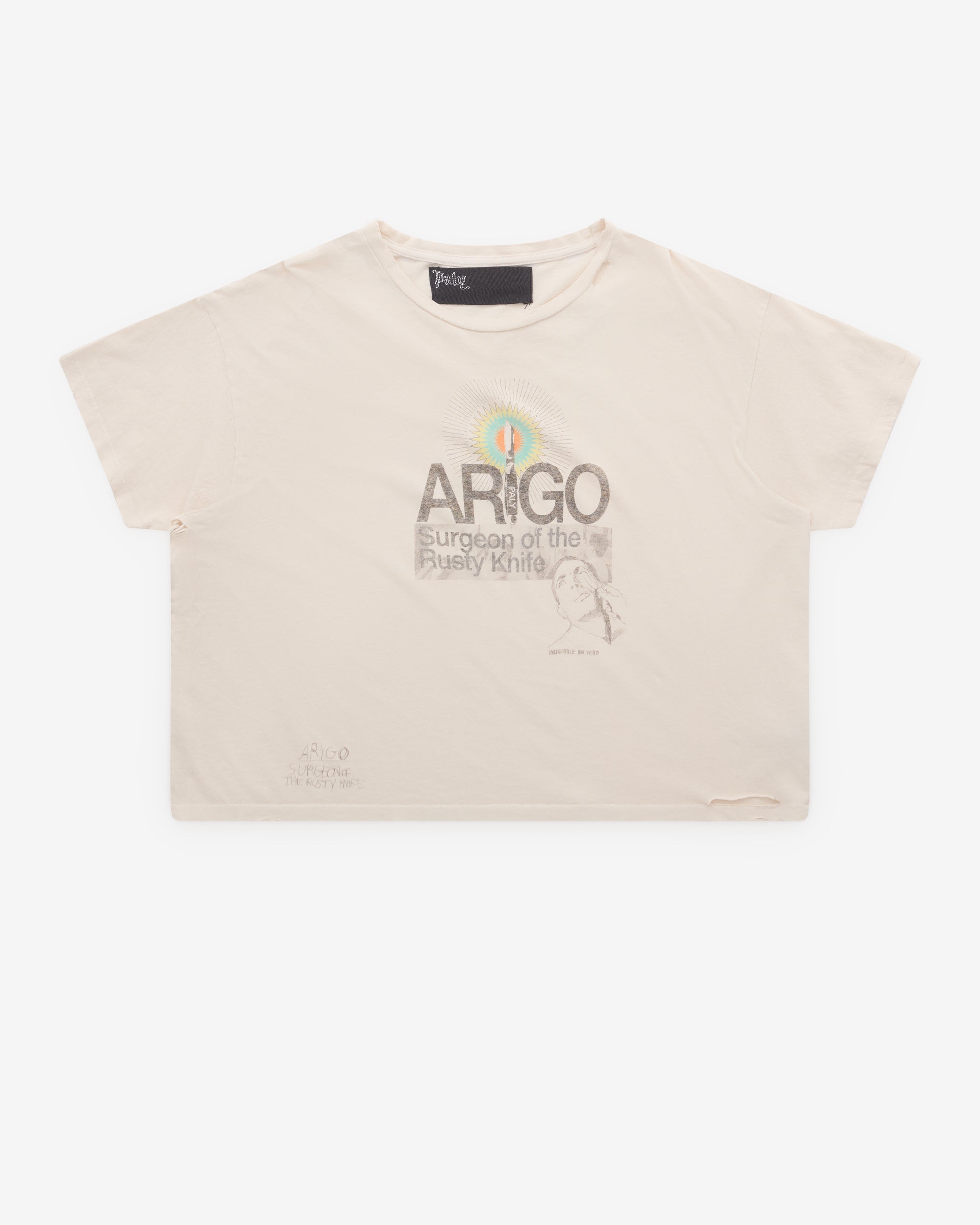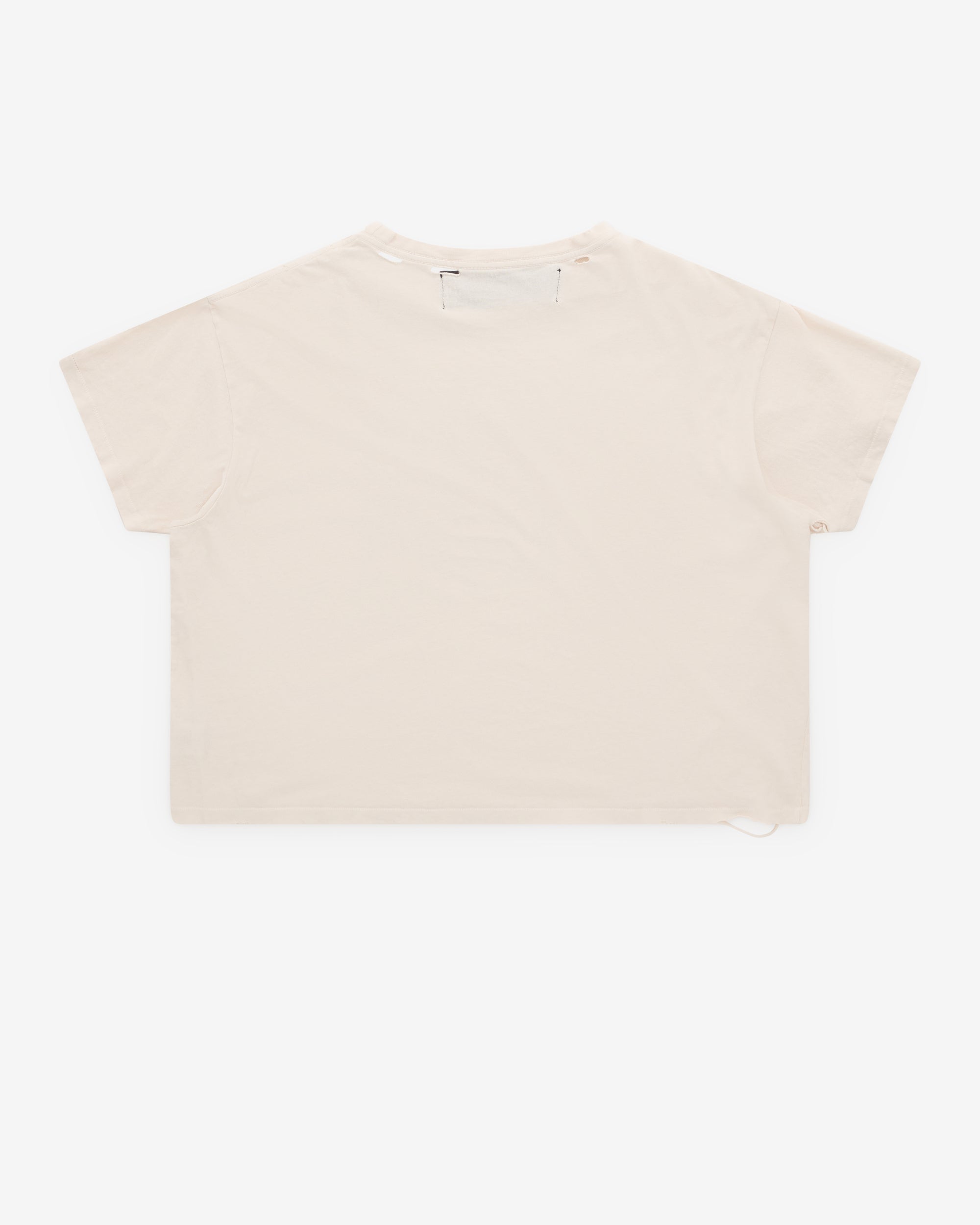 Ribbed crew neckline Printed front graphics Distressed details throughout Boxy fit