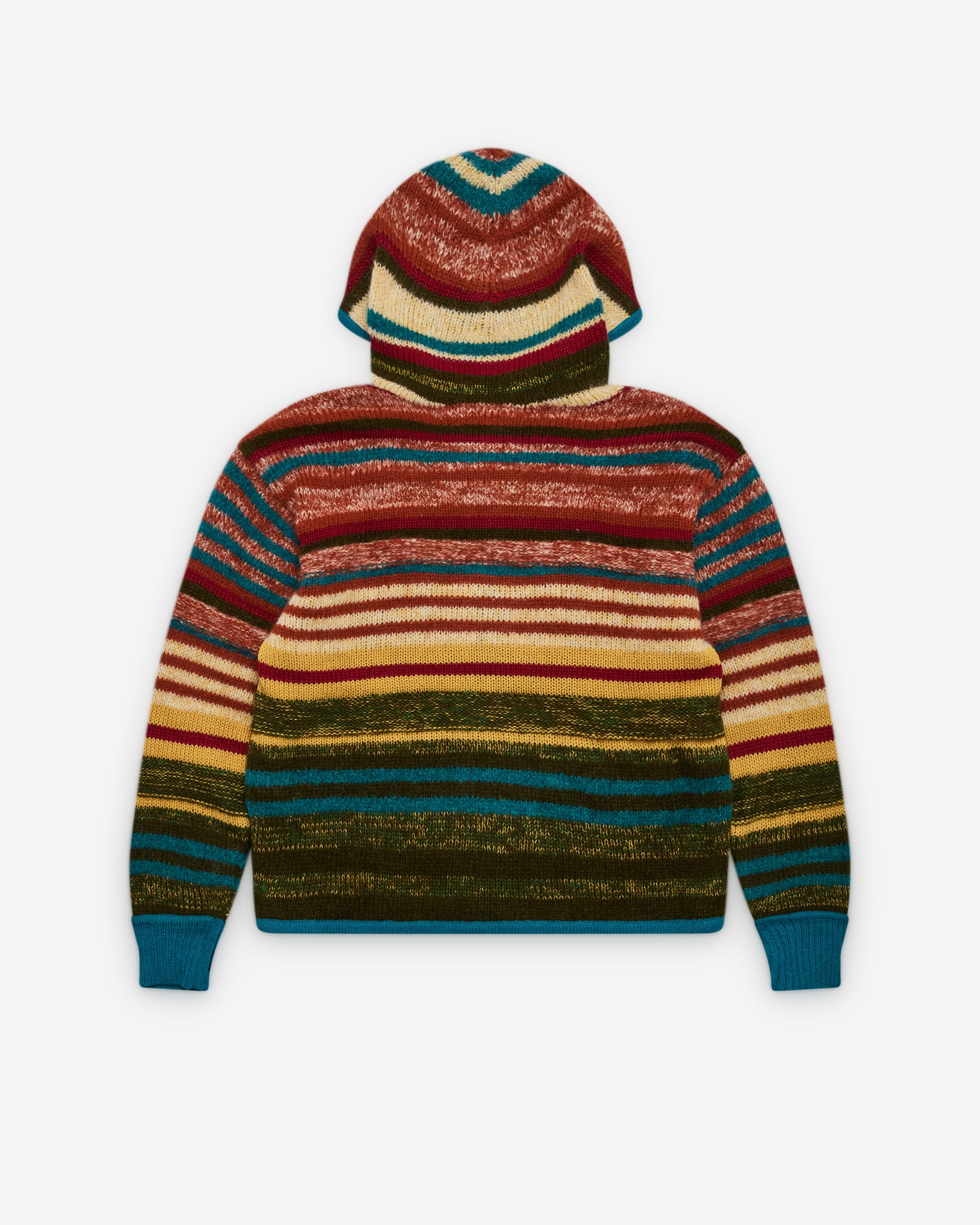 Striped knit fabricContrast trimMetal two way zip closureRibbed cuffsCut out hem
