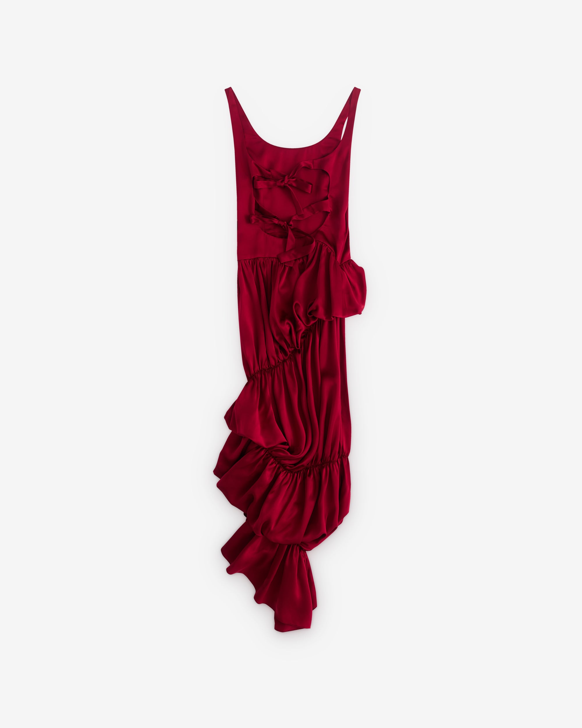 Scoop neckSleevelessGathered, tiered skirtMid-lengthScoop back with tie detail