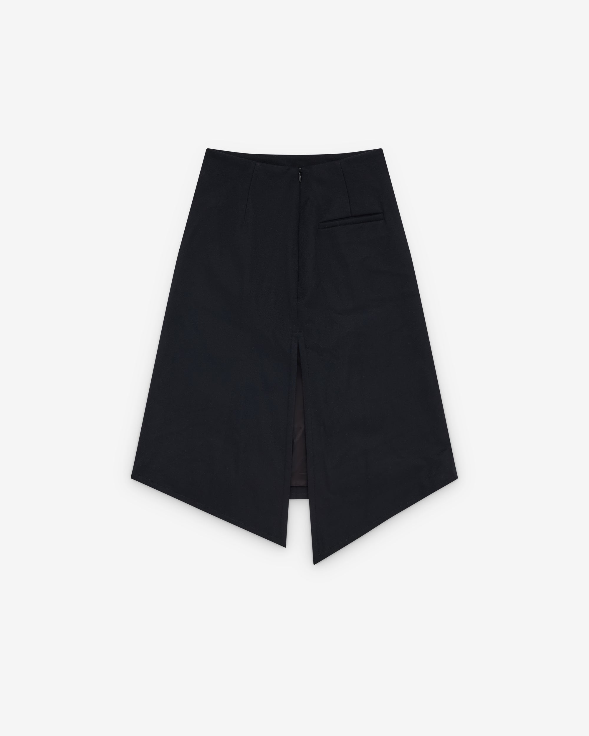 High waistedA-line silhouetteAsymmetric rear hemCentral rear ventRear zip fastening and welt pocketLined100% WoolMade in United Kingdom