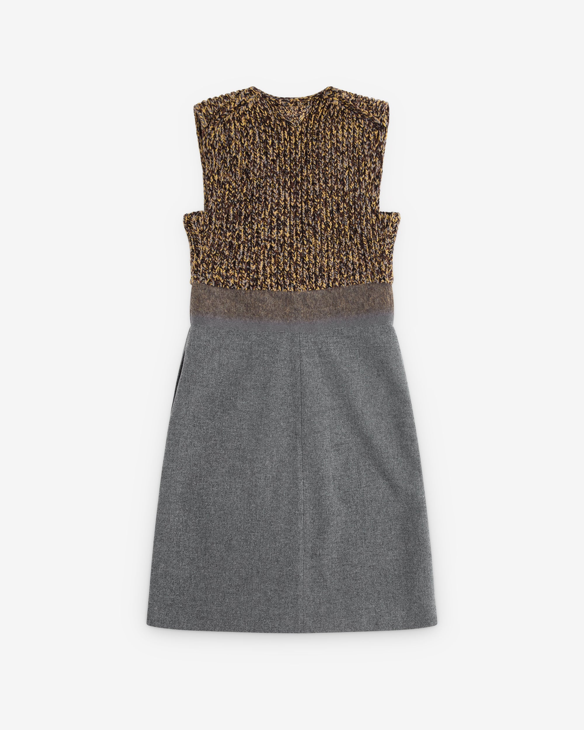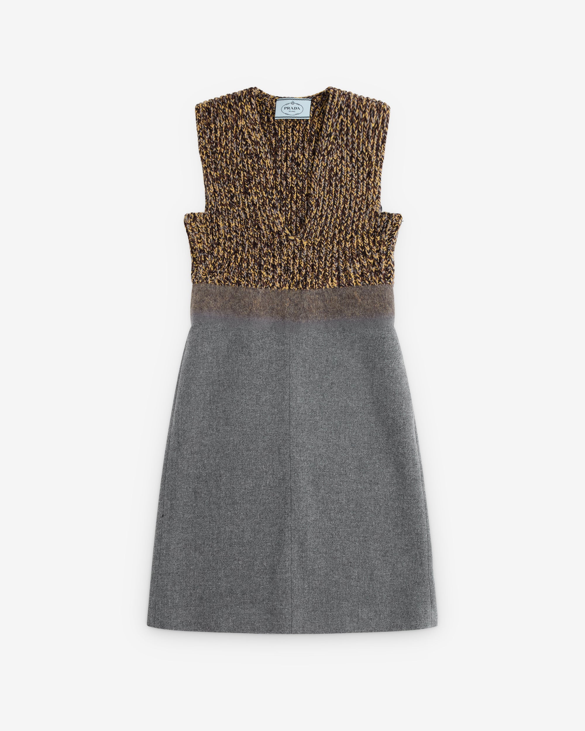 Flared fitLined garmentPlunging V neckSleevelessInseam pocketsFabric triangle logoMid length