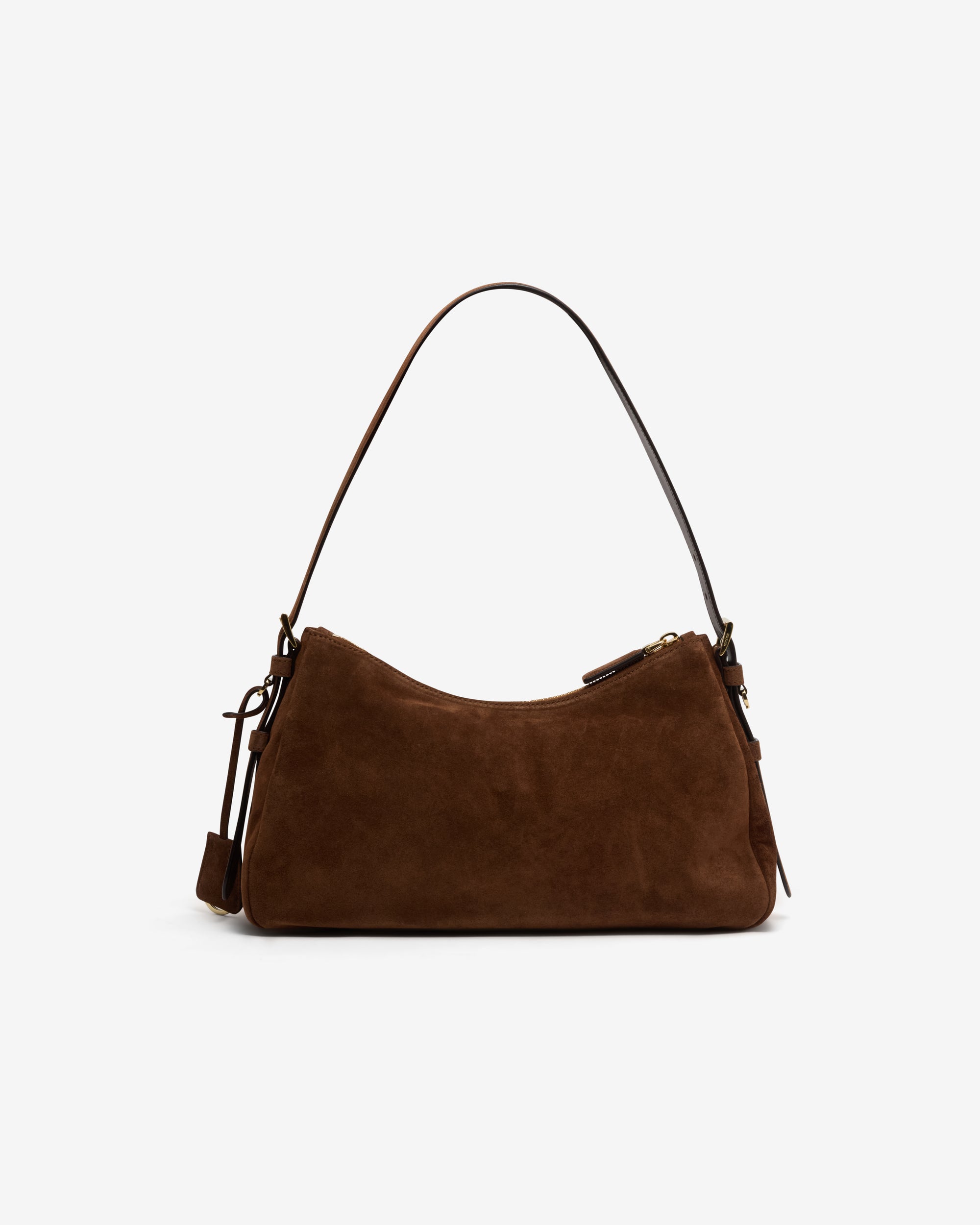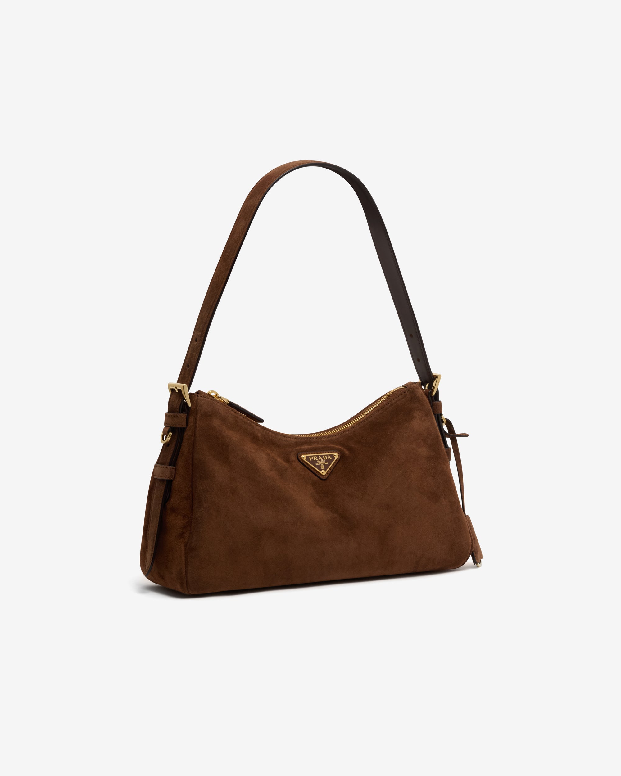 Adjustable leather handle Removable keyring Metal hardware Enamelled metal triangle logo on the front Zipper closure Nappa leather lining with two pockets, including one with zipper Height: 18cm Width: 31cm Length: 10cm