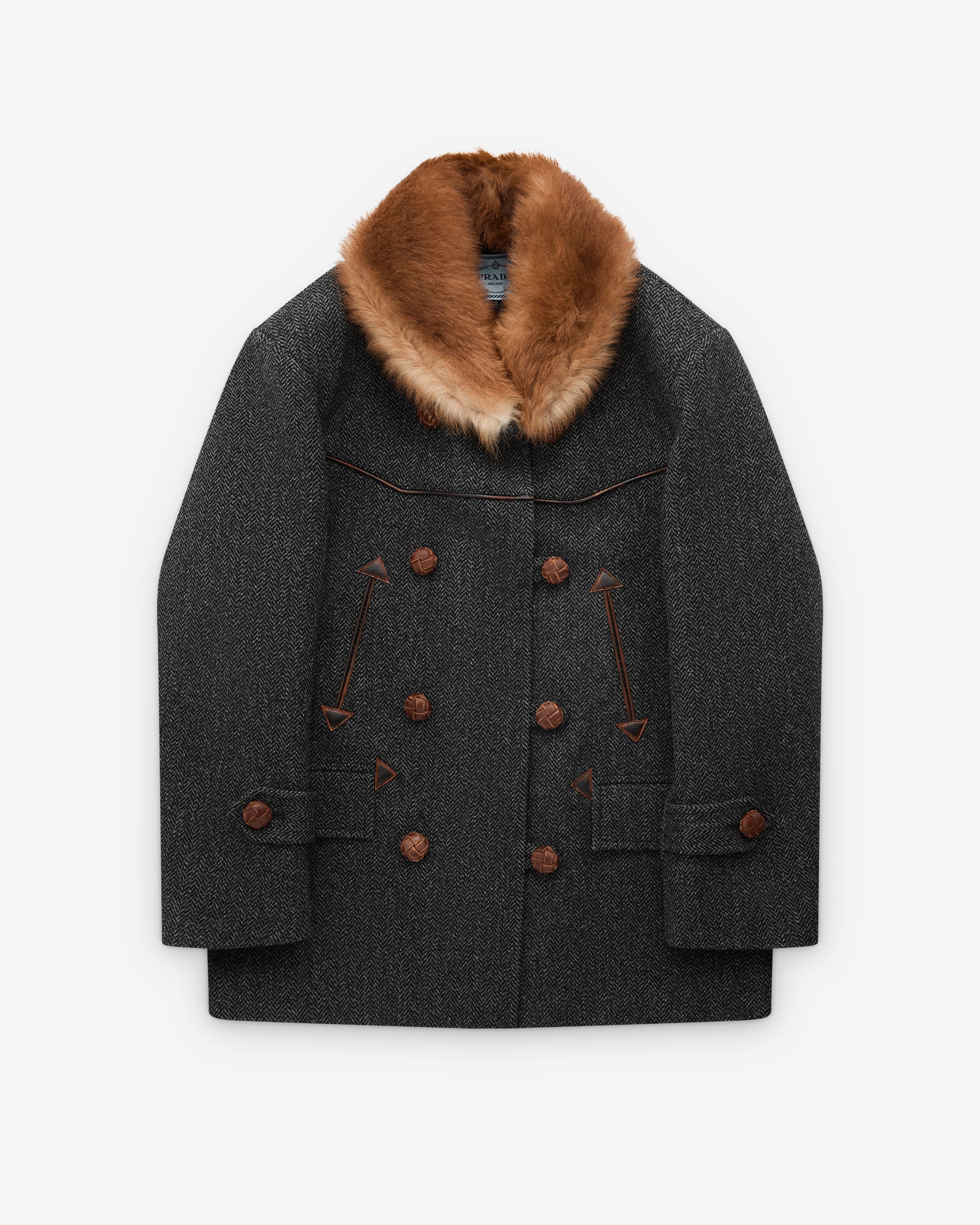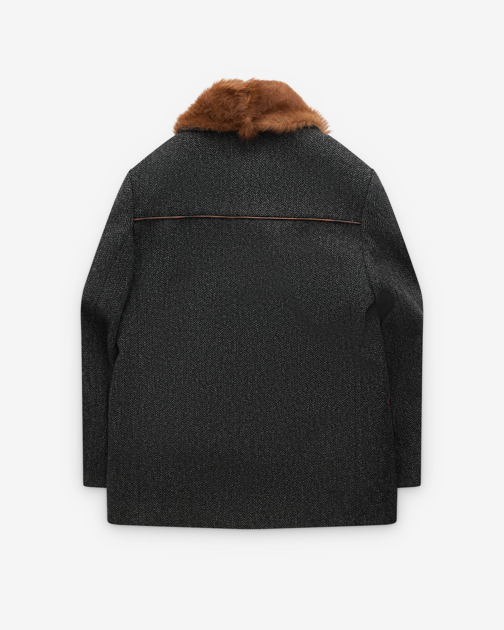 Menswear fitLinedShearling collarWoven button closure at frontSleeves with button strapFlap front pocketsYoke at rearAged leather piping throughout