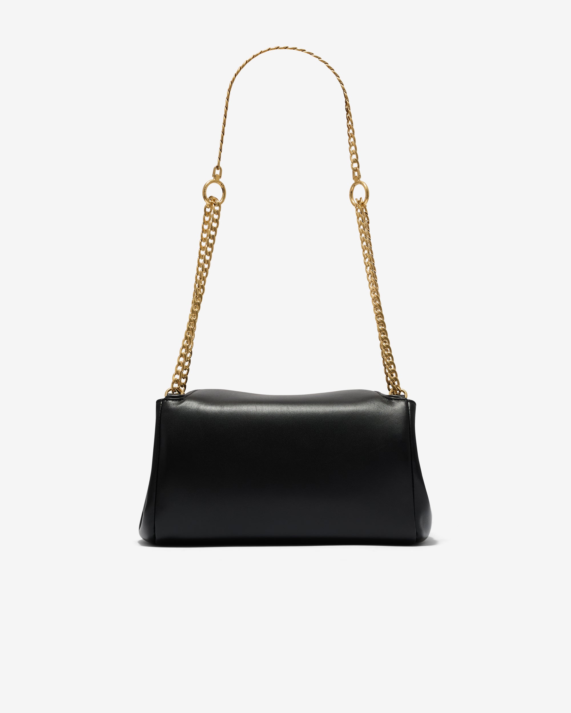 Chain handles Detachable chain shoulder strap, length 40, drop 40 cm Metal hardware Embossed lettering logo on the front Magnetic closure on the flap Nappa leather lining with zipper pocket Height: 13cm Width: 24cm Length: 13cm