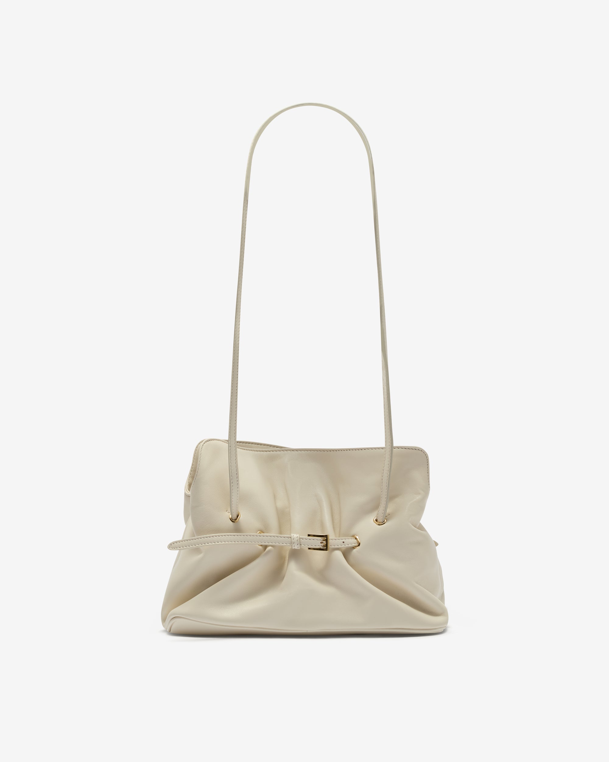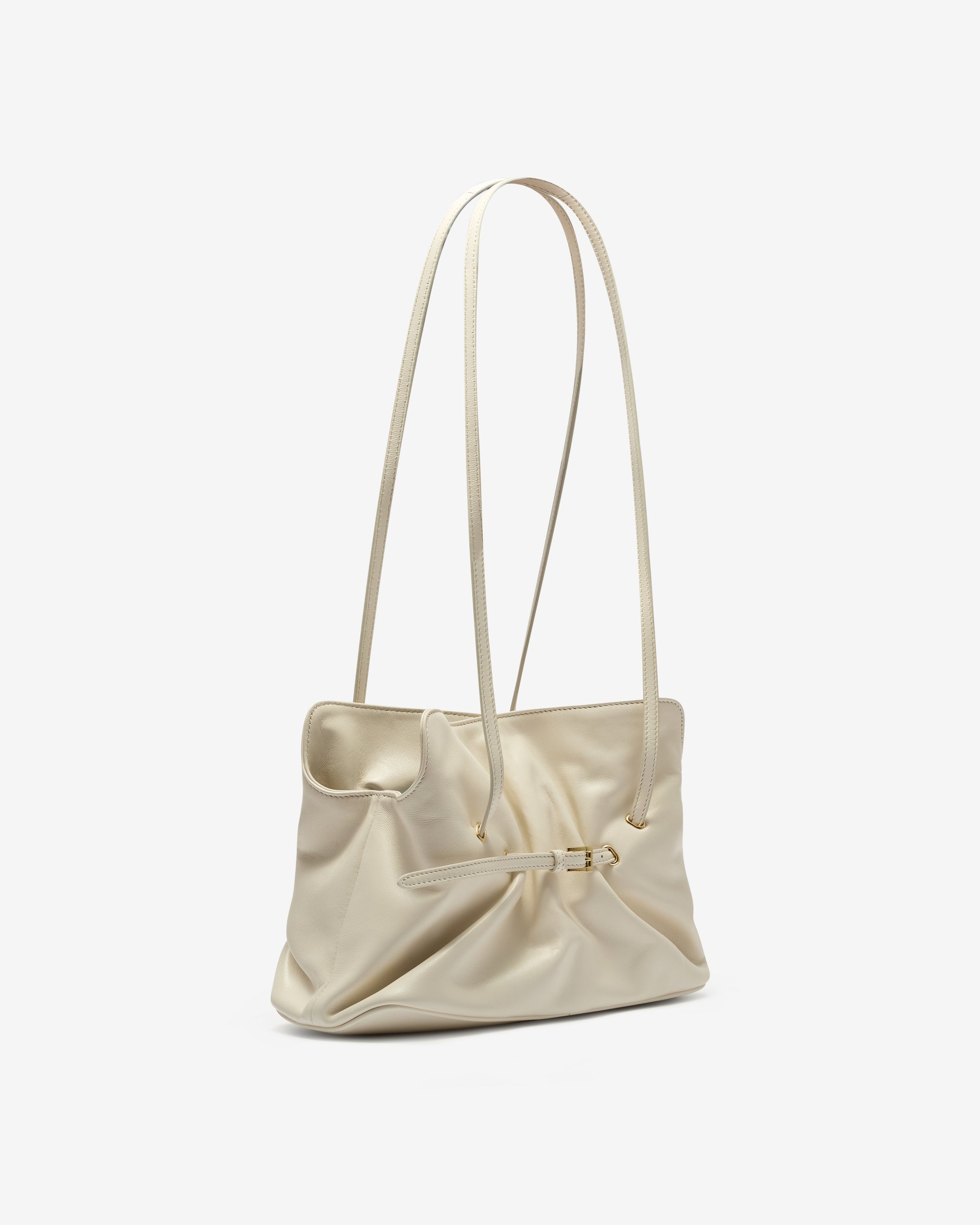 Nappa leather handle, drop 32 cm Metal hardware Embossed lettering logo on the front Magnetic closure Nappa leather lining with center pocket Height: 18.5cm Width: 25cm Length: 11.5cm