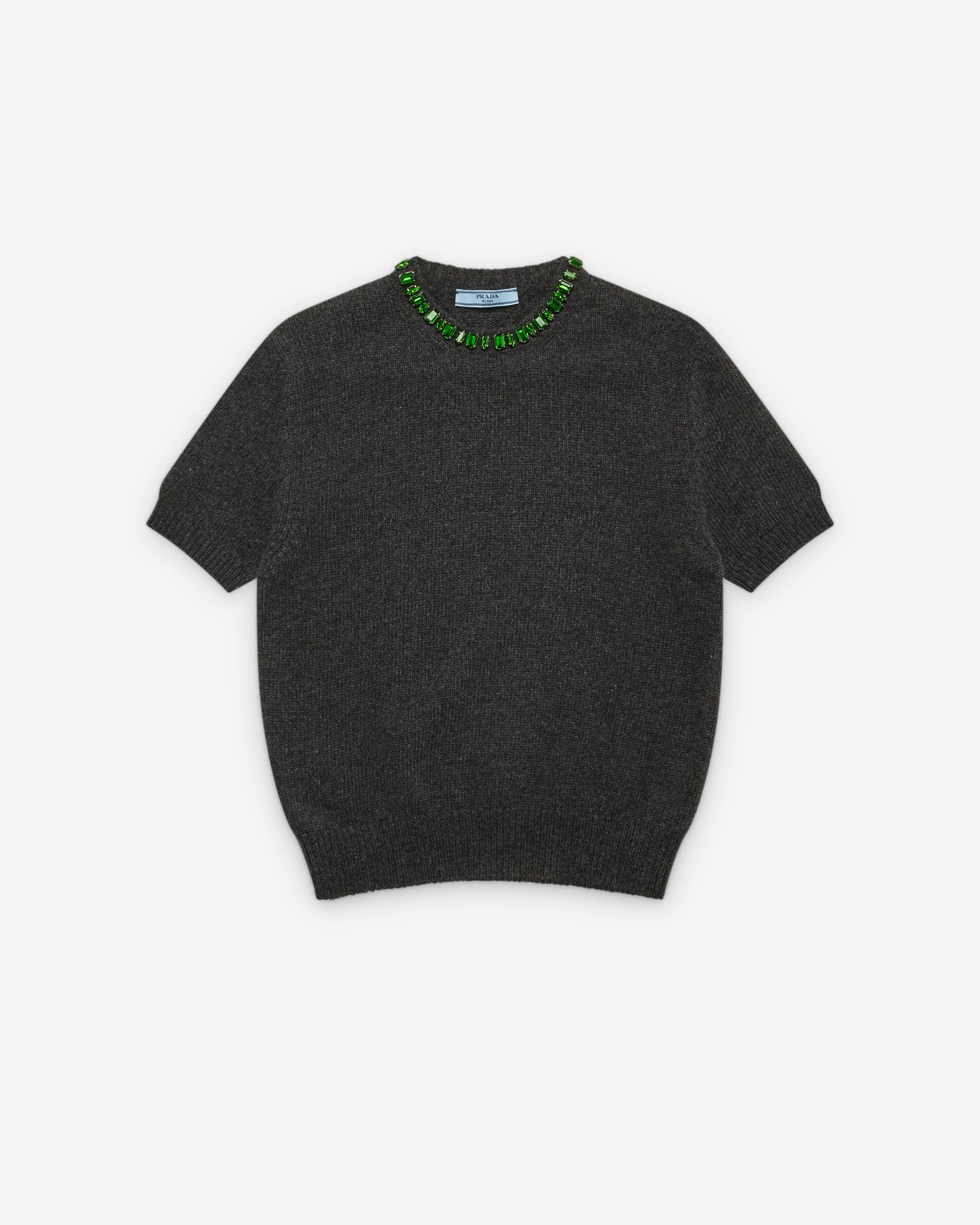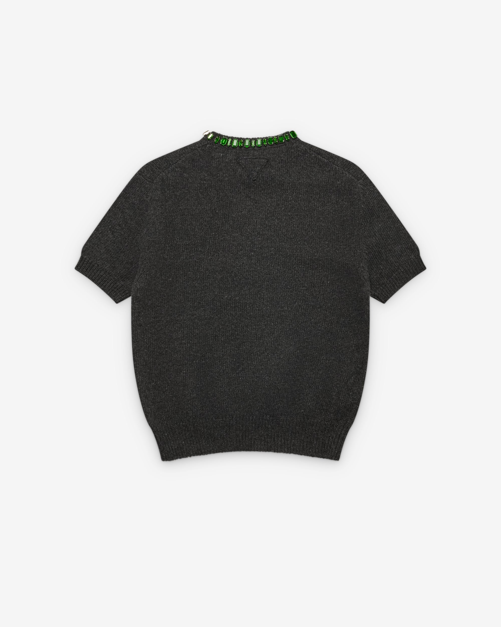 Short sleevesPlain knitMenswear fitRibbed knit neck with appliqued jewel embellishmentSemi-raglan shoulderRibbed knit sleeve trimTriangle logo