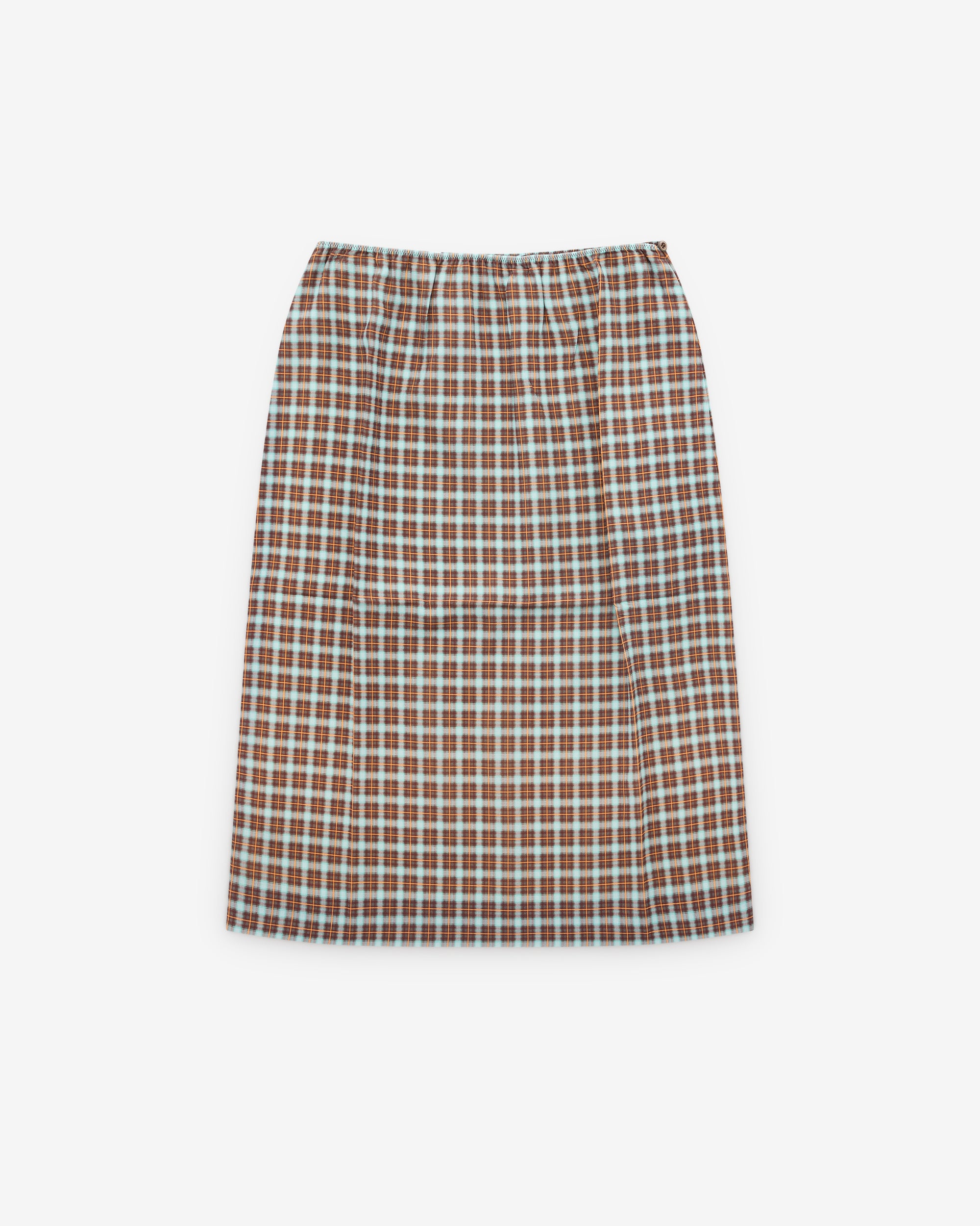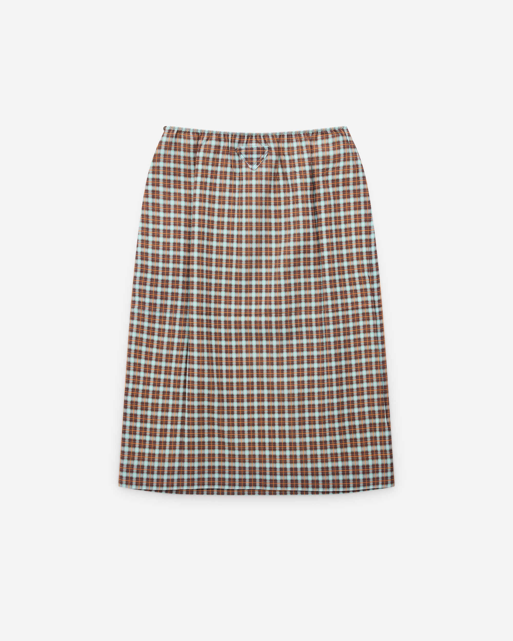 Pencil silhouetteLinedSide snap and button closureFabric triangle logoAll over check pattern