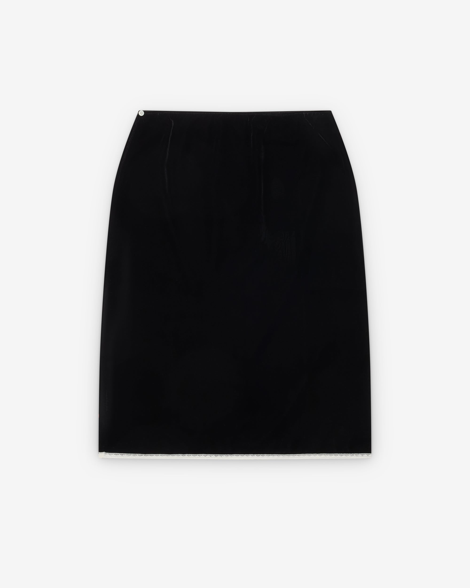 Pencil silhouetteUnlined garmentSide button closureSartorial logo label