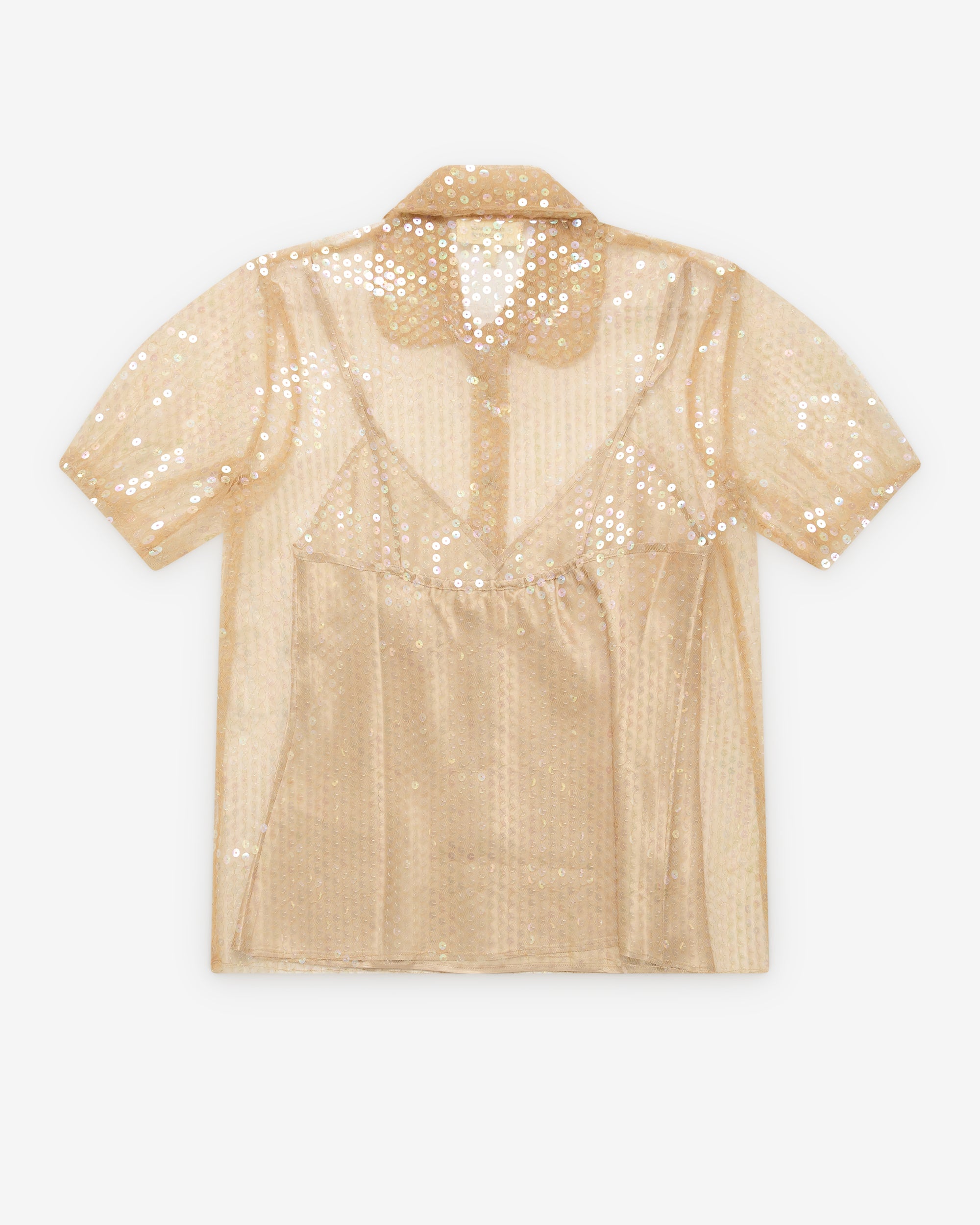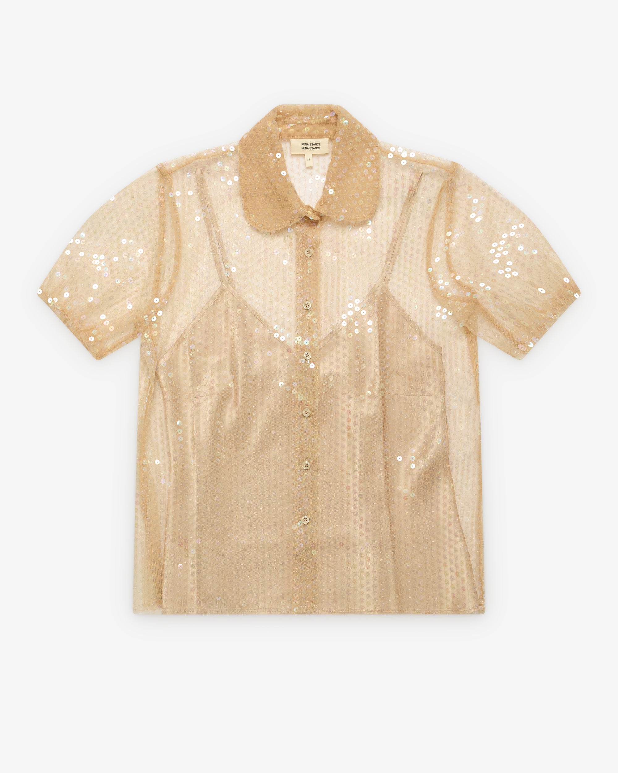 Peter pan collarShort sleevesIntegrated slip tank topSheer sequin fabricButton up closure