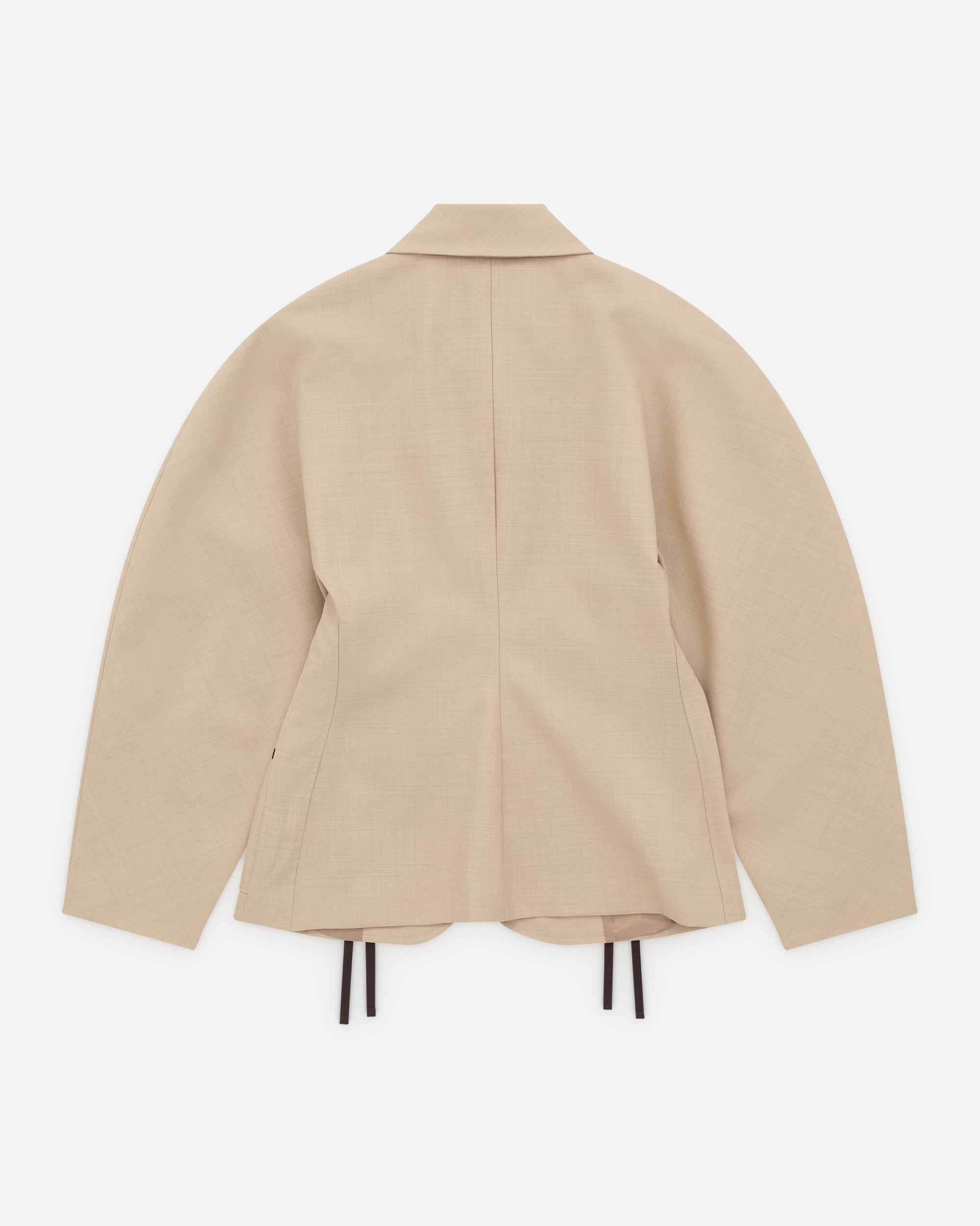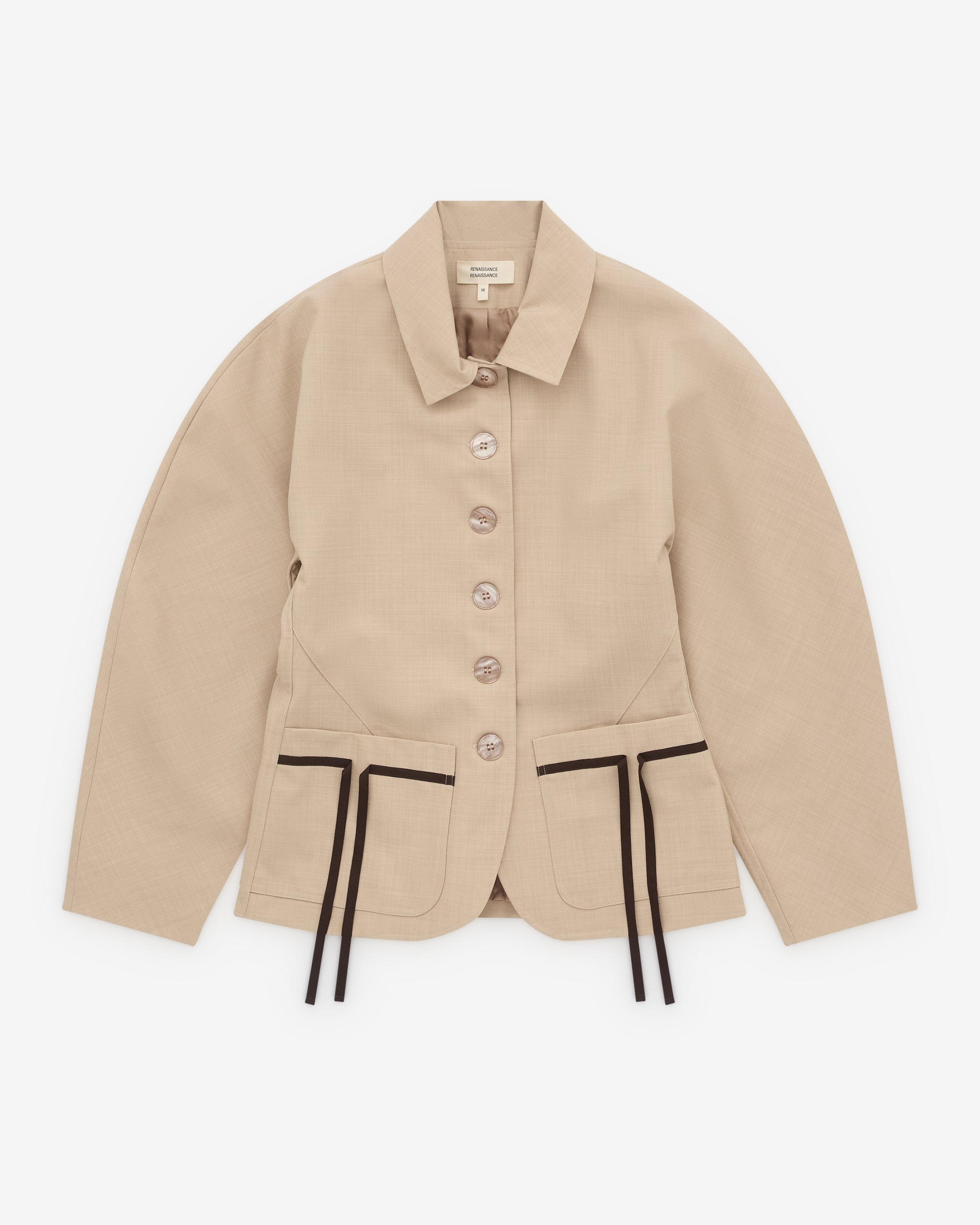 Point collarButton fasteningRounded sleevesPatch pockets with ribbon detailingCinched waistLined100% WoolMade in Lebanon