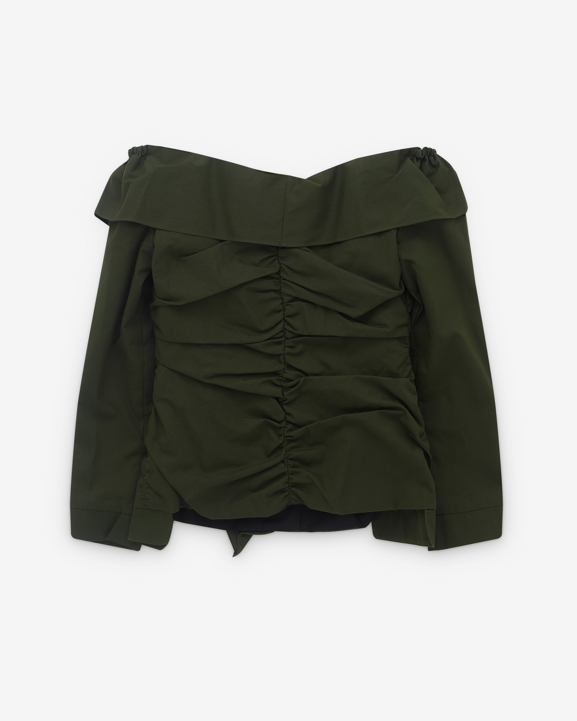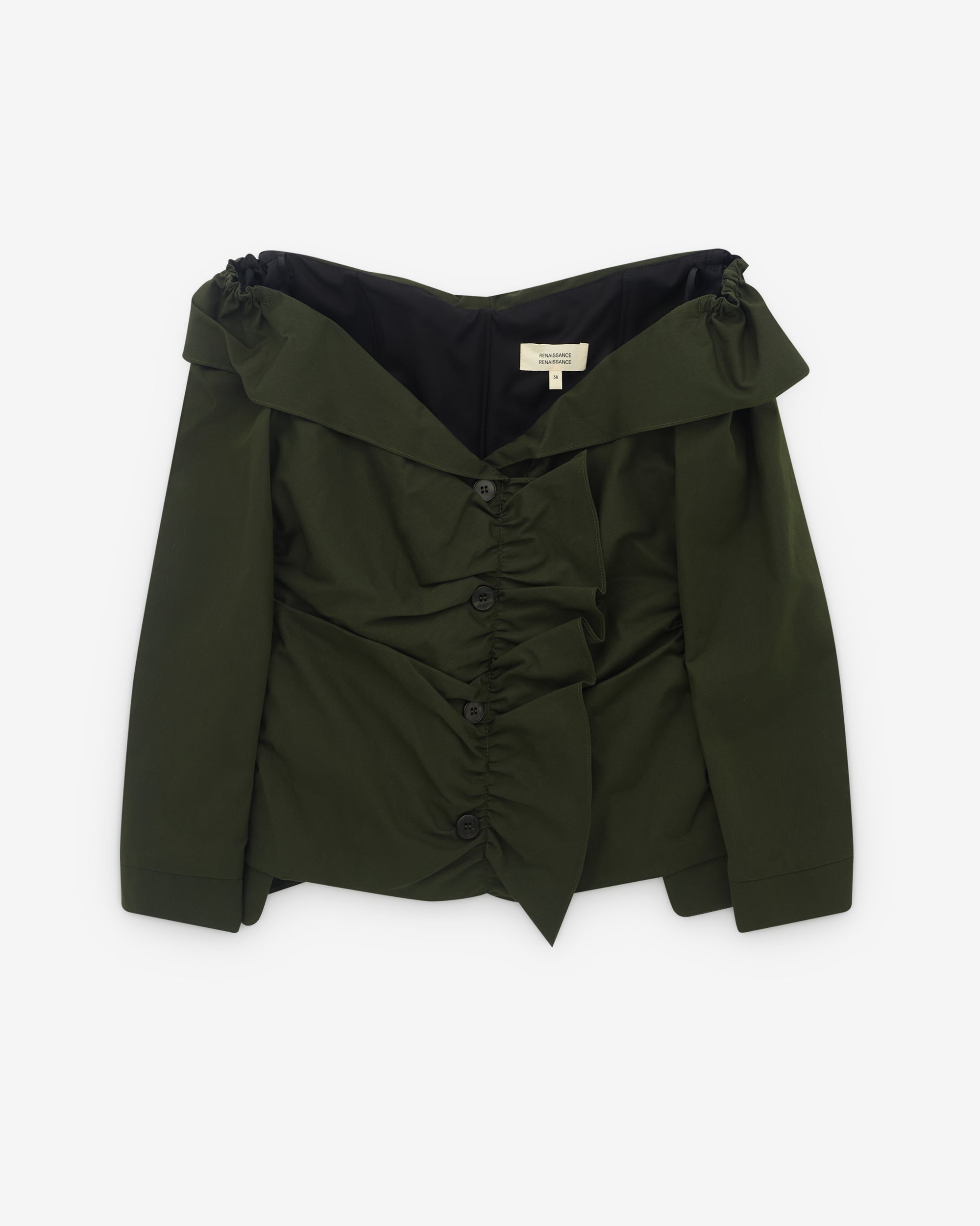 Off shoulderLong sleevesRuffle detail throughoutButton closureRuching at rearCropped, slim fit