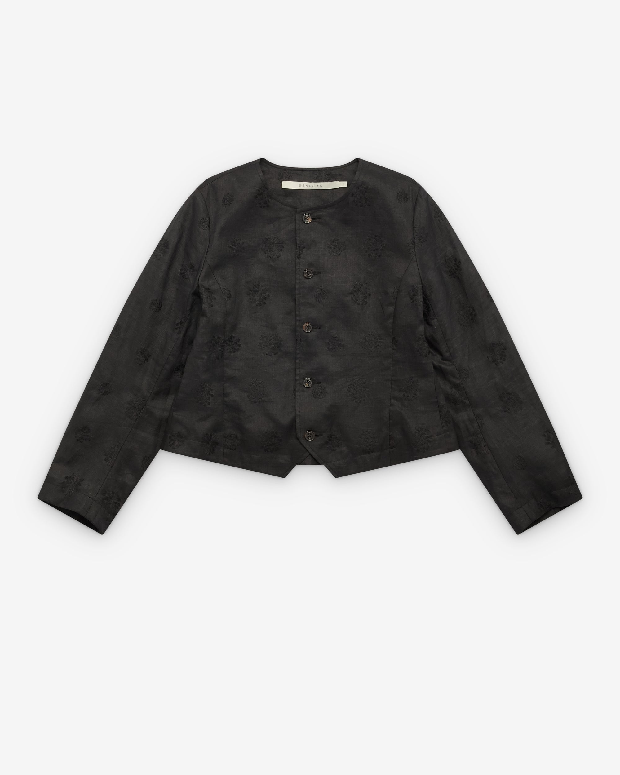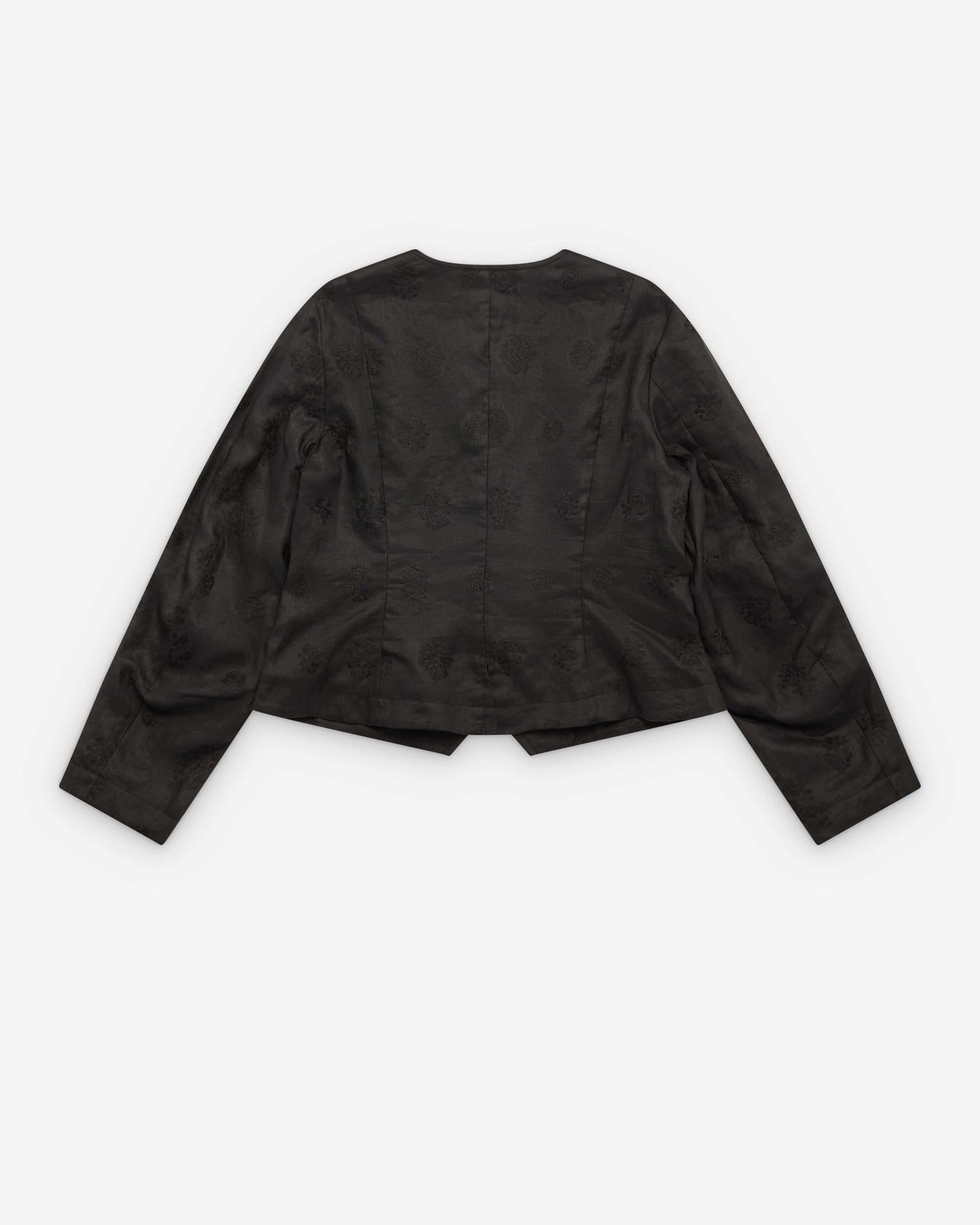 Cropped fit jacketTextured fabricEmbroidered tonal floral motifsRound necklineButton-through frontGathered sleeves