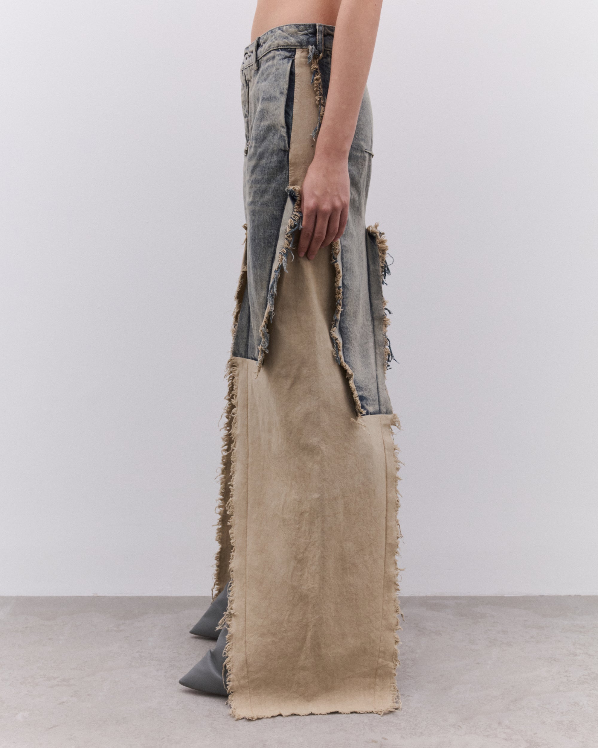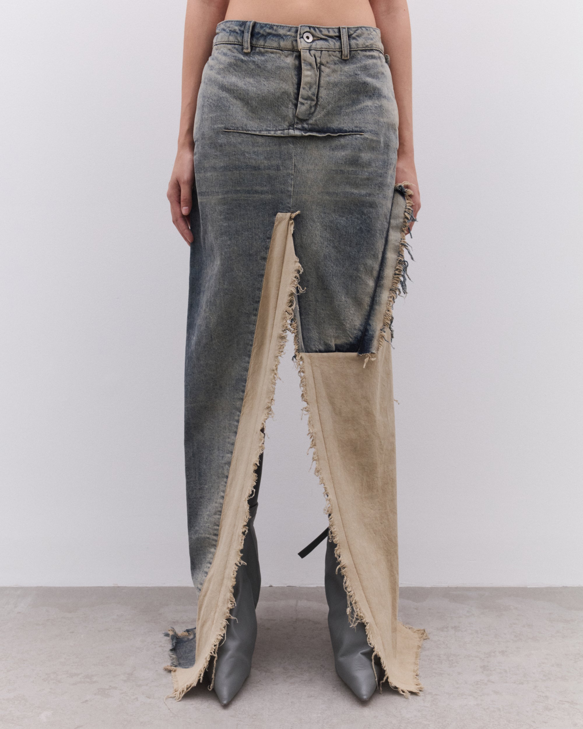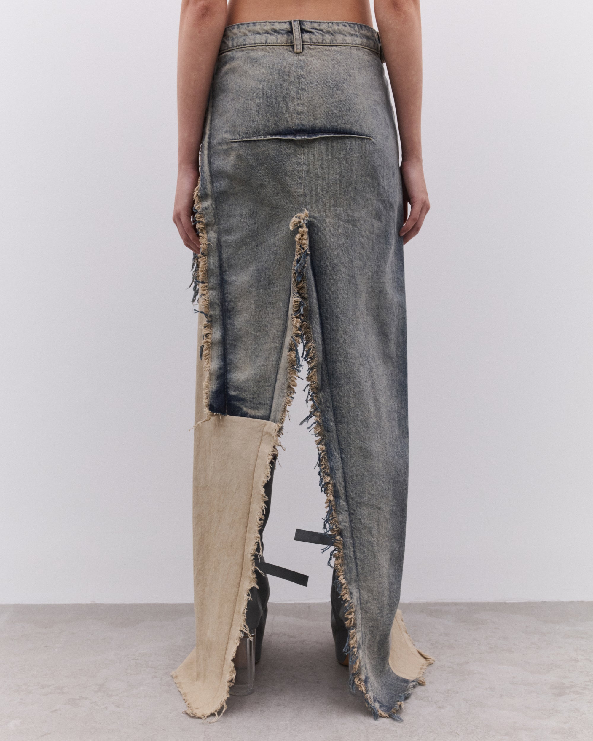 Floor lengthCentre front and rear splitZip and button fasteningRaw hem detailSide seam pocketsBelt loops